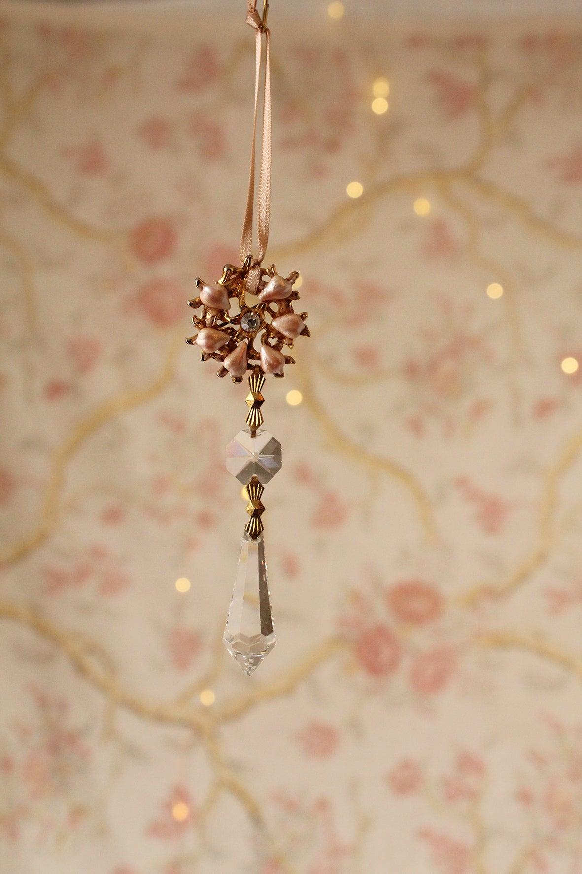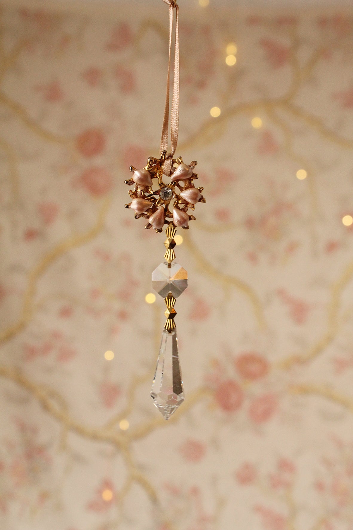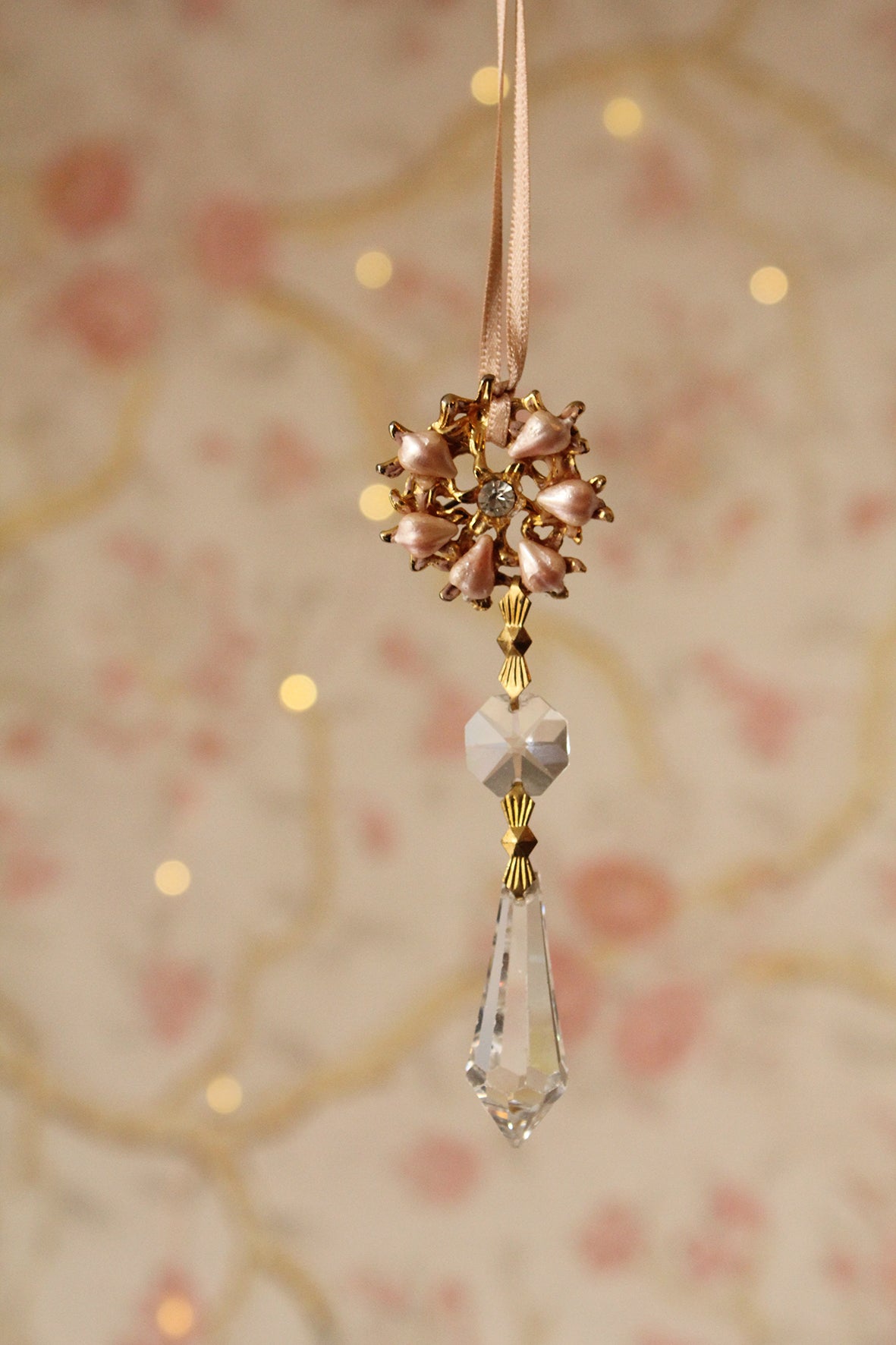 A lovely antique/vintage decoration dressed with a vintage brooch, a chandelier drop and a double satin ribbon as the hanger. Simply hang on a door handle of your armoire, from the wall, the corner of a painting, a garland, a wreath, a gift or simply place on your tree.