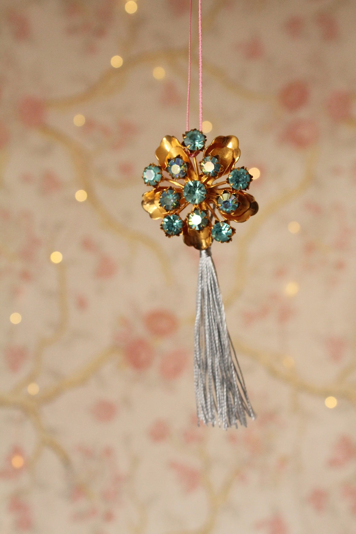 A lovely antique/vintage decoration dressed with a vintage brooch, a tassel and a double satin ribbon as the hanger. Simply hang on a door handle of your armoire, from the wall, the corner of a painting, a garland, a wreath, a gift or simply place on your tree.