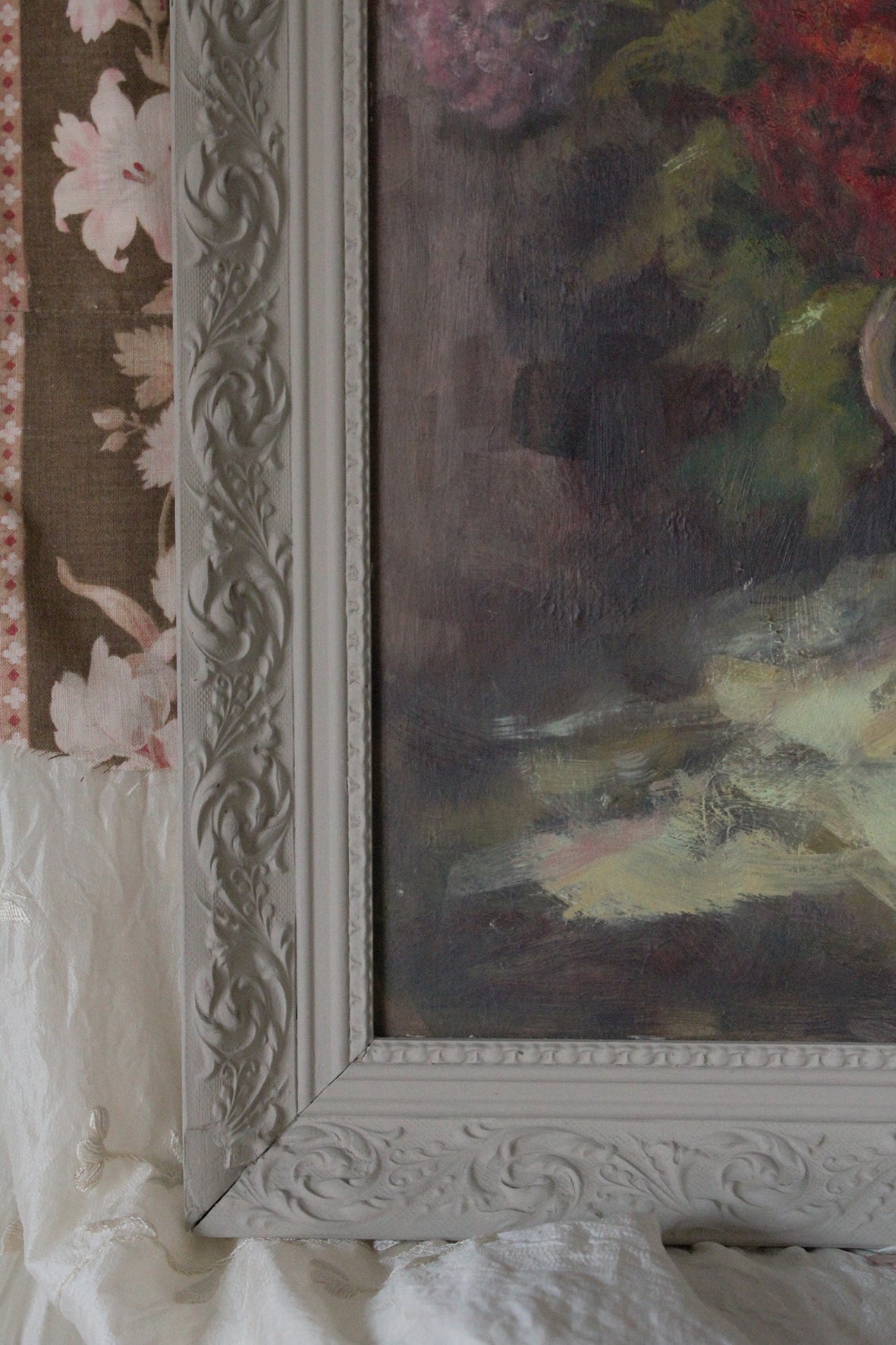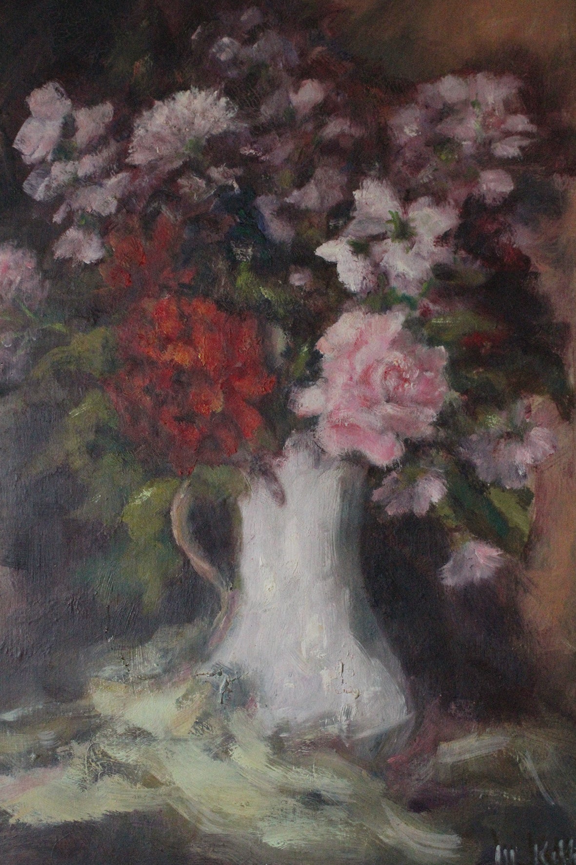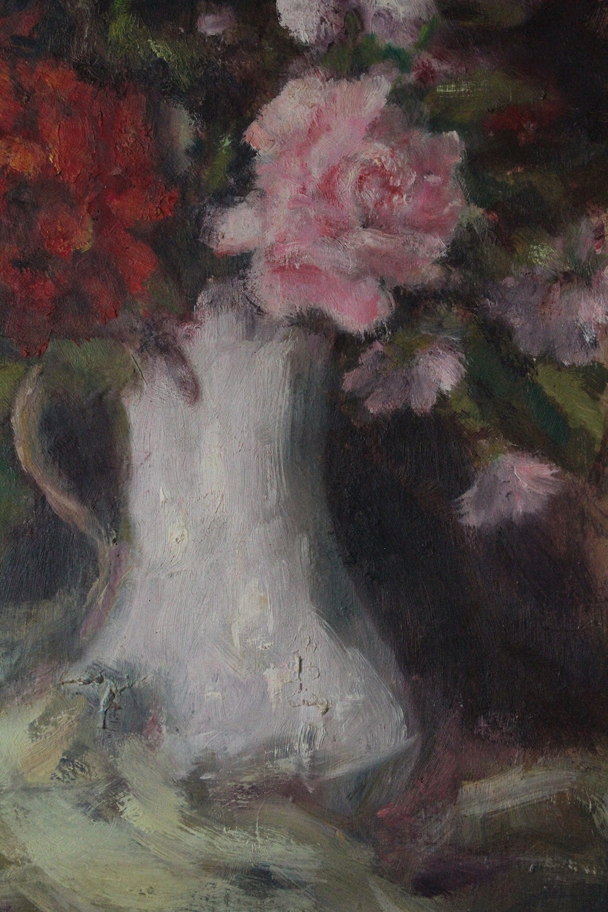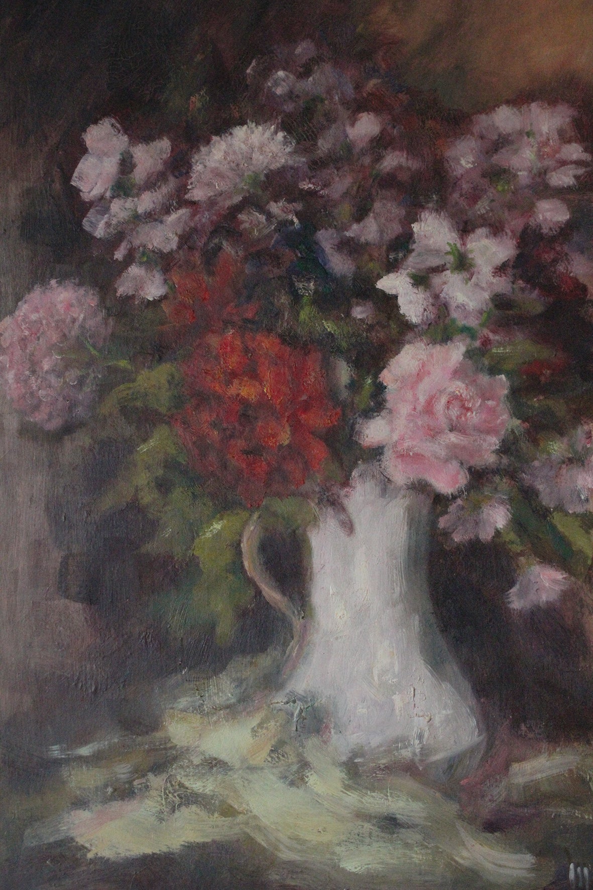 A very beautiful floral still life oil painting that is delicate in tone. An array of varied pinks and mauves sit on a ground that moves from a dark mauve through to a pale cinnamon. An exquisite palette. Expressional but gentle.