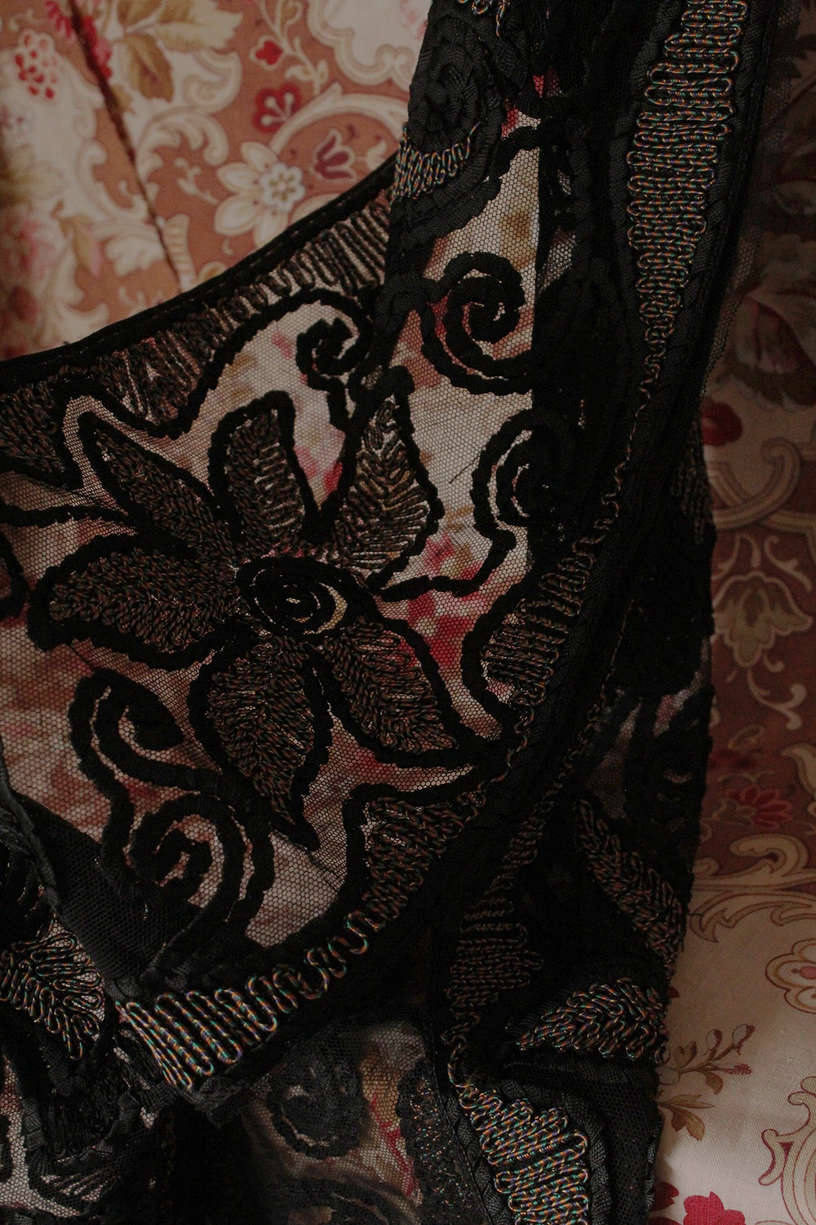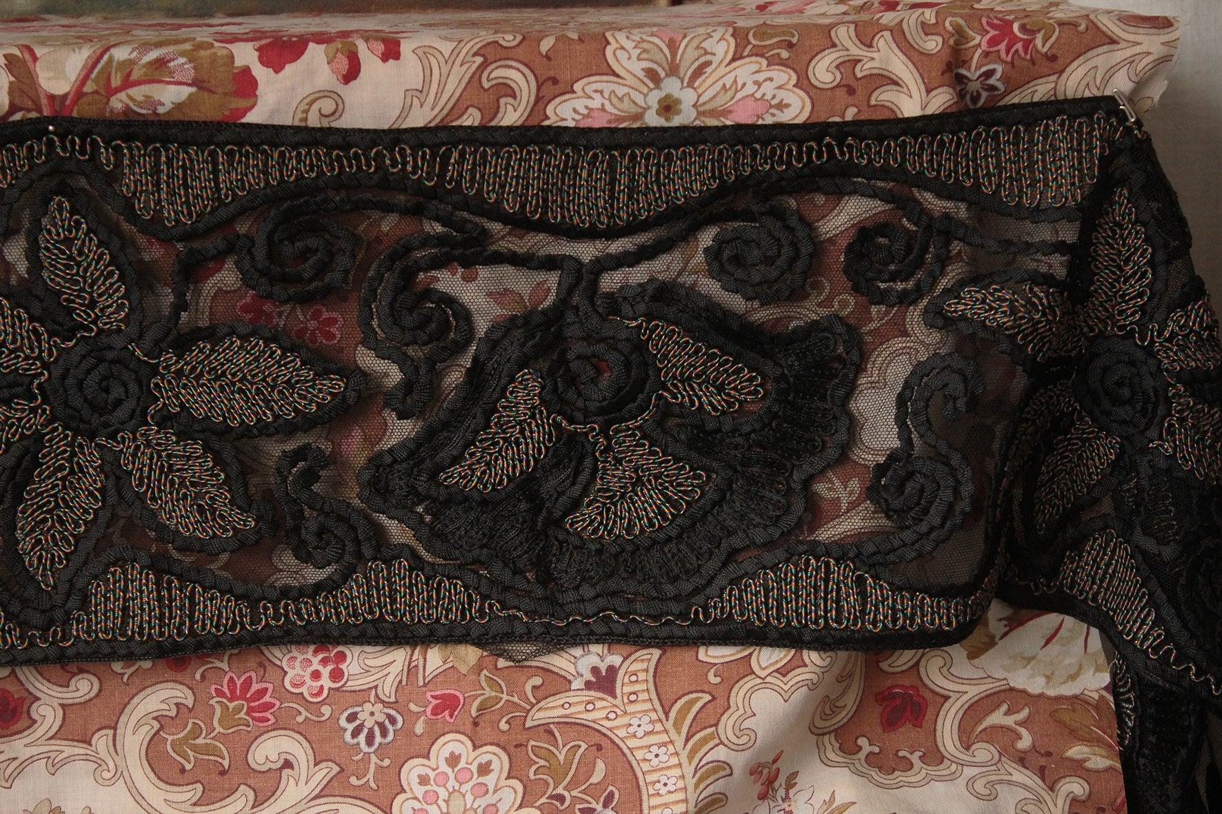 A detailed wide Art Deco border that has a mesh base and detailed with ribbon embroidery and couch stitch embroidery.