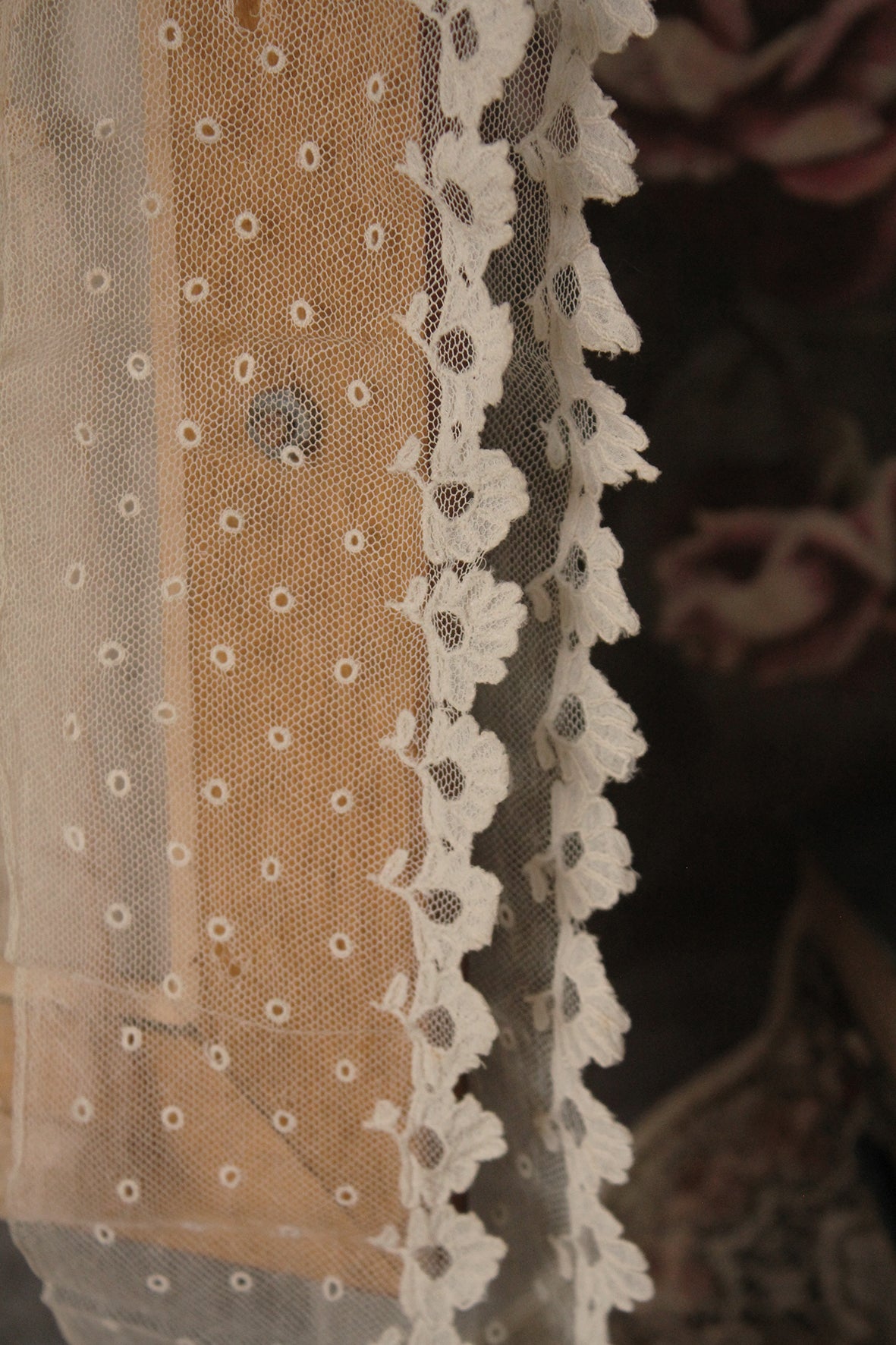 A reclaimed lace edging, possibly bridal. The leaves are a such a gorgeous motif all in a row. The netting has open circles with stitching around each.