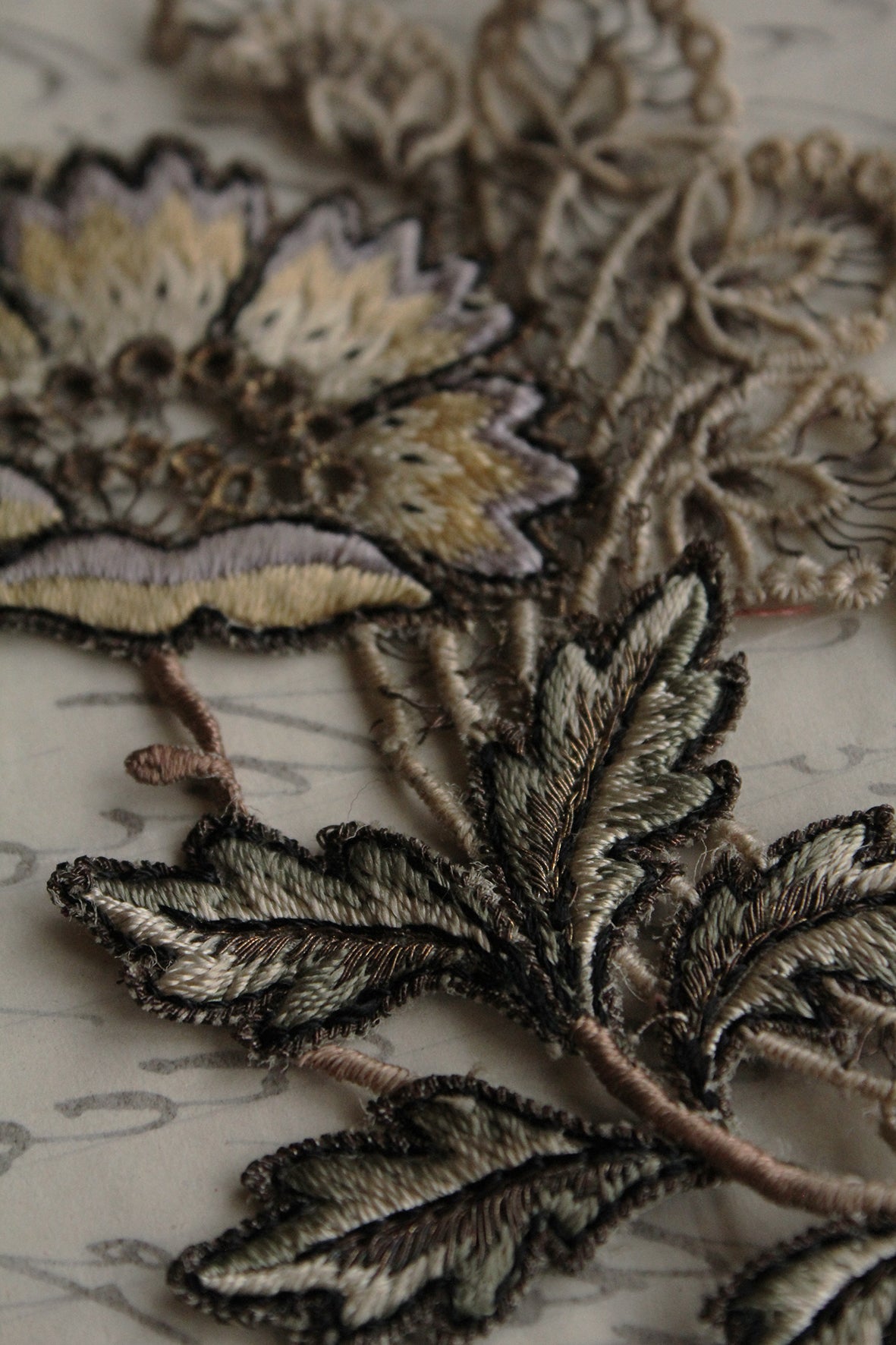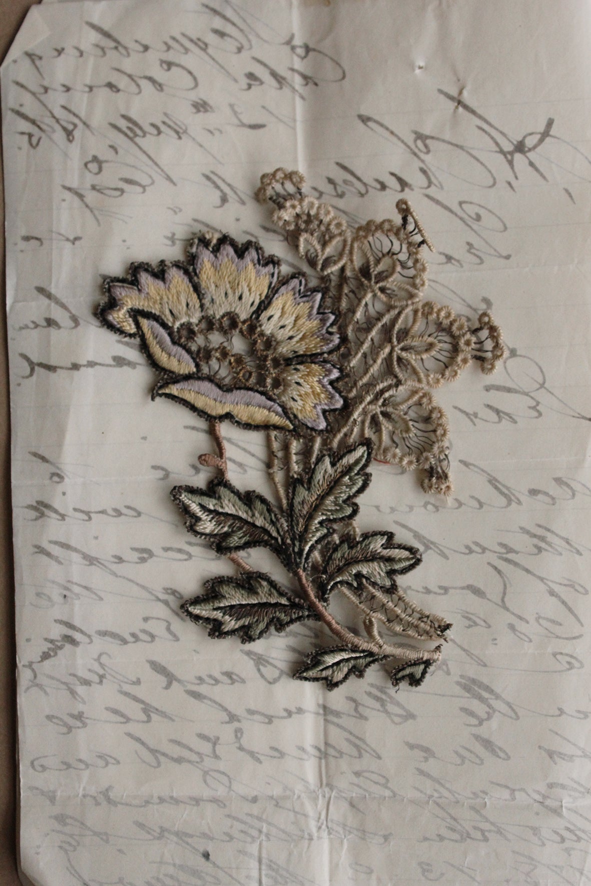 A rare embroidered stylist flower and flower buds, An applique that would have adorned a dress or gown, even a velvet coat for its time. The flower buds appear to be in a Schiffli style. Produced in the early 1900's.