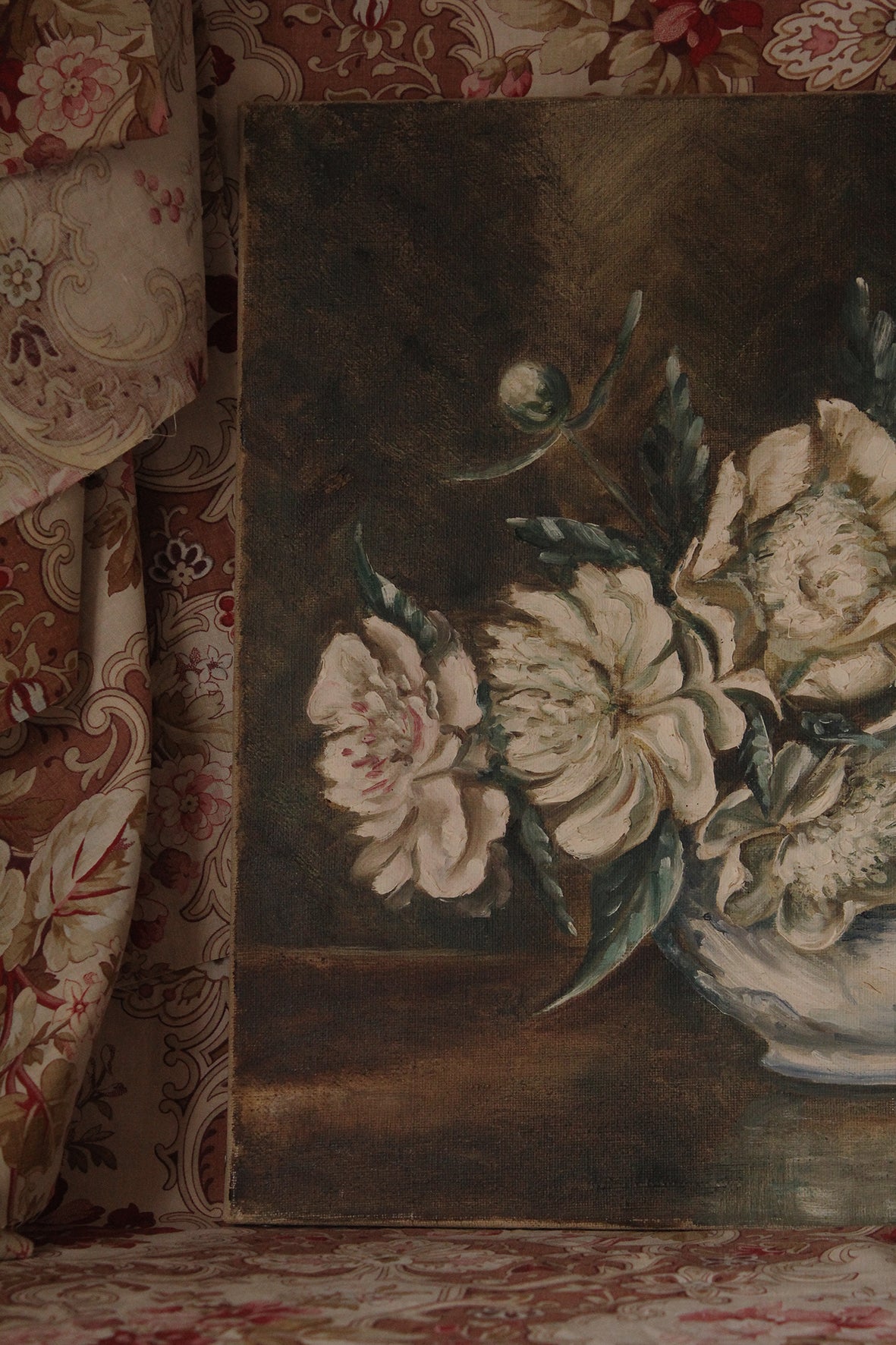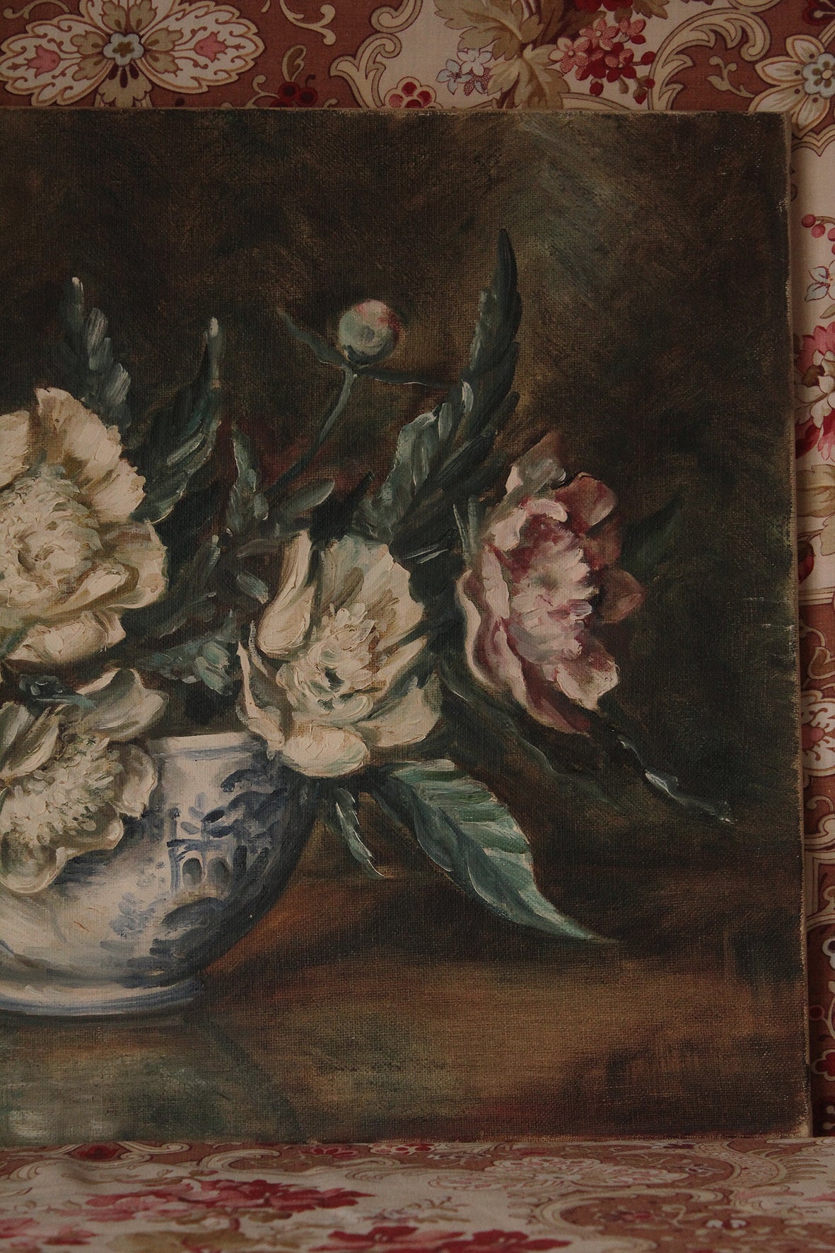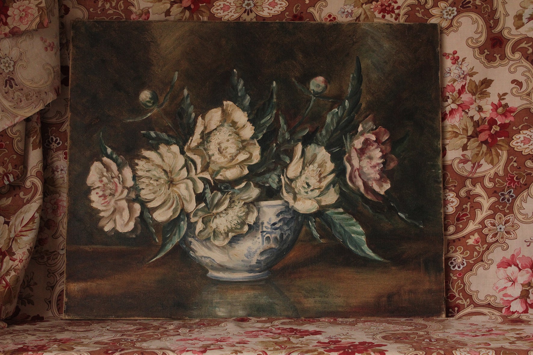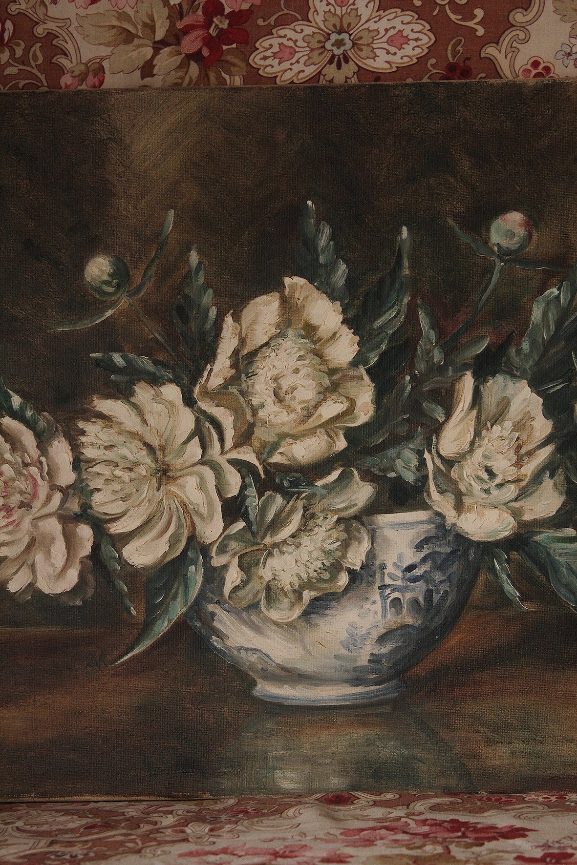 A gorgeous old French floral oil painting in an impressionistic style. Appears to be peonies in a lovely blue and white transfer bowl. It has been a delight to have this canvas stay here a while.