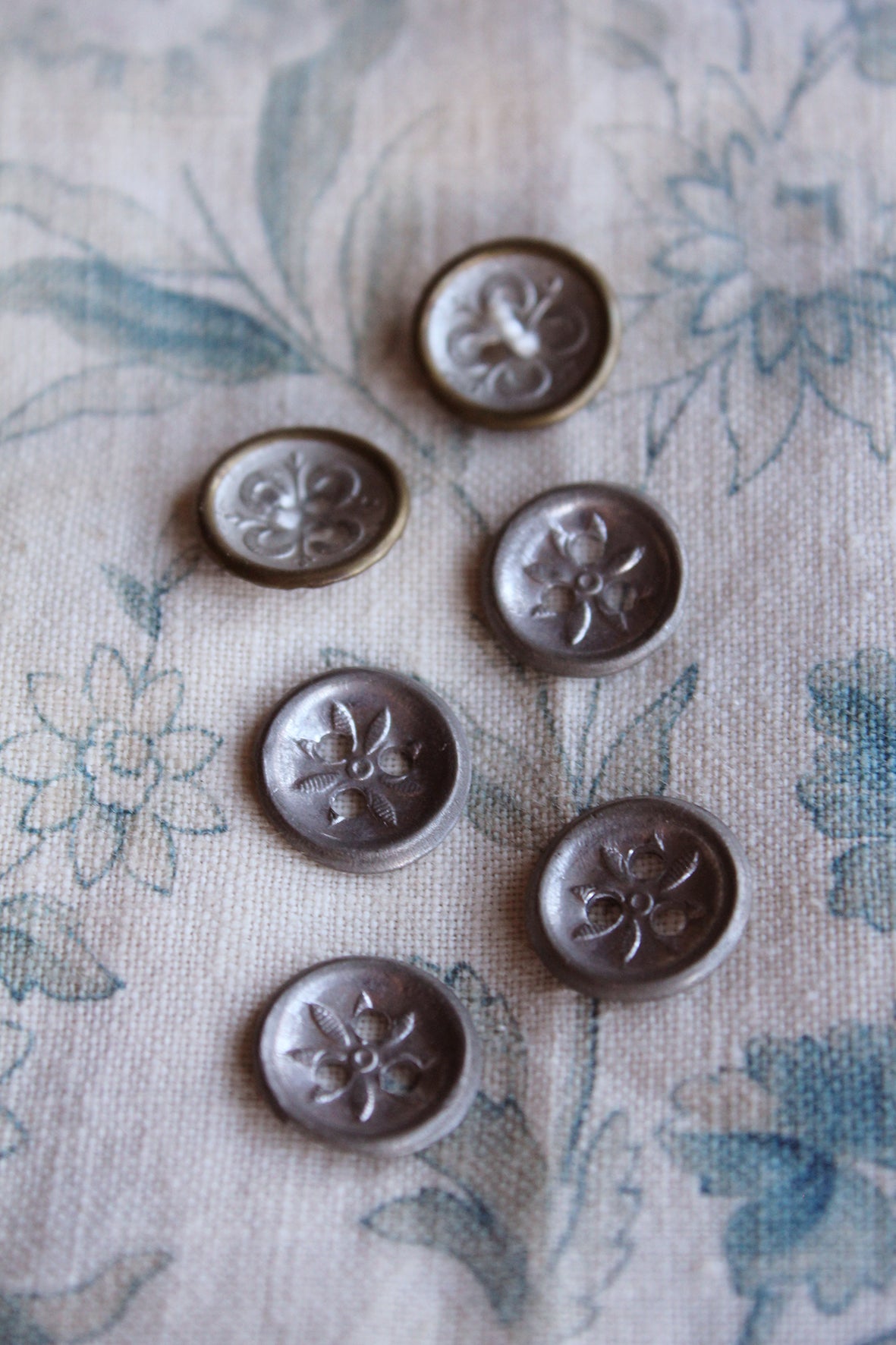 A collection of detailed pressed metal and brass buttons with flowers to the centre.