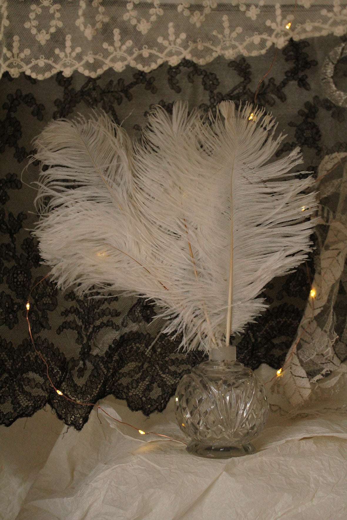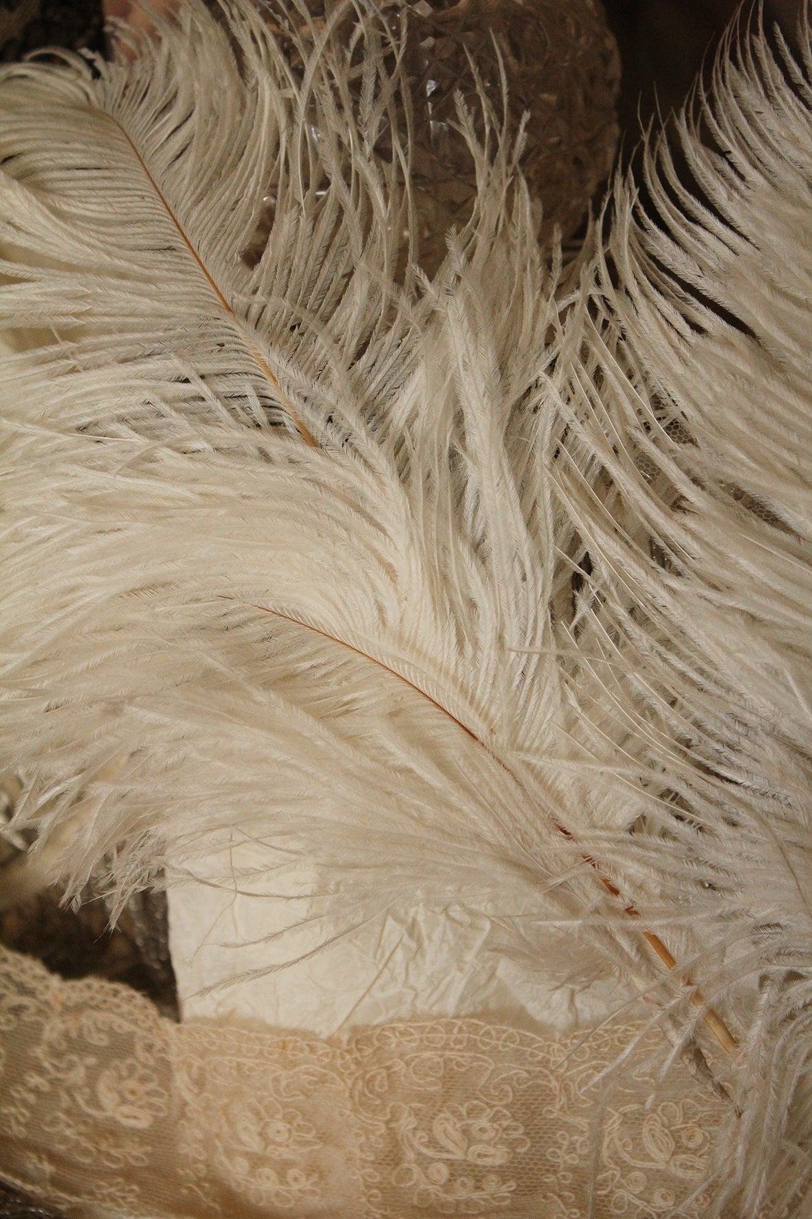 A beautiful collection of 4 ostrich feathers that have been joined together to create a fan like shape, ends have been bound in silk and stitched in place.
