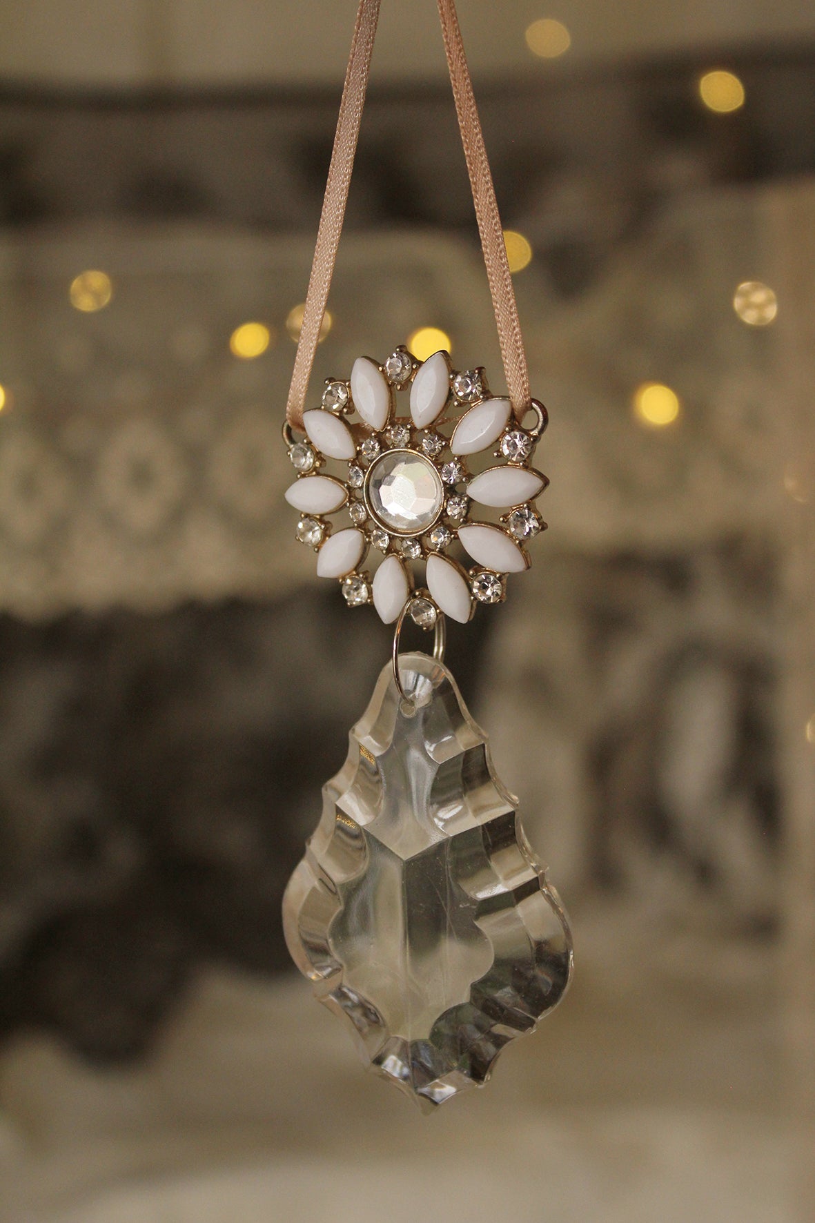 A lovely vintage decoration dressed a chandelier drop and a double satin ribbon as the hanger. Simply hang on a door handle of your armoire, from the wall, the corner of a painting, a garland, a wreath, a gift or simply place on your tree.