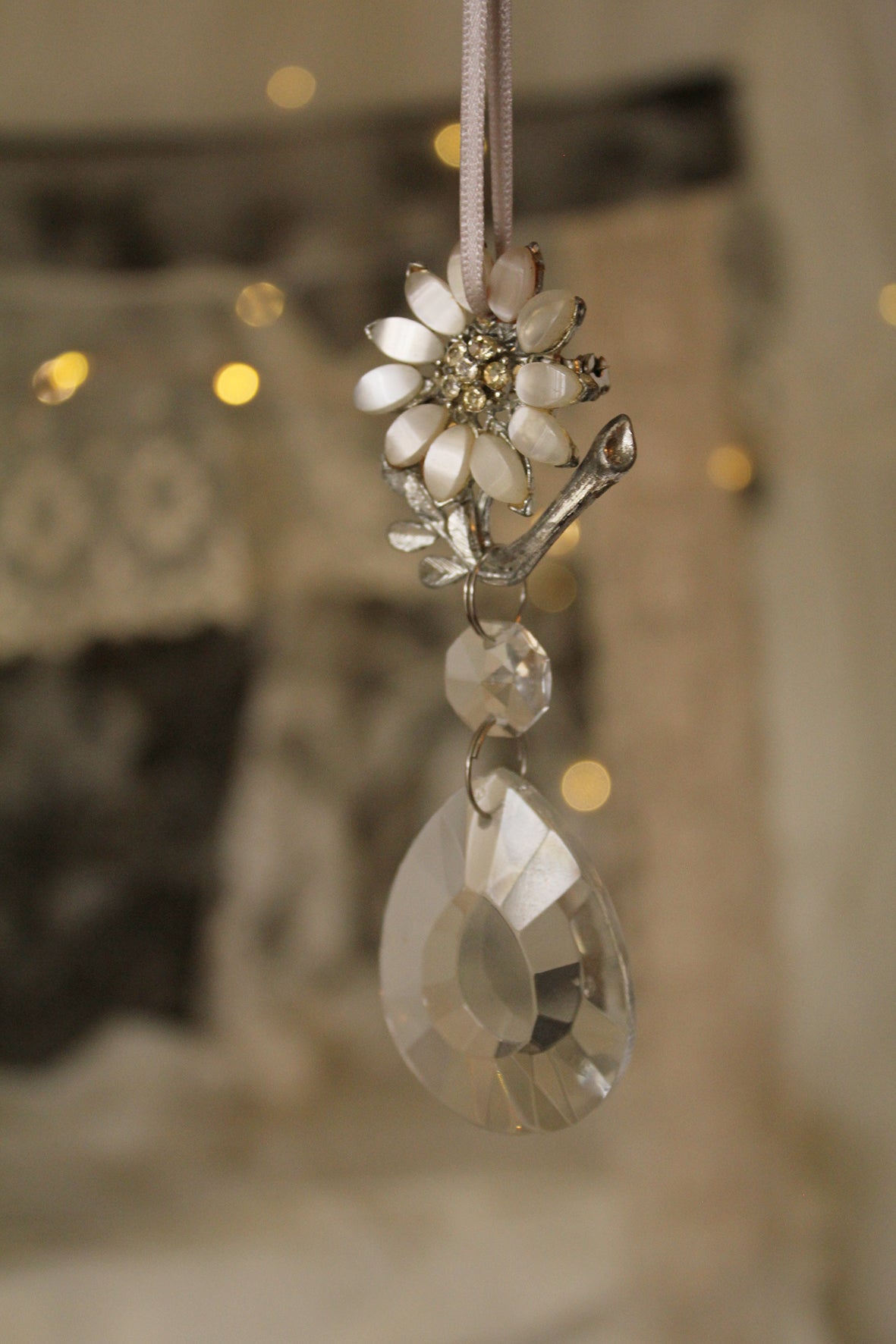 A lovely antique/vintage metal brooch dressed with jewels, a chandelier drop and a double satin ribbon as the hanger. Simply hang on a door handle of your armoire, from the wall, the corner of a painting, a garland, a wreath, a gift or simply place on your tree.