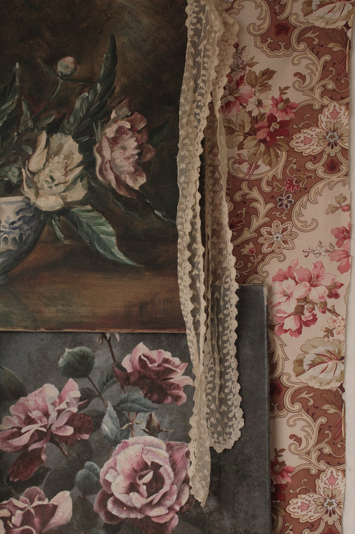 A reclaimed lace edging, possibly bridal. The leaves are a such a gorgeous motif all in a row. The netting has open circles with stitching around each.