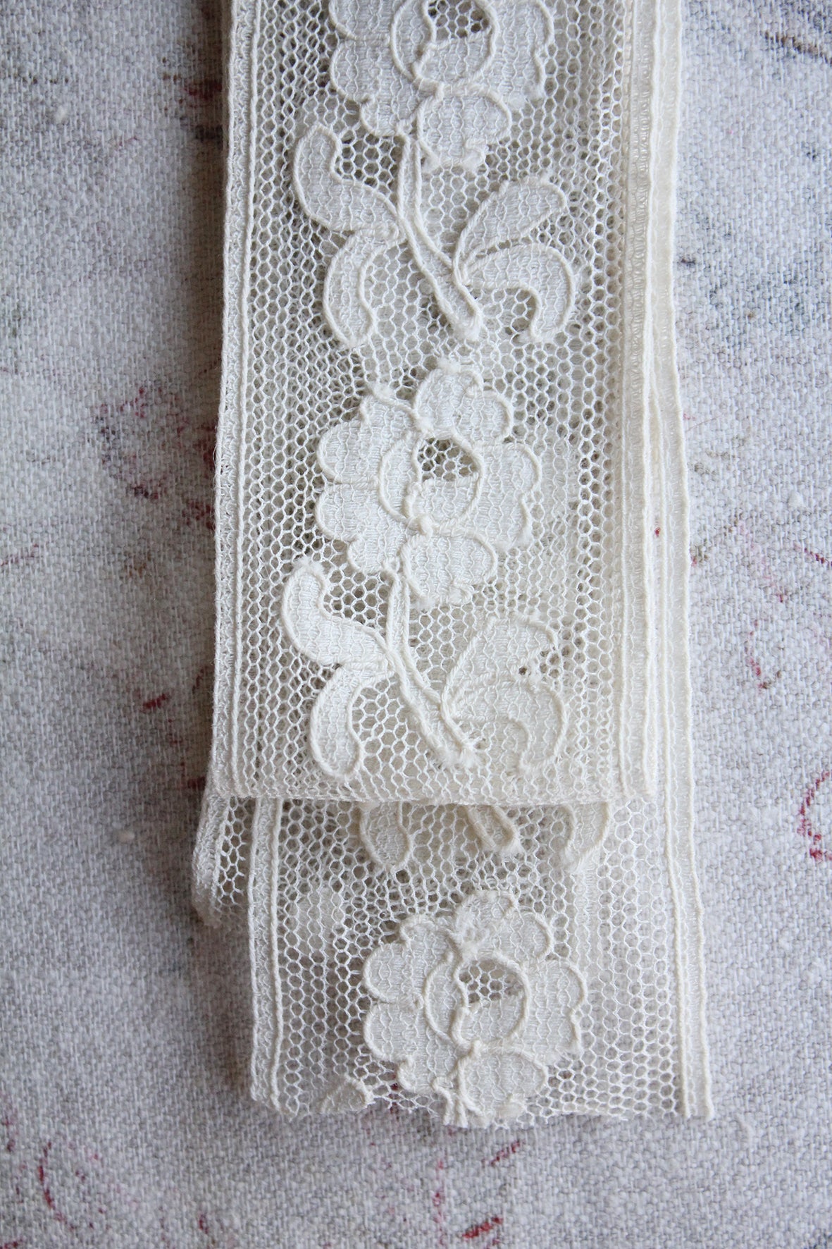 A beautiful length of Edwardian applique lace with fine linen single stem flowers all in a row, swimming across a netted ground.