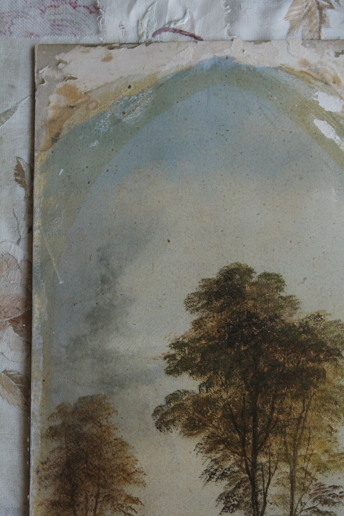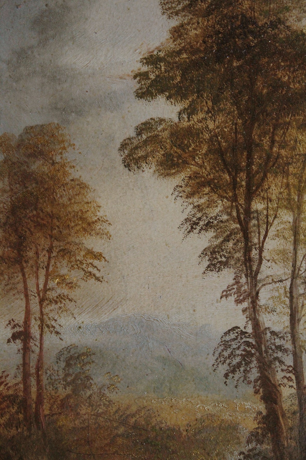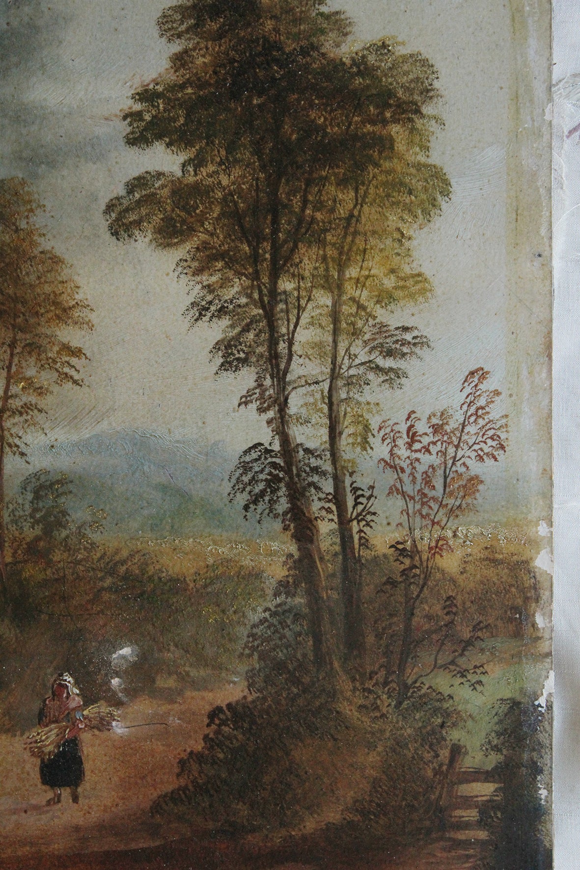 A beautiful old landscape oil reclaimed from the original damaged frame and mount. However the marks left by the old mount are rather lovely and suit the painting, especially if you love rustic markings. This has been originally painted on a heavy paper board so it is sturdy enough to lean against a cupboard top, mantle or shelf. I also have its sister painting for sale within this Shop Window too.