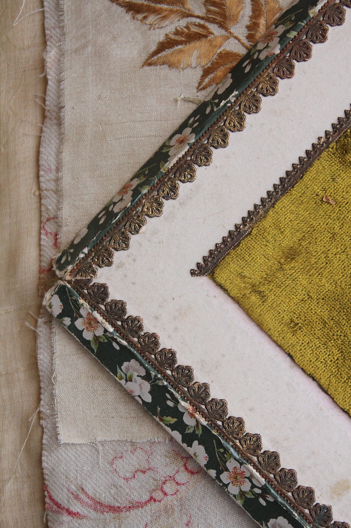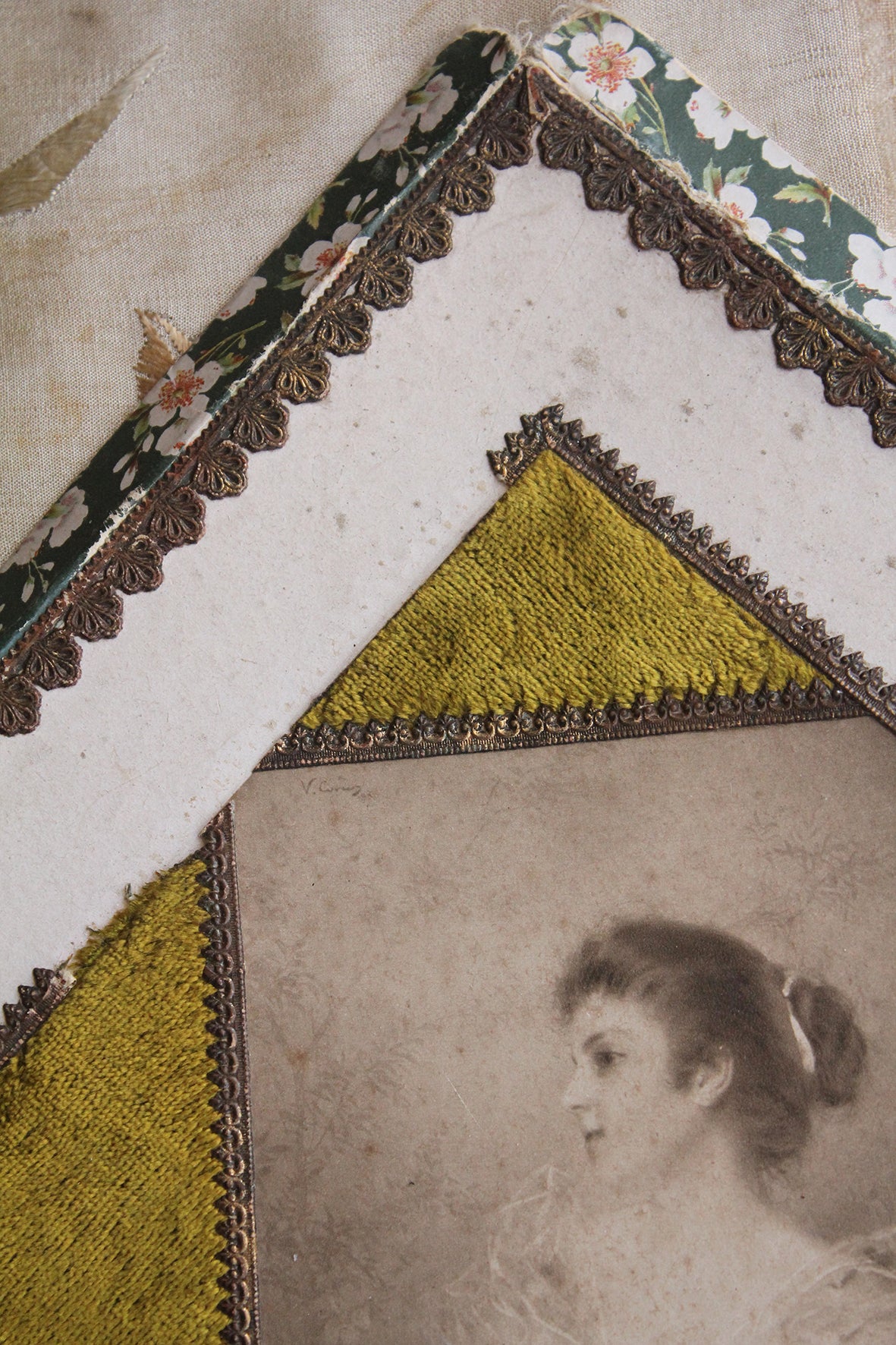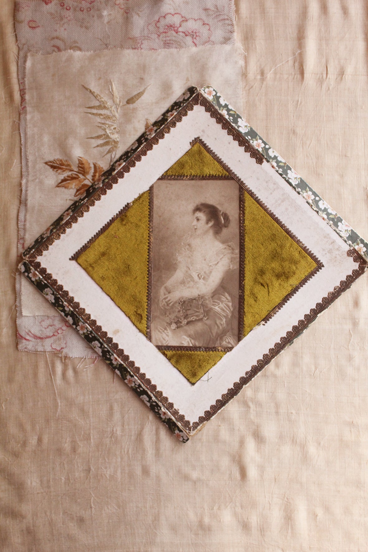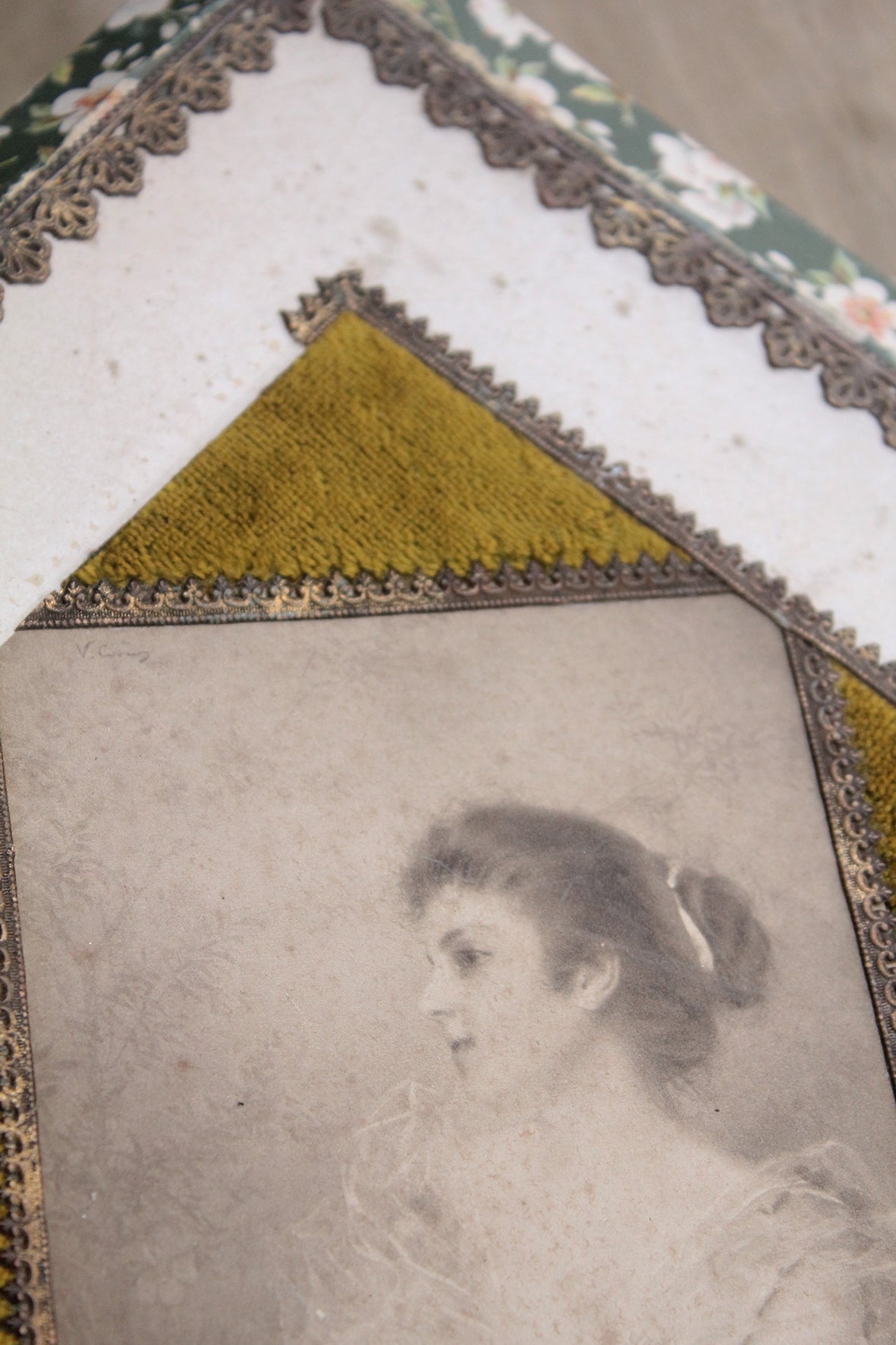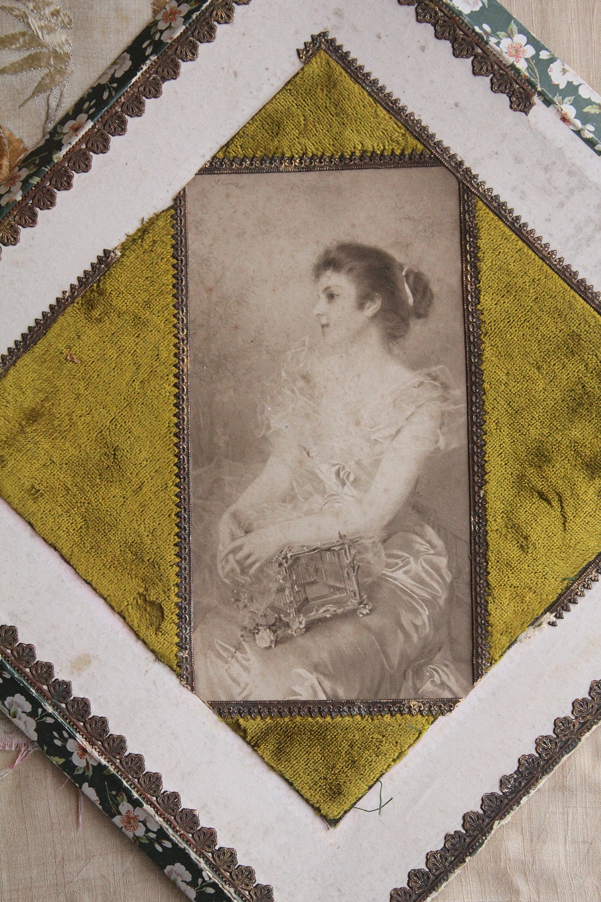 Exquisite detailing in pressed gilded paper borders, blossom print, velvet frame and a beautiful portrait of a Lady.