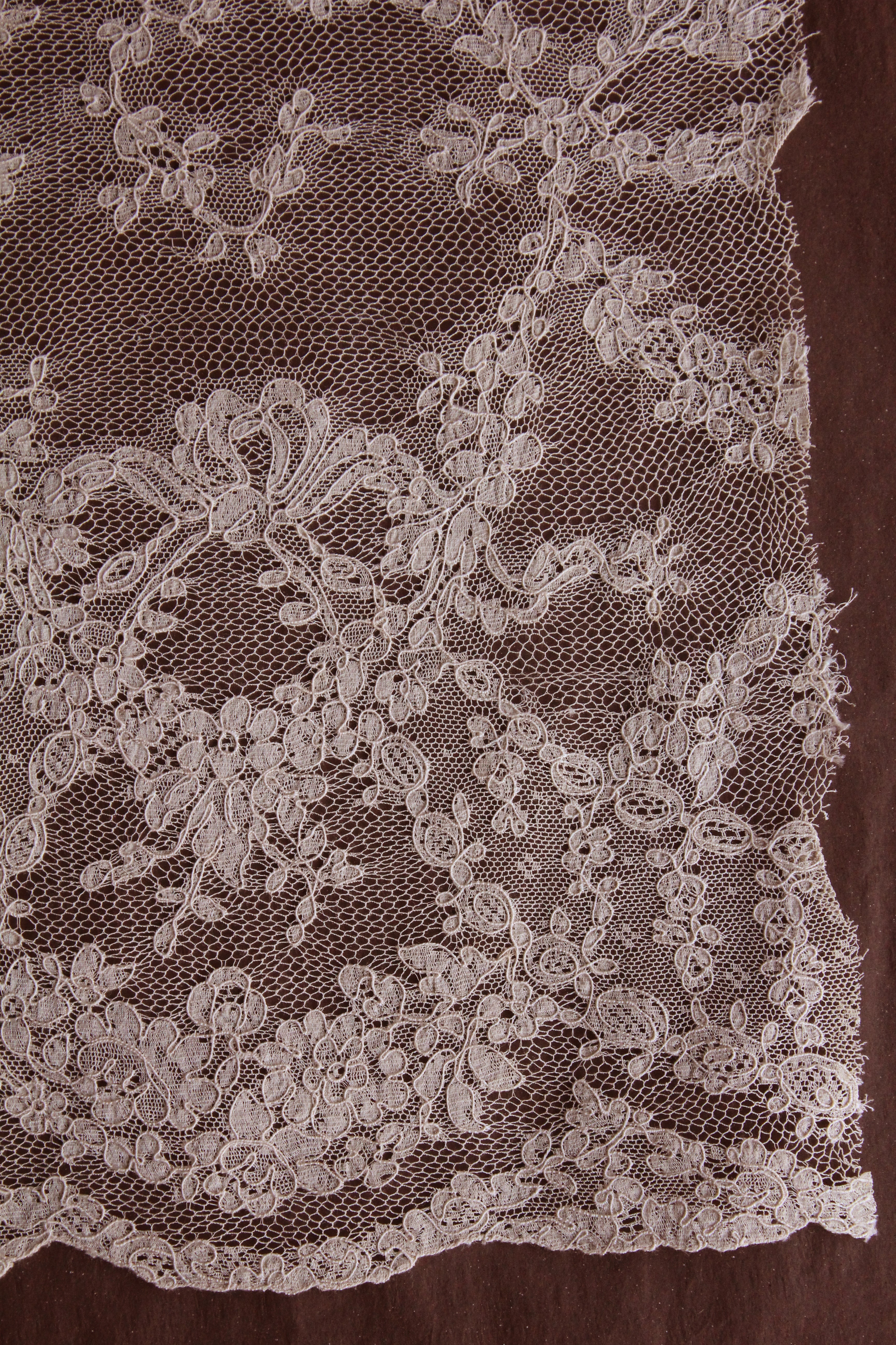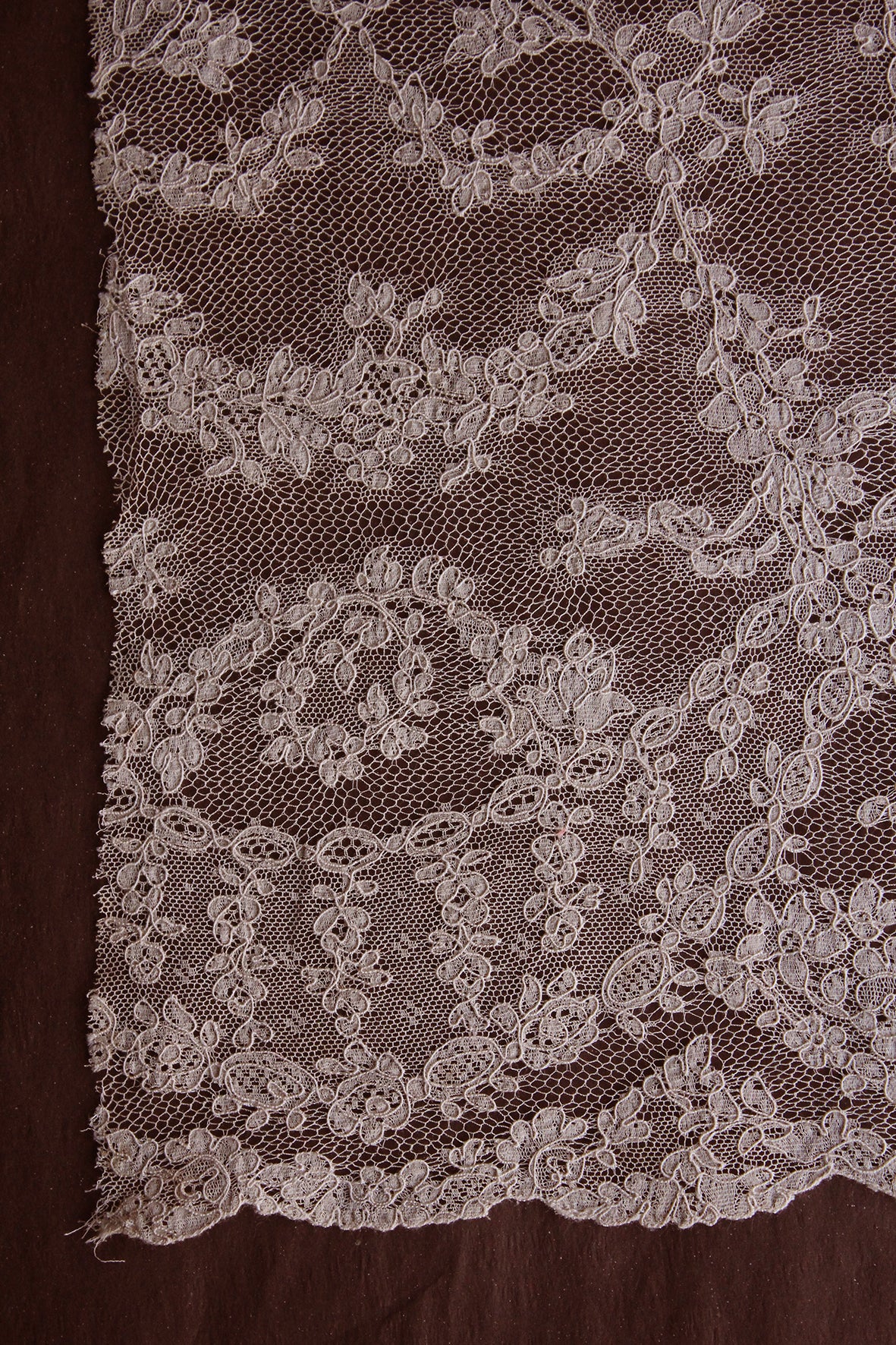 A fine netted ground with the design appliquéd in a fine silk chiffon. Each section of the design has been edged in a couched silk thread. Exquisite. This lace style tended to be produced in more 'café au lait' tones which was very fashionable for this period. This is a creamy pale version of that tone.