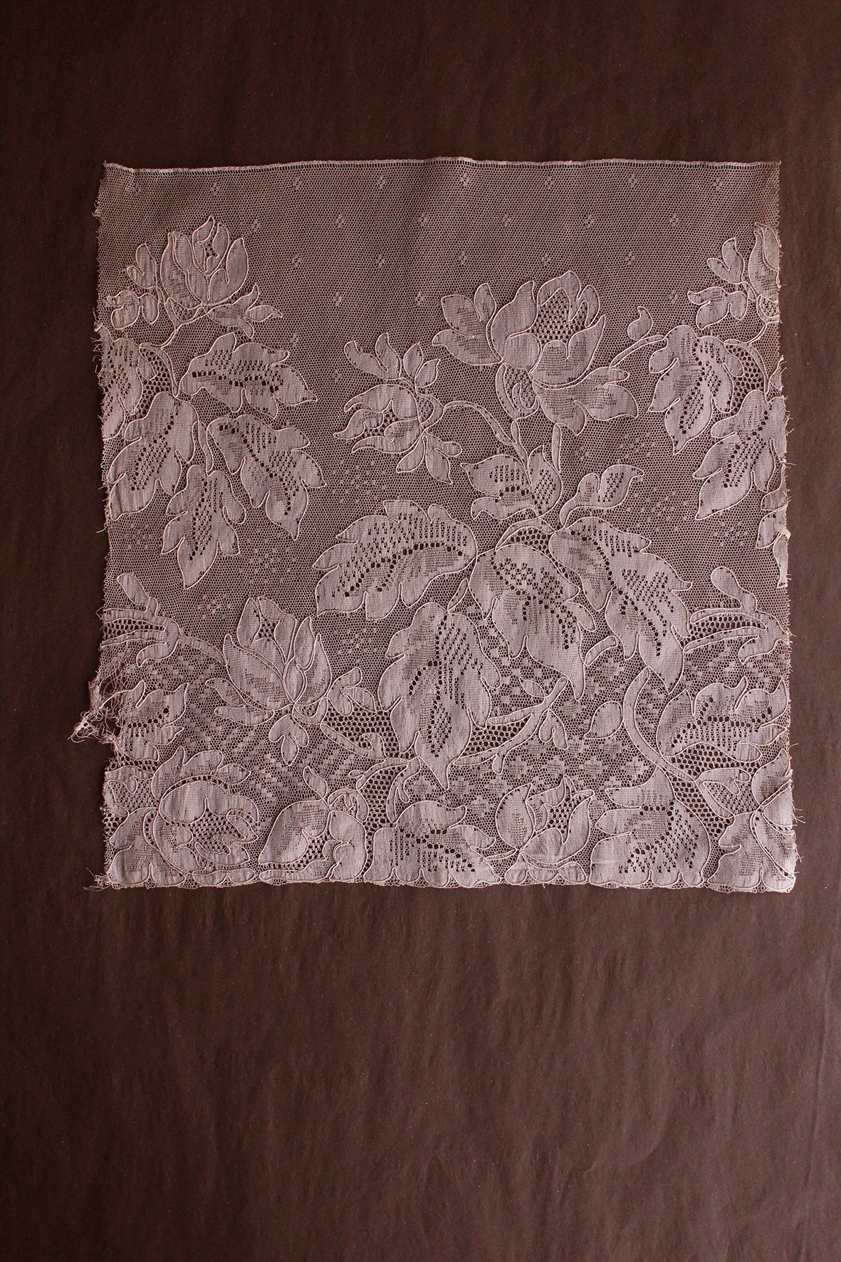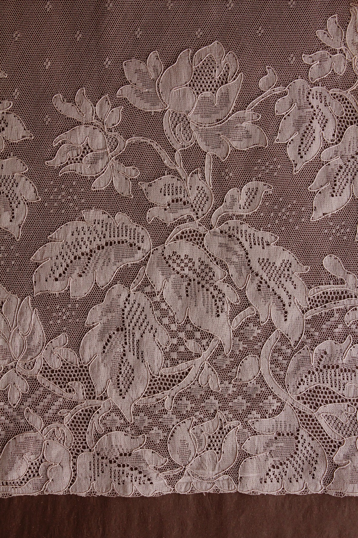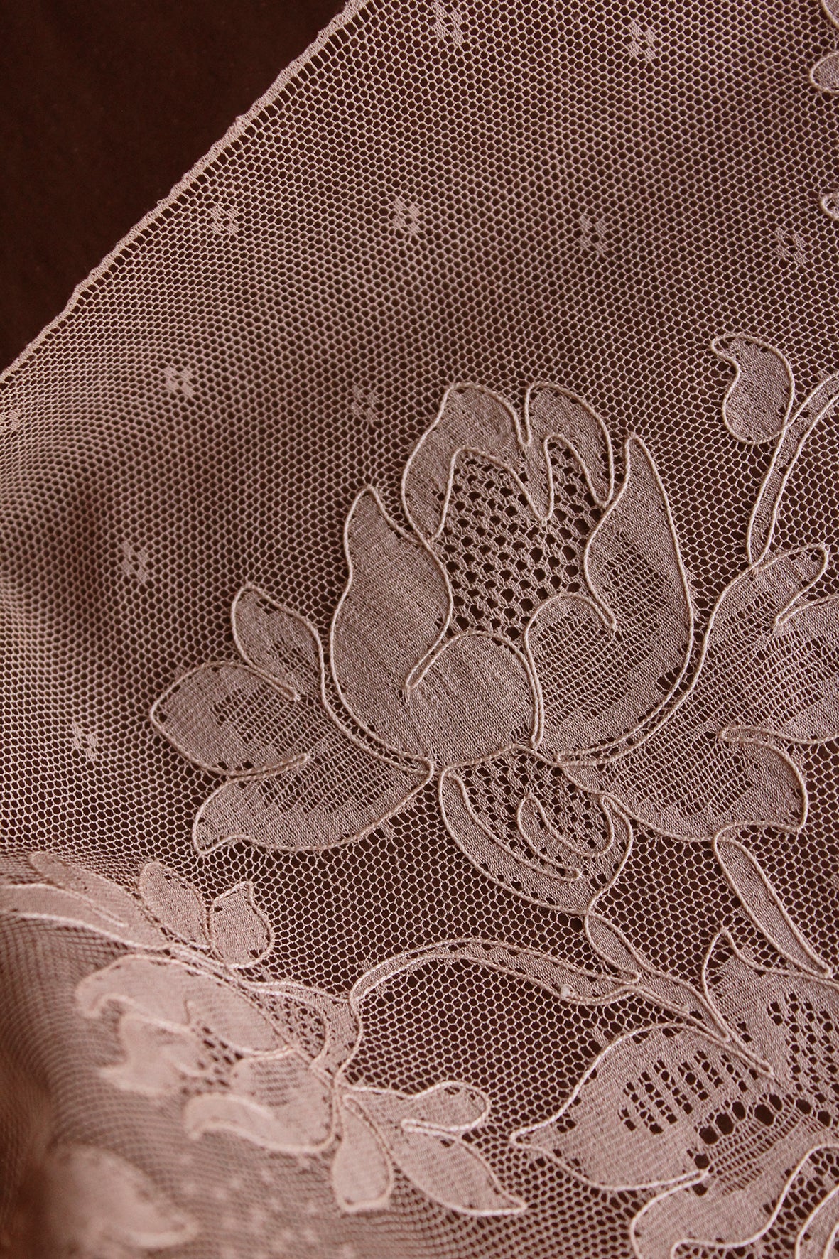 A fine netted ground with the design appliquéd in a fine silk chiffon. Each section of the design has been edged in a couched silk thread. Exquisite. This lace style tended to be produced in more 'café au lait' tones which was very fashionable for this period. This is a coffee with a delicate hint of rose.