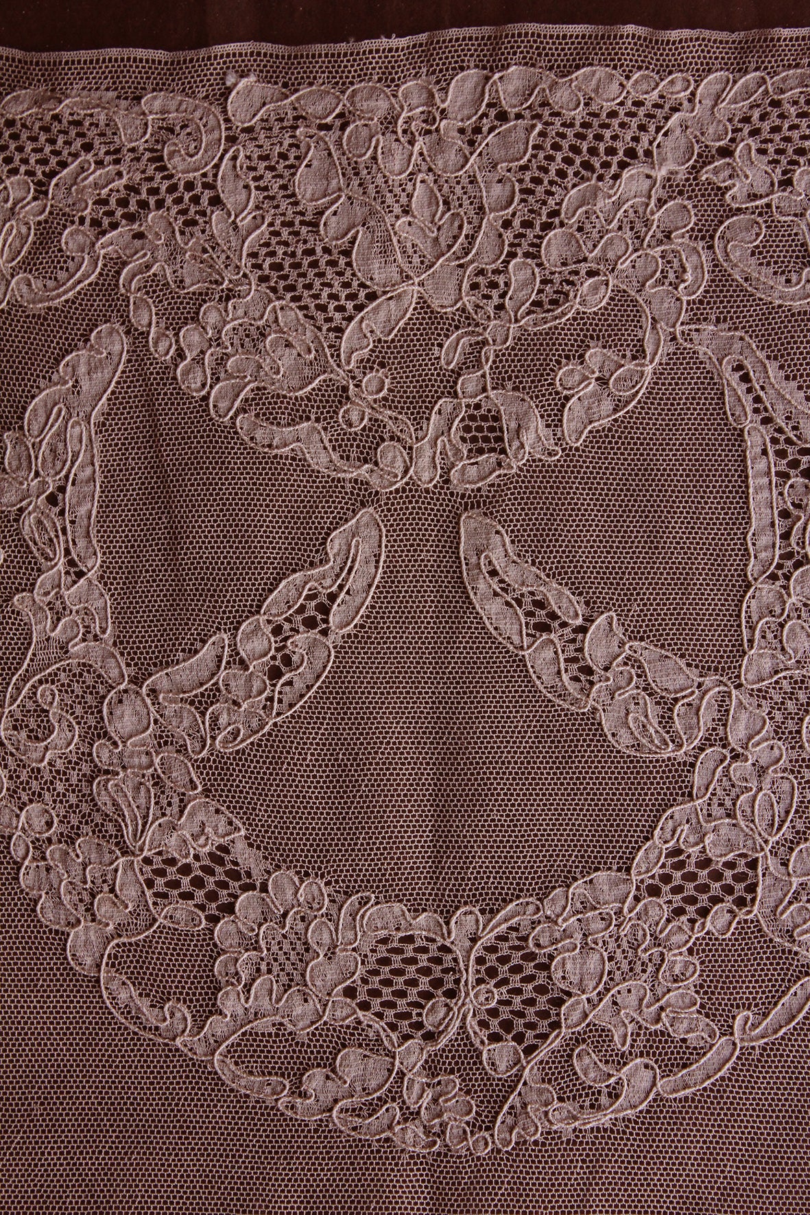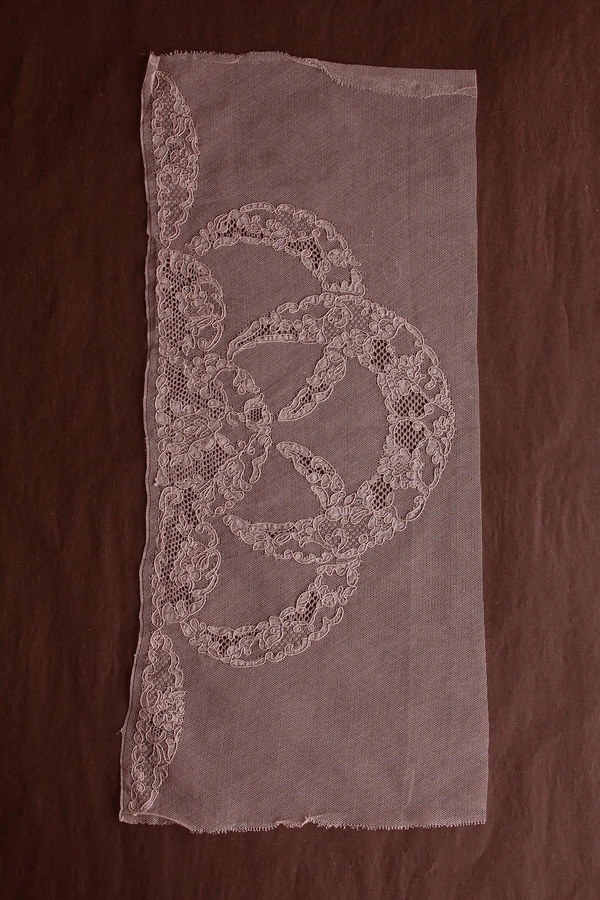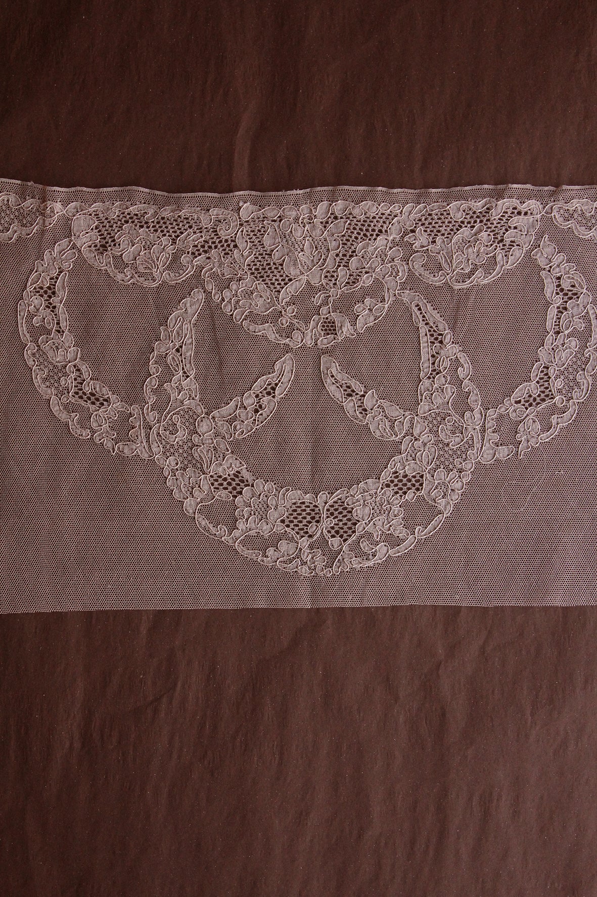 A fine netted ground with the design appliquéd in a fine silk chiffon. Each section of the design has been edged in a couched silk thread. Exquisite. This is a wonderful deco design that still remains to be cut out to make a very large motif (or series of smaller motifs). This lace style tended to be produced in more 'café au lait' tones which was very fashionable for this period. This is a delicate coffee with a delicate hint of rose.