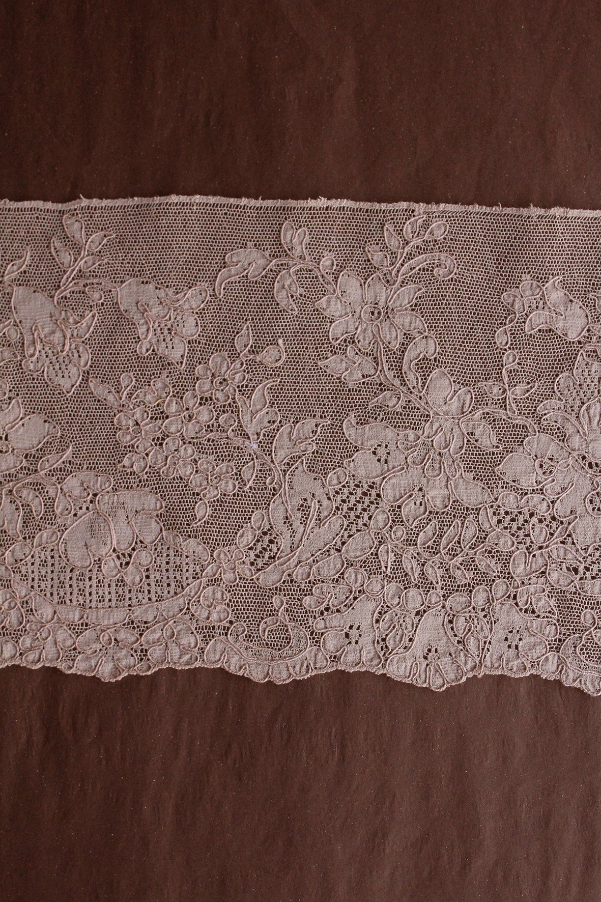 A fine netted ground with the design appliquéd in a fine silk chiffon. Each section of the design has been edged in a couched silk thread. Exquisite. This lace style tended to be produced in more 'café au lait' tones which was very fashionable for this period.
