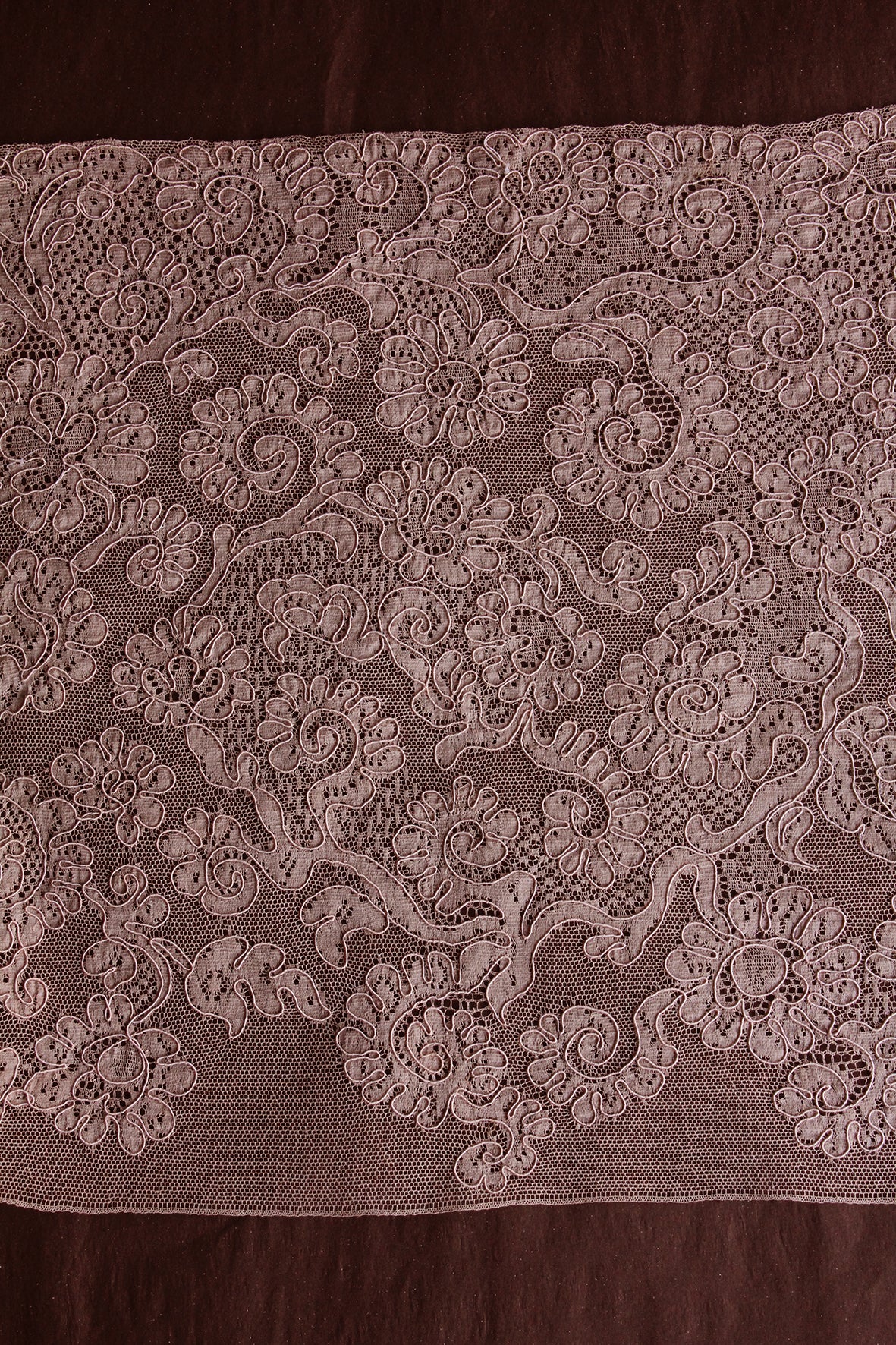 A fine netted ground with the design appliquéd in a fine silk chiffon. Each section of the design has been edged in a couched silk thread. Exquisite. This lace style tended to be produced in more 'café au lait' tones which was very fashionable for this period.