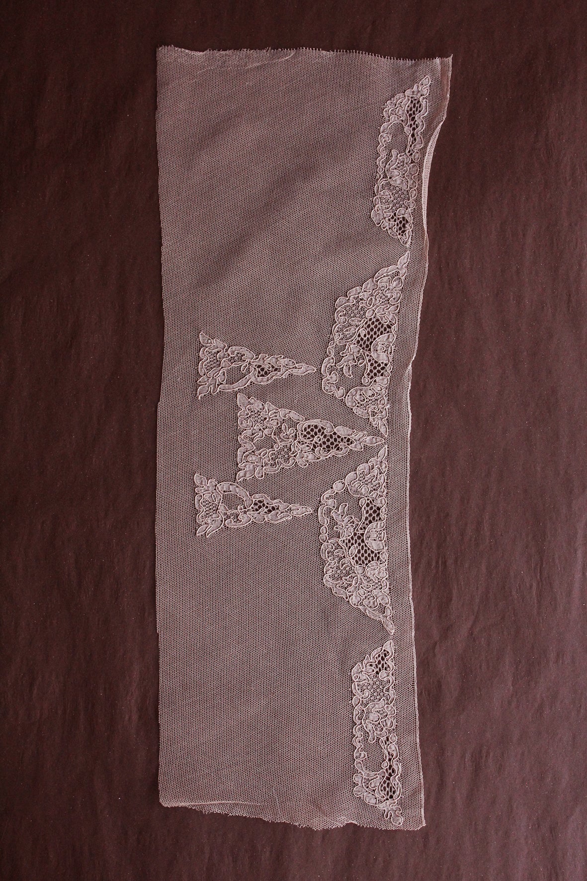 This particular piece consists of 7 small applique designs that have still yet to be cut away from the netted ground. Just wonderful.