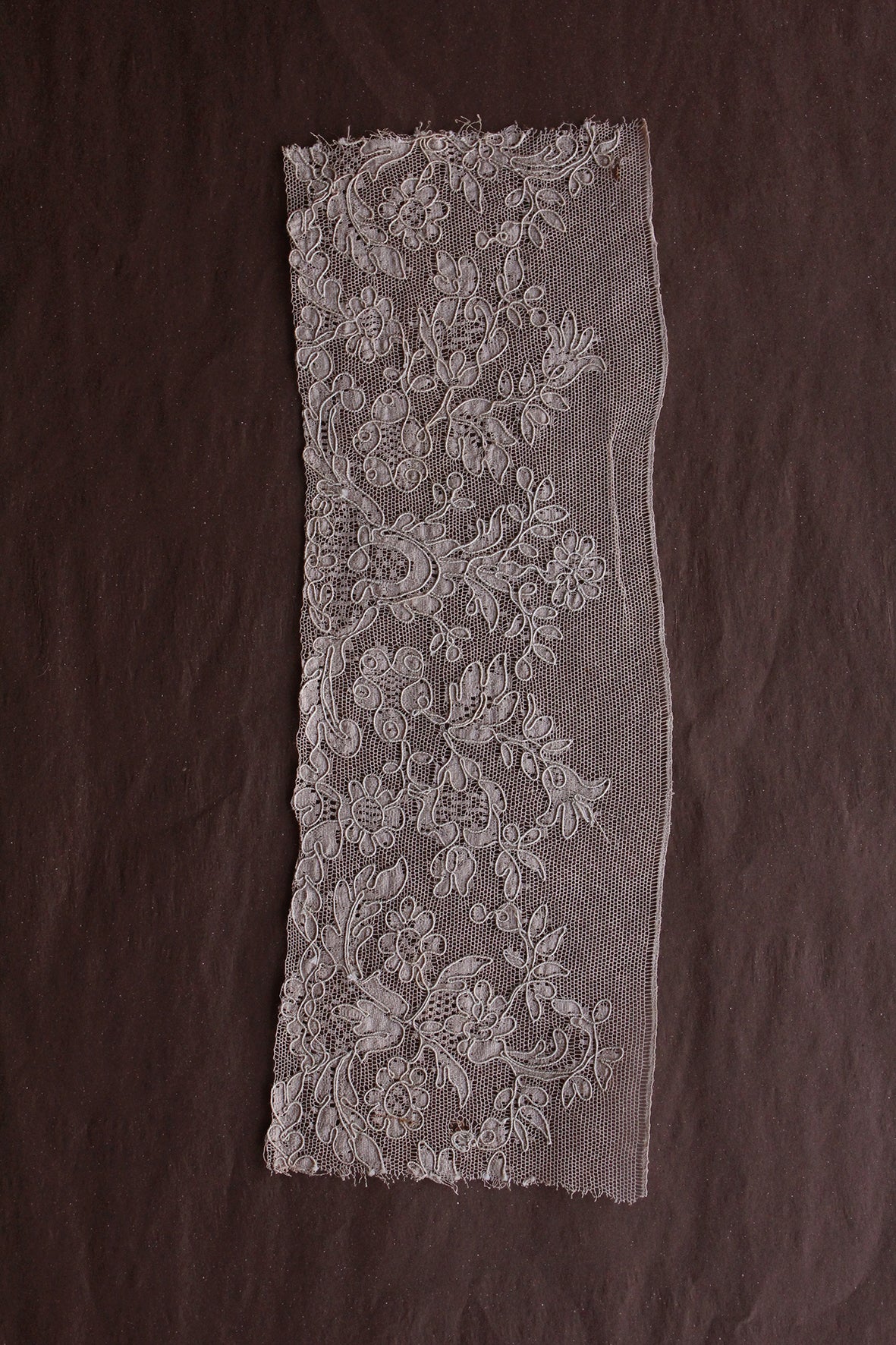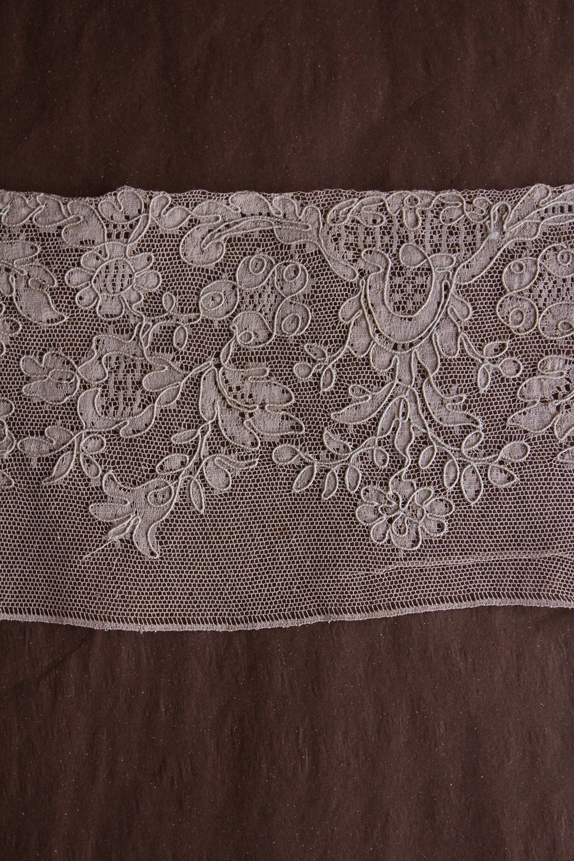 A fine netted ground with the design appliquéd in a fine silk chiffon. Each section of the design has been edged in a couched silk thread. Exquisite. This lace style tended to be produced in more 'café au lait' tones which was very fashionable for this period.