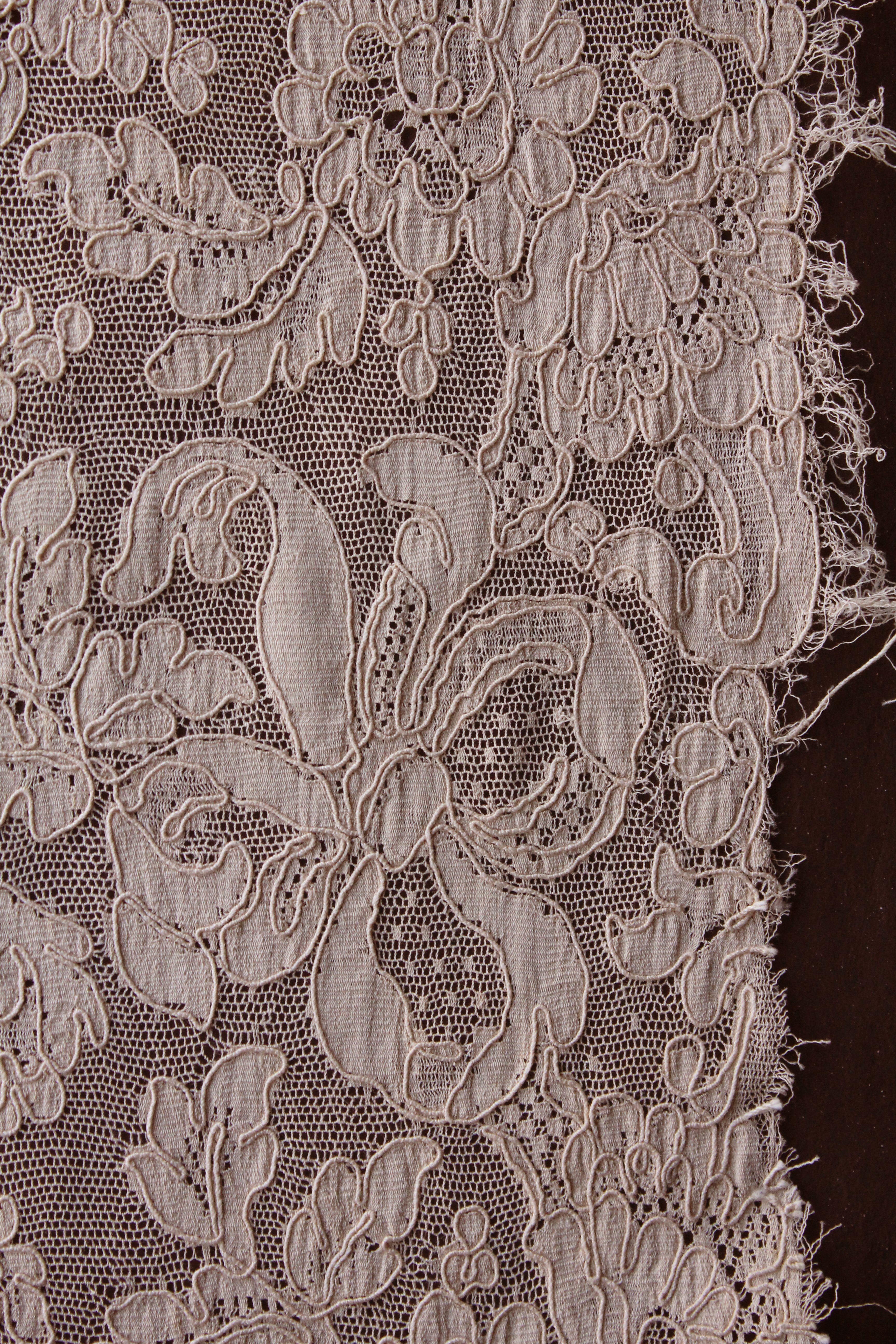A large fine netted ground with the design appliquéd in a fine silk chiffon. Each section of the design has been edged in a couched silk thread. Exquisite. This lace style tended to be produced in more 'café au lait' tones which was very fashionable for this period. This is a creamy version of that with a hint of buttermilk.