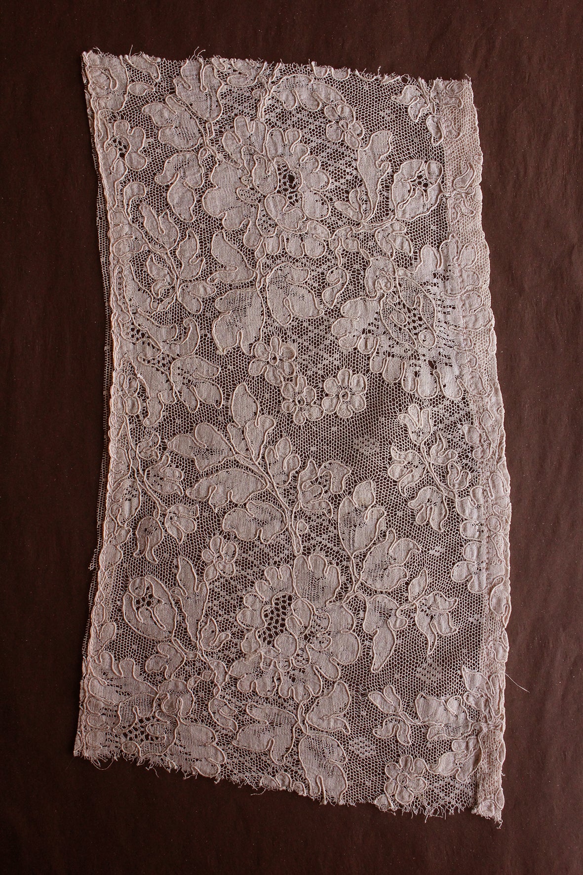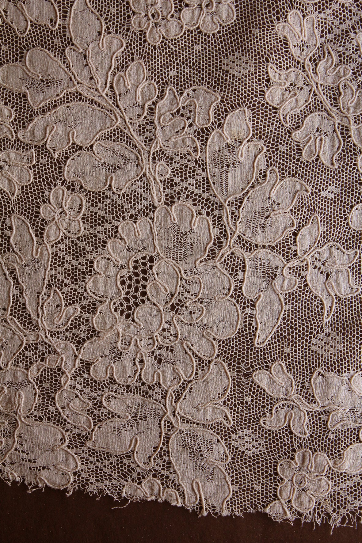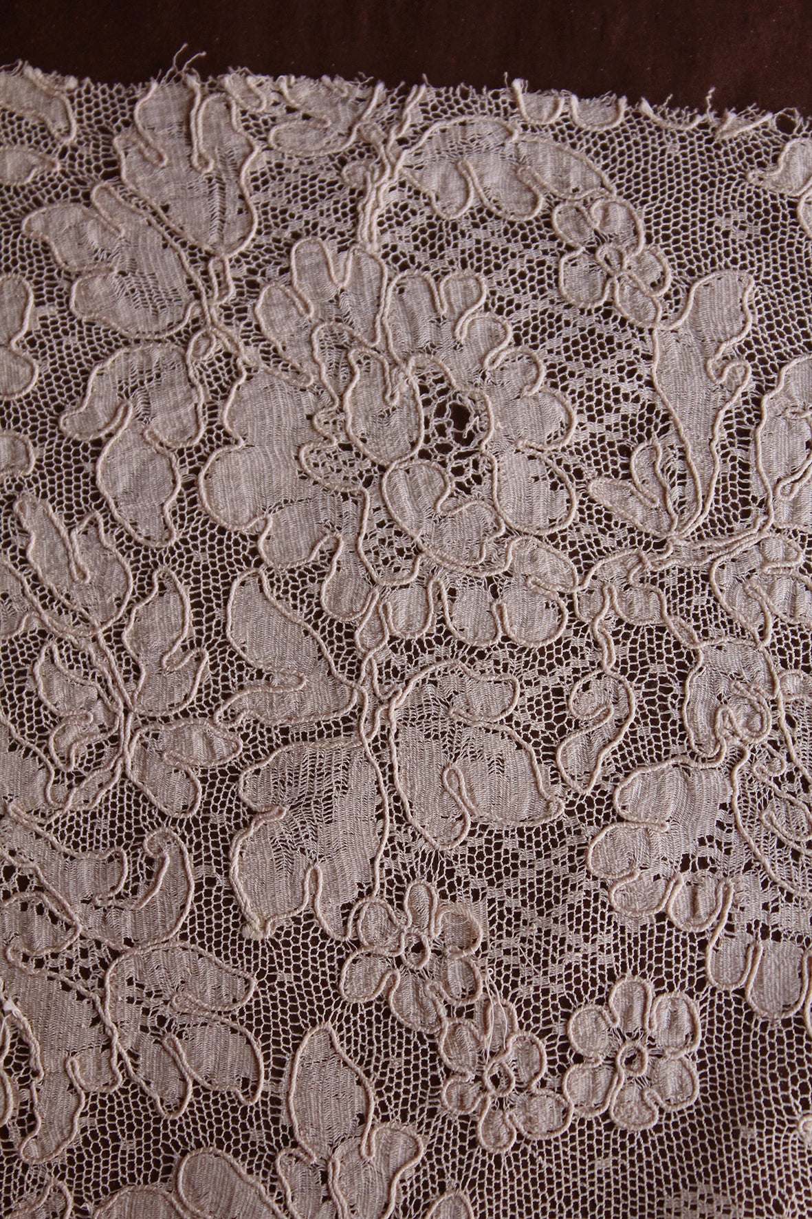 A fine netted ground with the design appliquéd in a fine silk chiffon. Each section of the design has been edged in a couched silk thread. Exquisite. This lace style tended to be produced in more 'café au lait' tones which was very fashionable for this period.