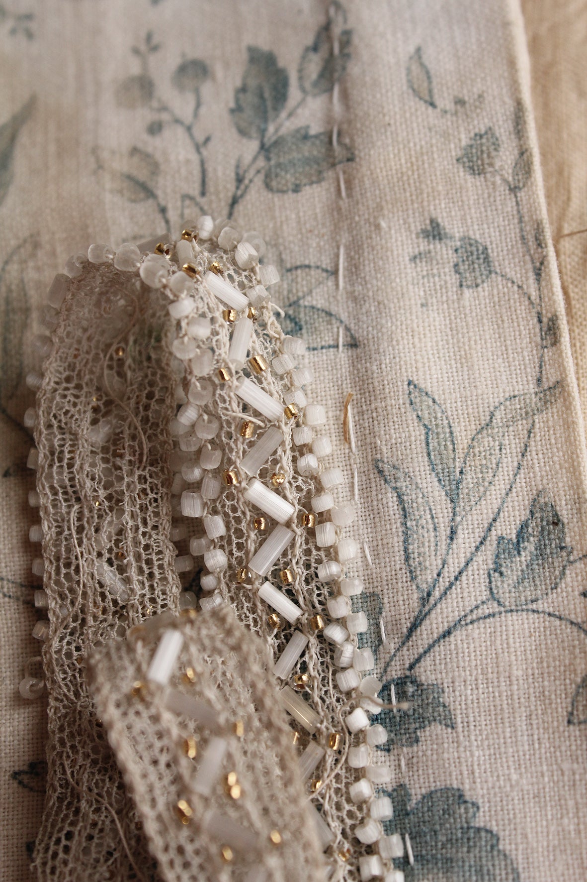 A wonderfully detailed, hand beaded Victorian dress decorative border panel. Beaded in gentle whites and tiny gold glass beads. Many hours laboured to produce this lovely piece.