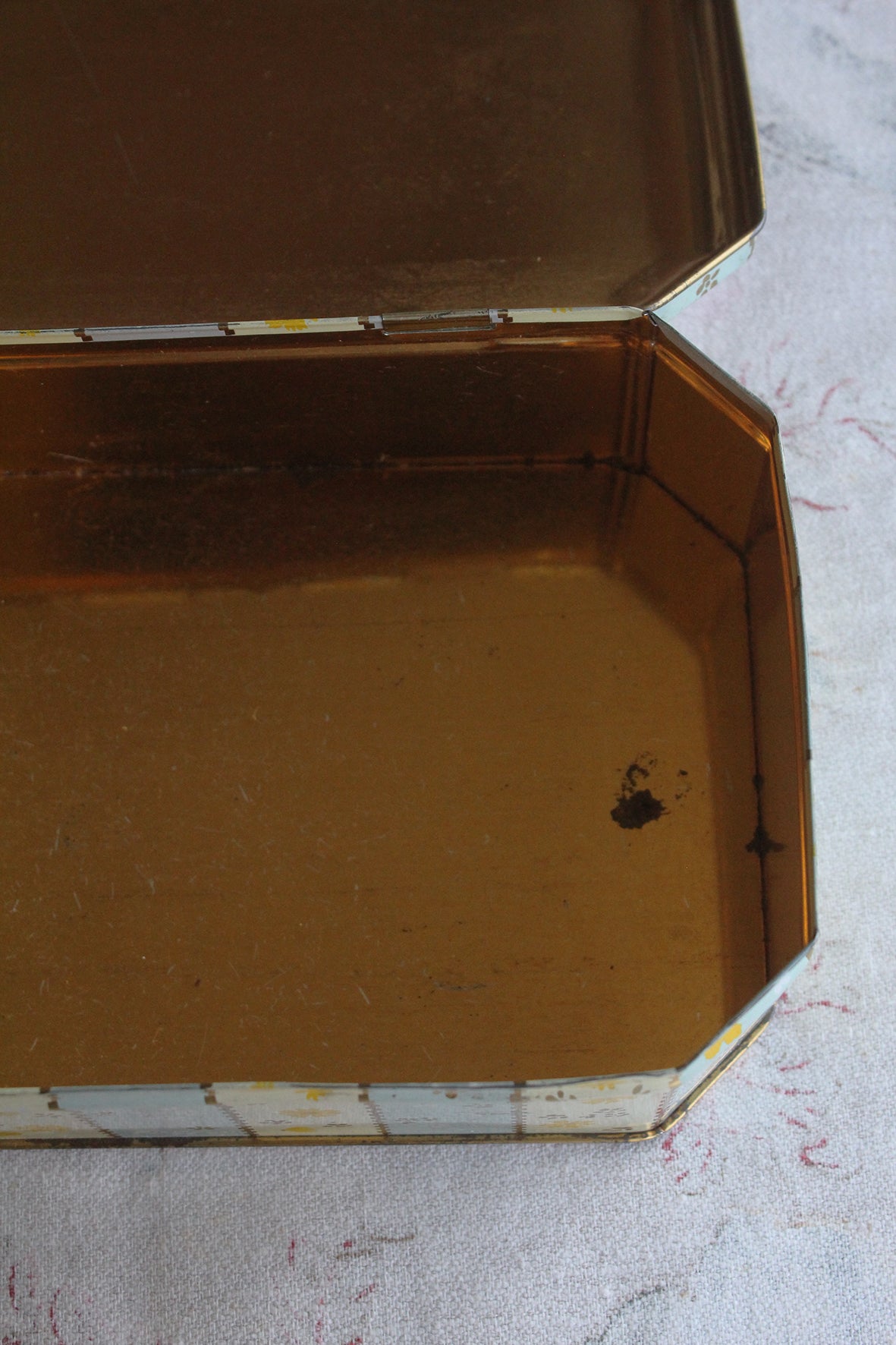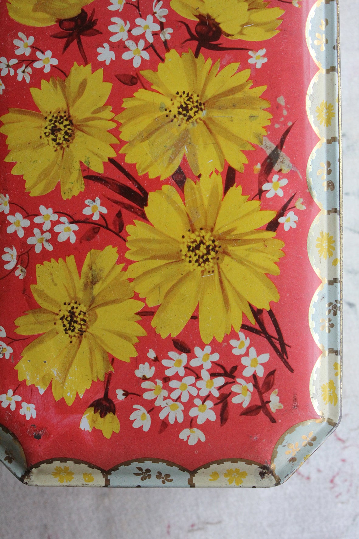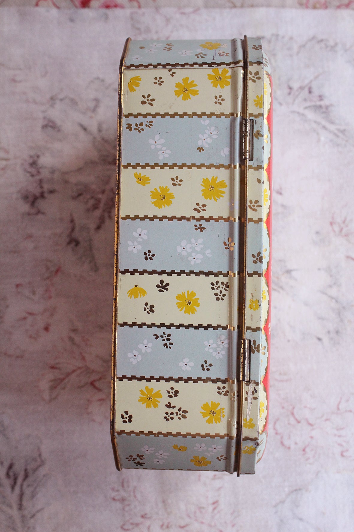 Vintage tins are perfect for storing old bits of ribbon, buttons, and general bits and bobs. This tin is particularly cheery in design.