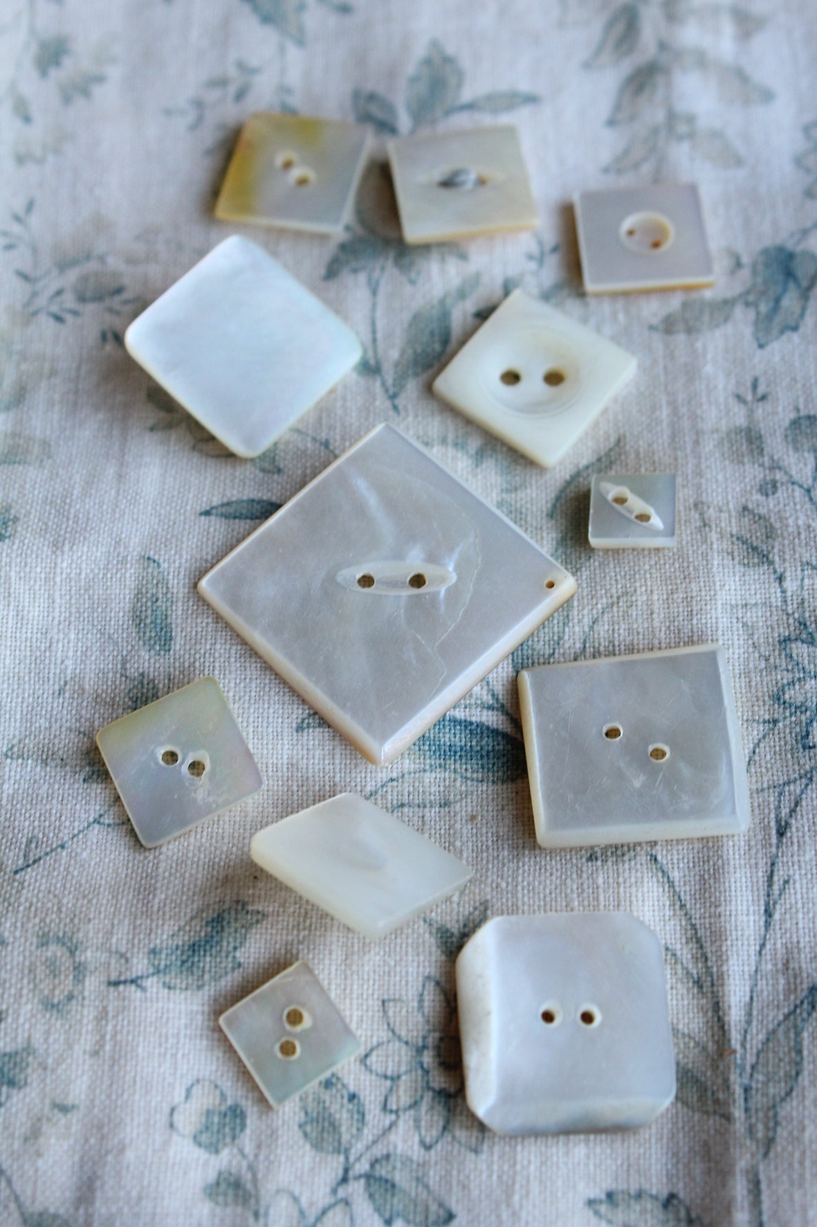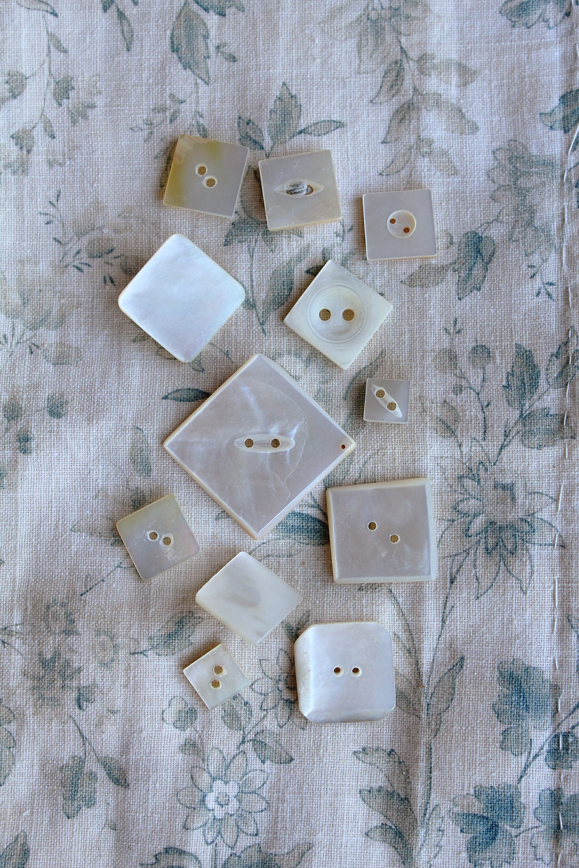 A collection of old squared mother of pearl buttons all reclaimed from varied damaged garments collected over time.