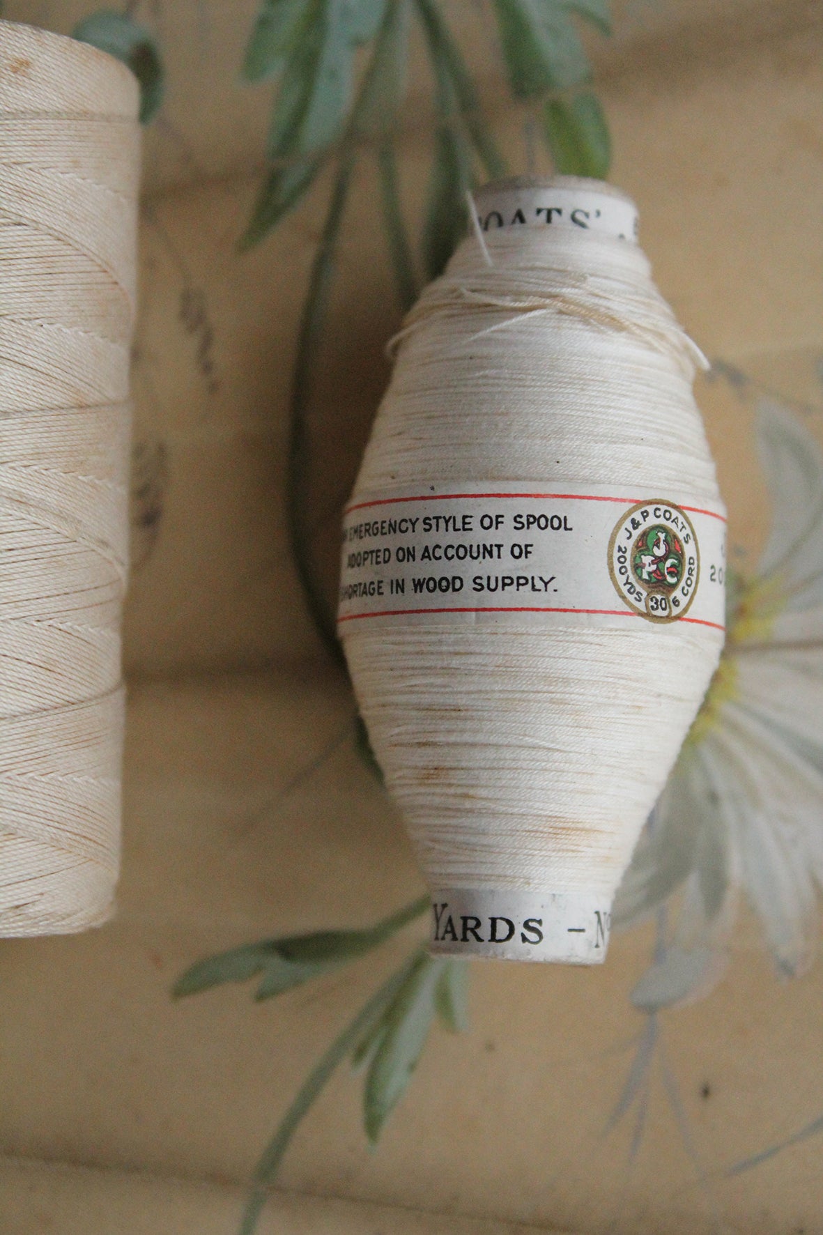 The reel with the old paper wrap is a Coats reel that reads "war emergency style of spool adopted on account of shortage in wood supply. The thread has unwrapped slightly at one end.