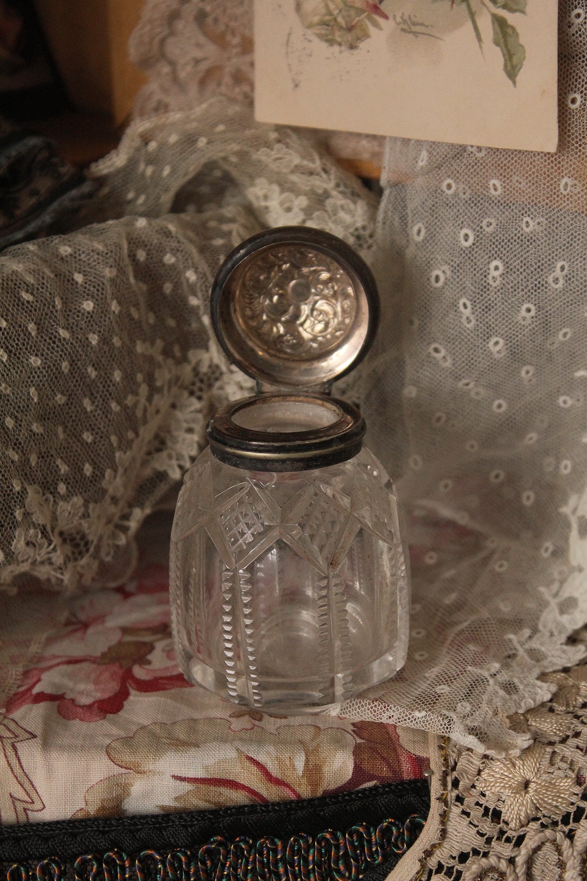 Cut Glass Bottle/Ink Well With Decorative Hinged Lid