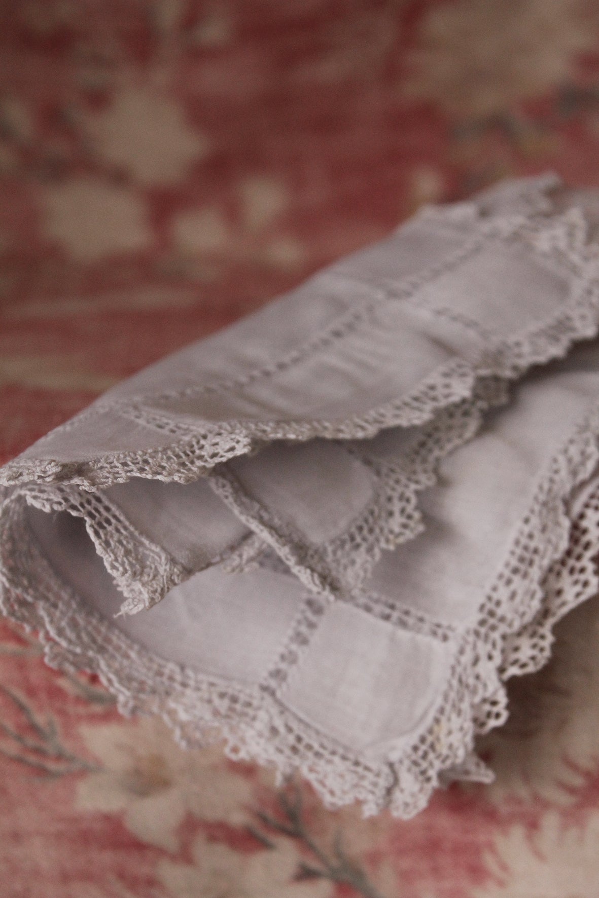 A beautiful old collection of table coasters/mats in a very pale blue/grey tone with a delicate lace edging.