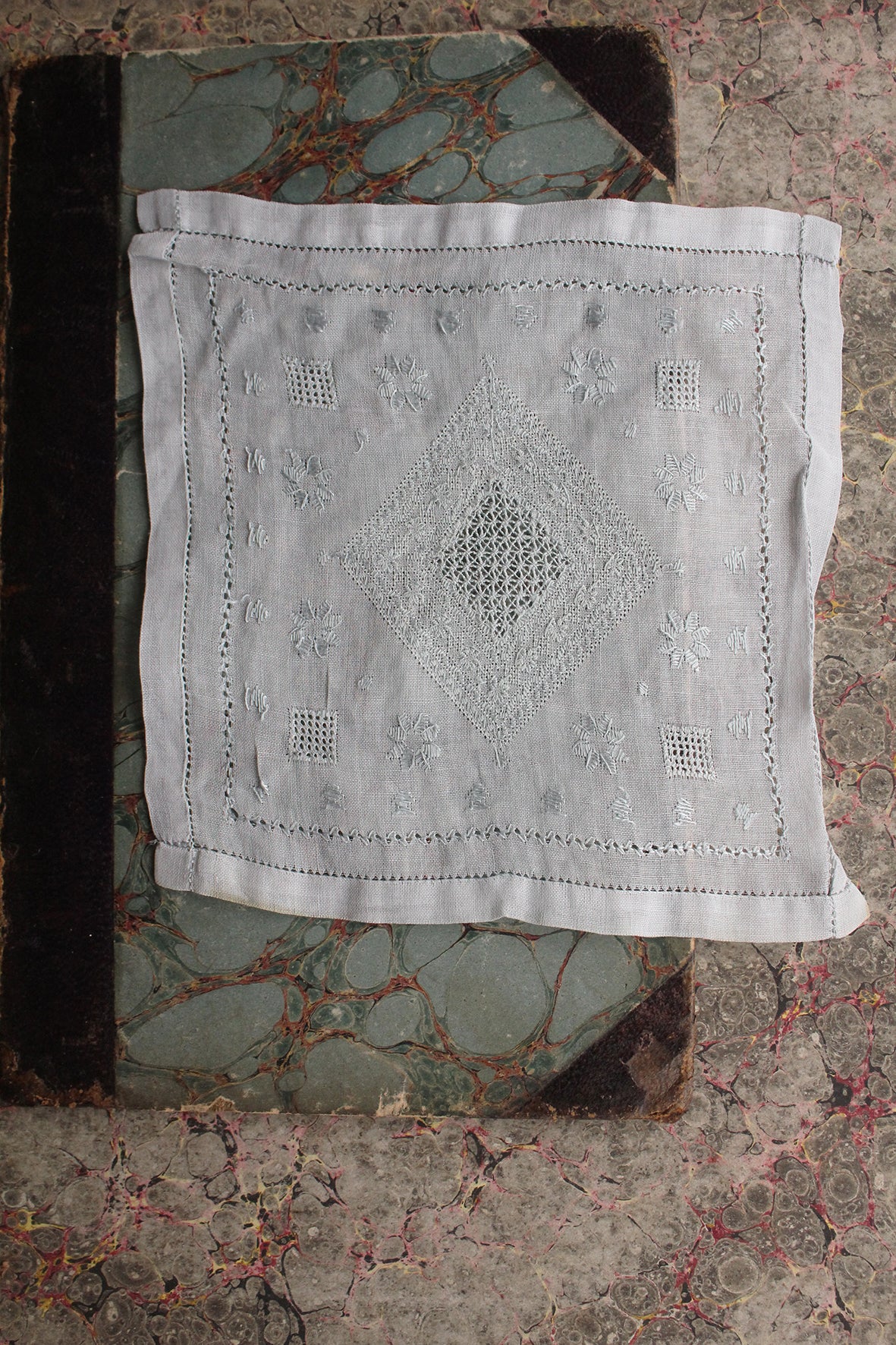 A beautiful Edwardian mat that would have been placed on a vanity table under a vase or perfume bottle. It is a very pale blue/grey tone. Delicate embroidery and drawn thread work.