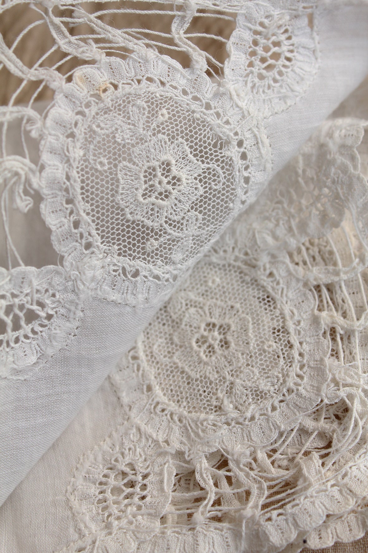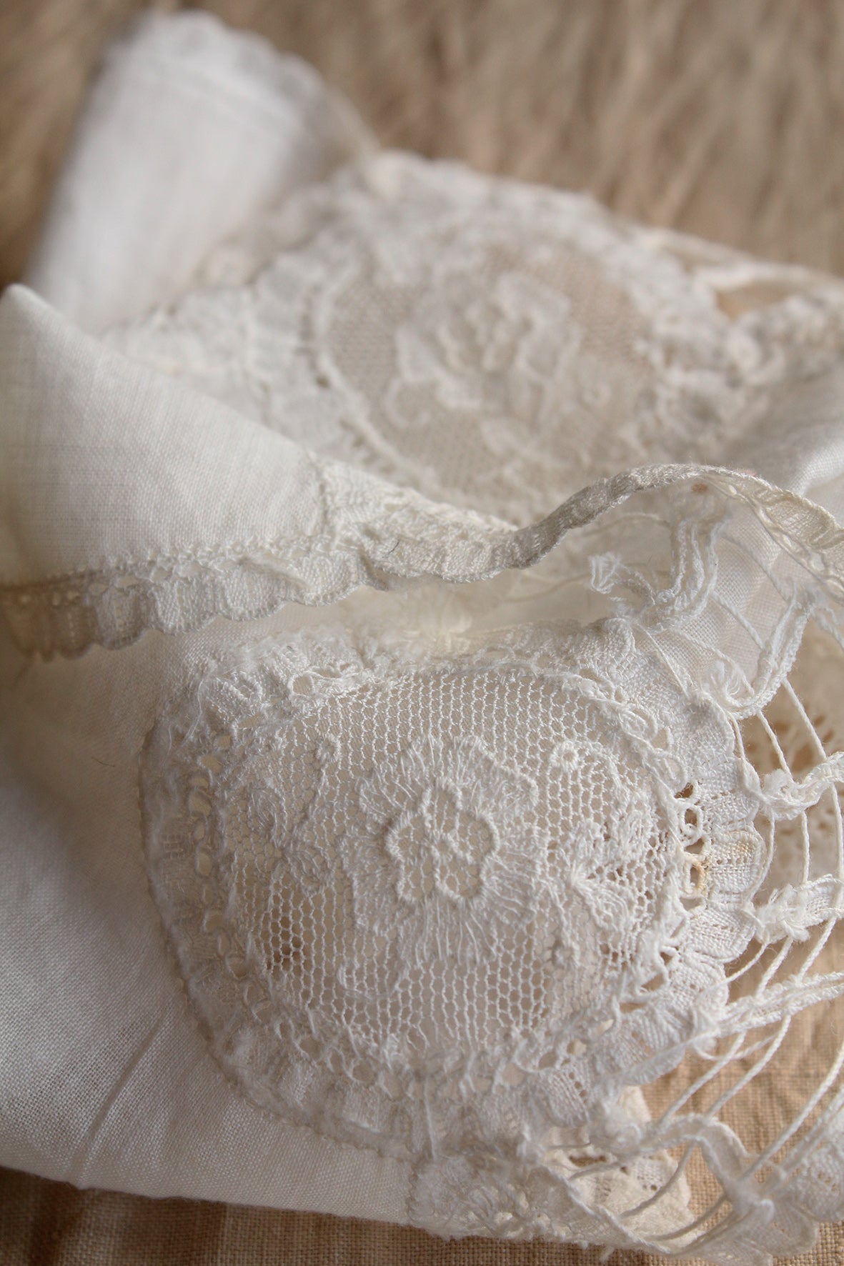 A lovely old lace handkerchief on fine cotton lawn. Each corner has a cameo with a single lace flower to the centre.