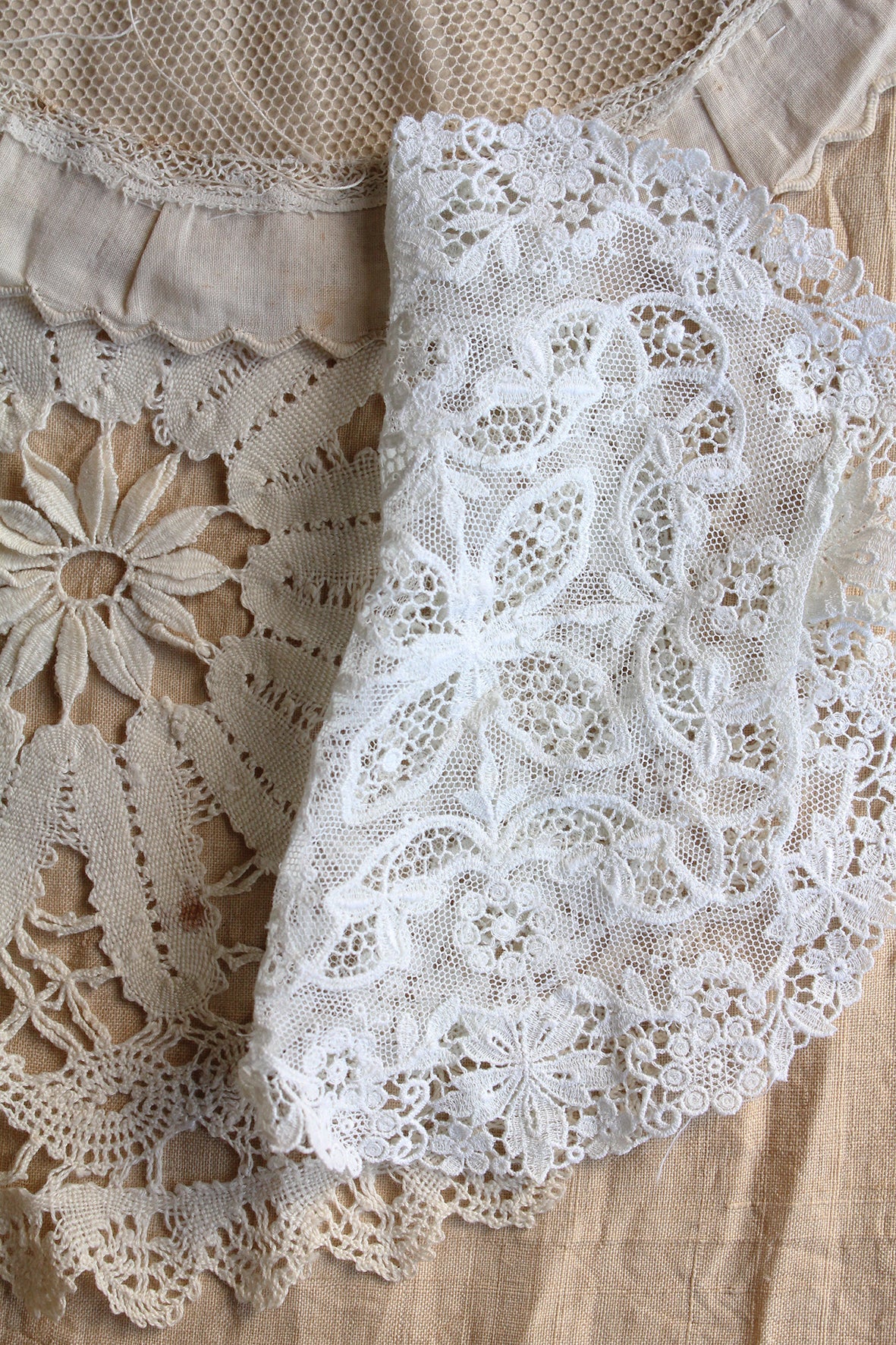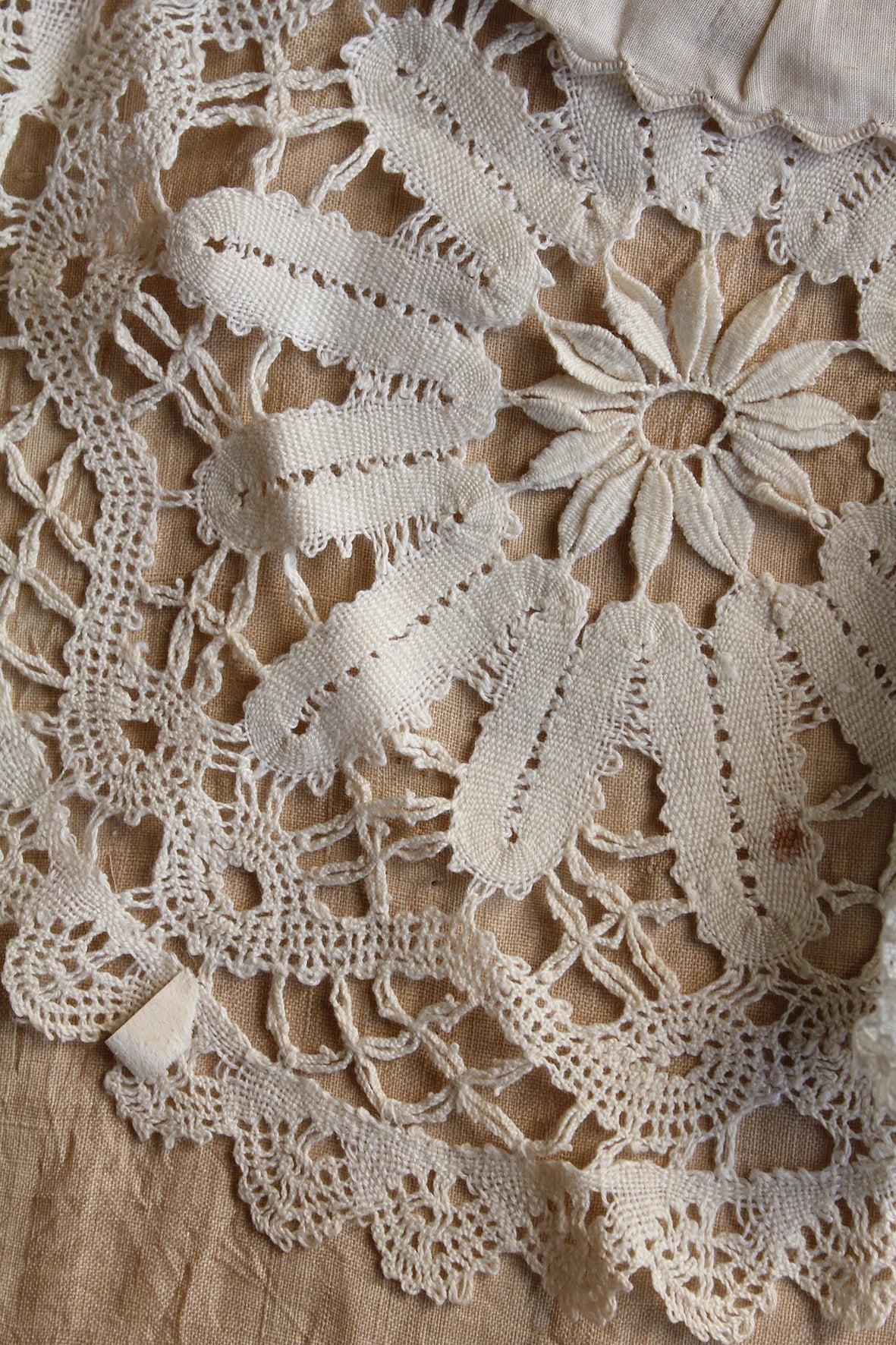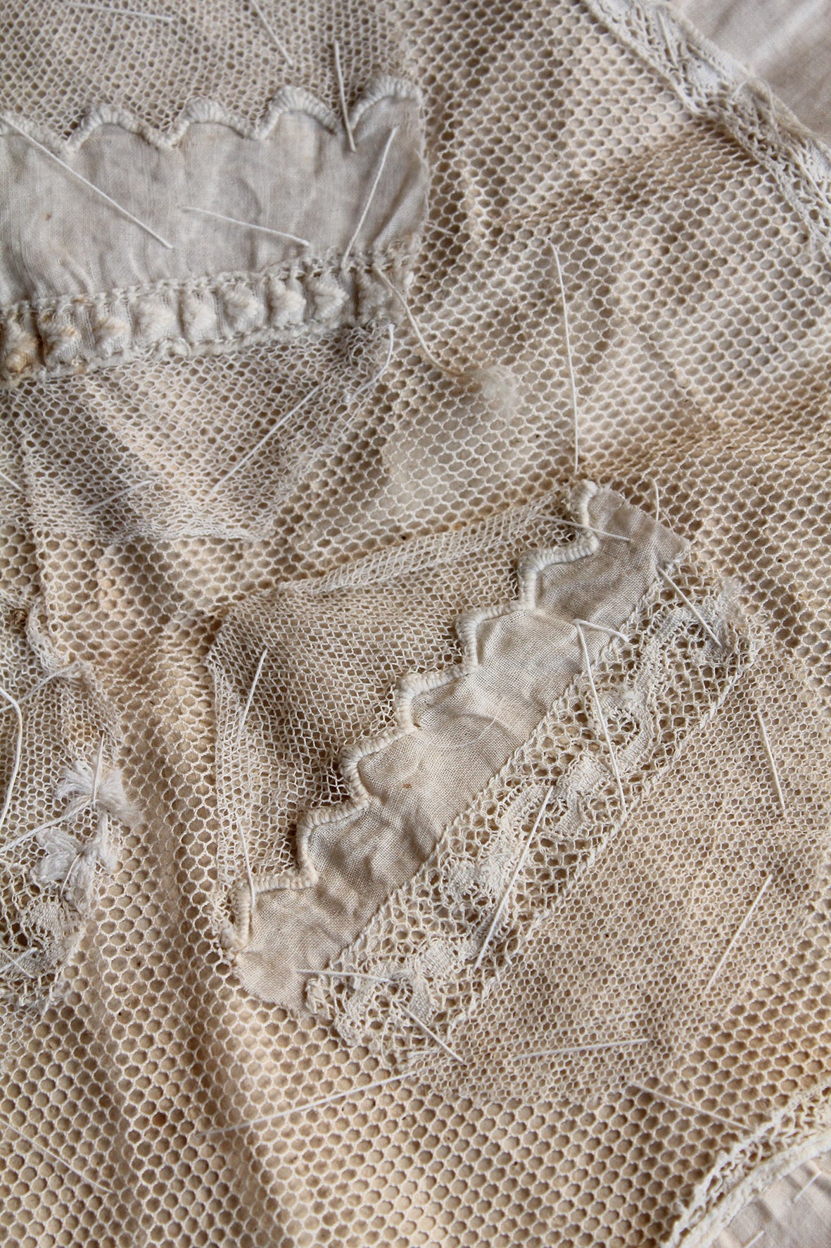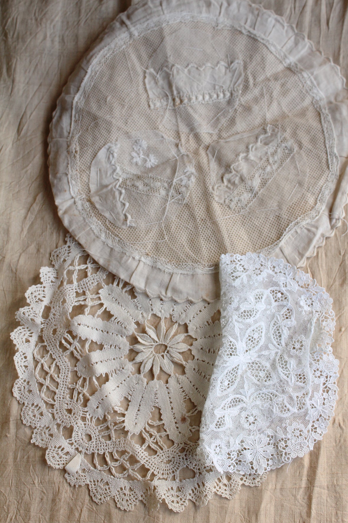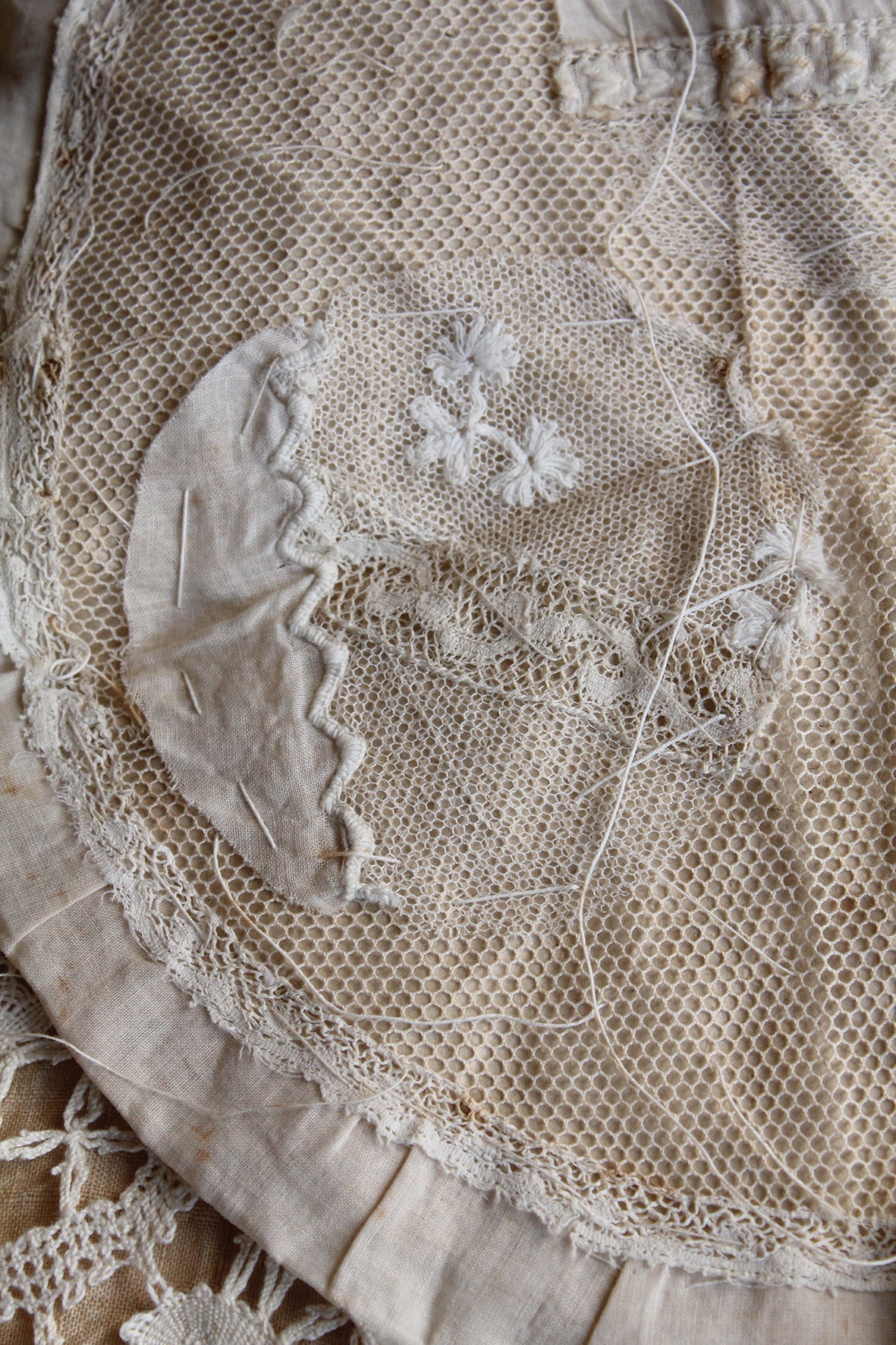 A delicate hand made French antique table mat, using the finest of lace details and just in the early stages of making, all tacked and placed on tissue ready to be stitched together. Just a lovely piece too as is.
