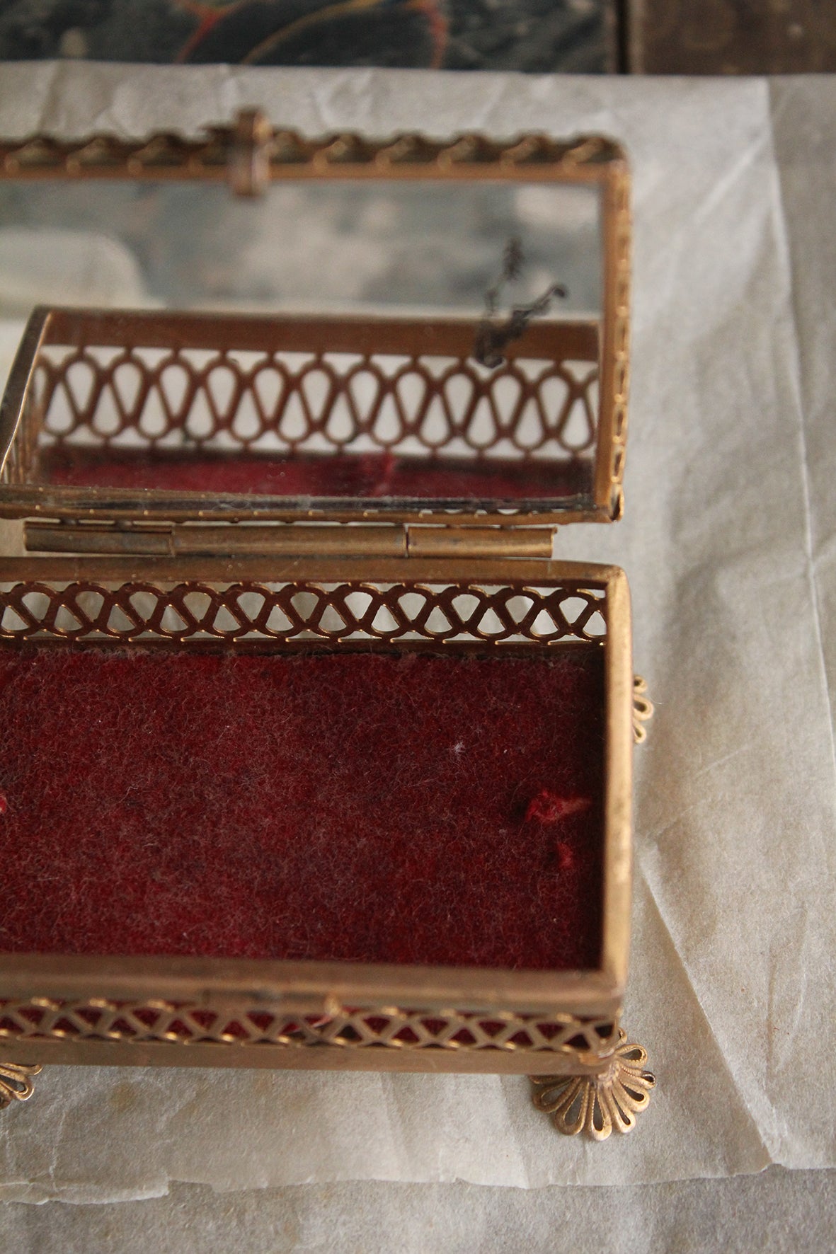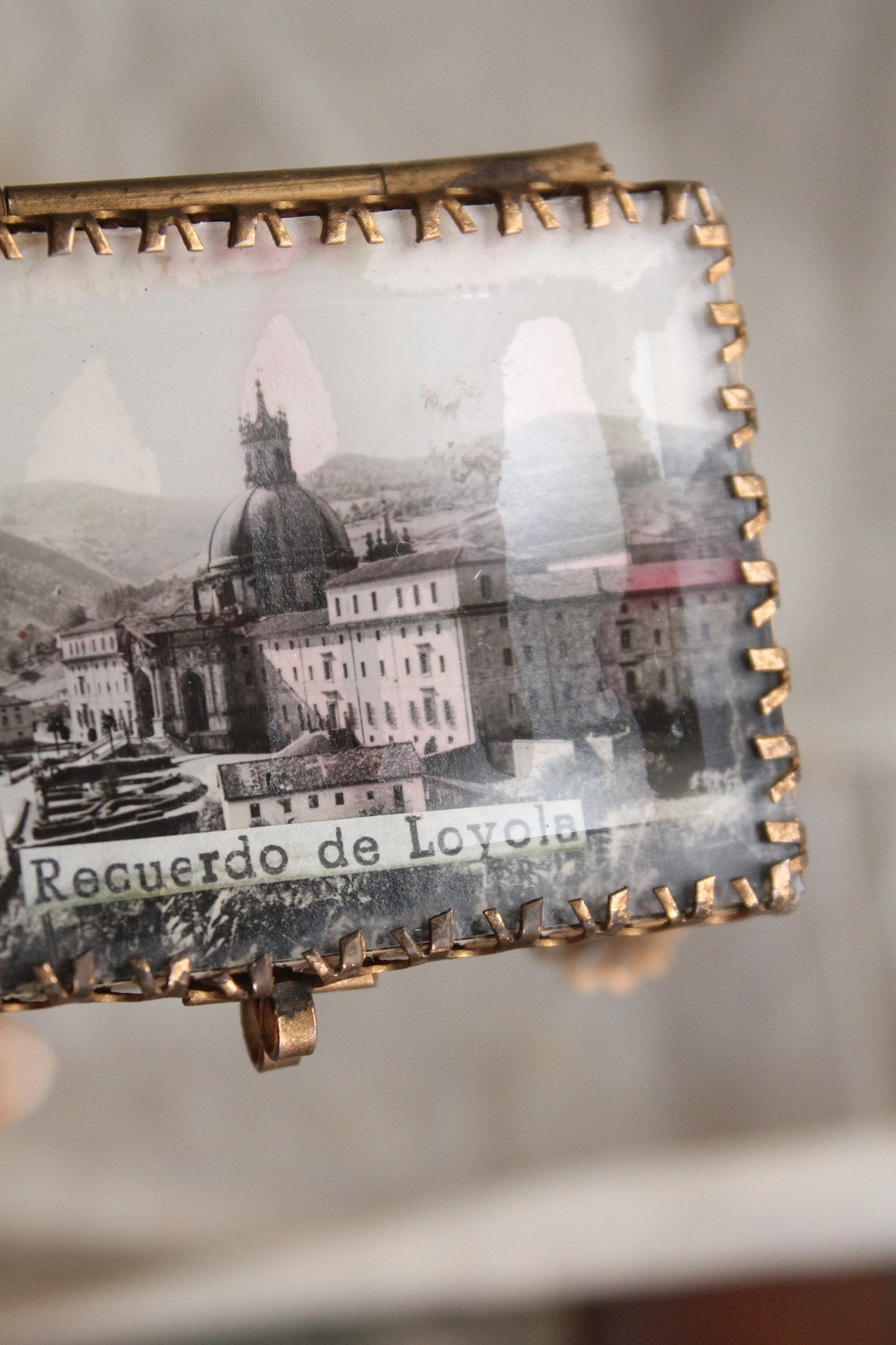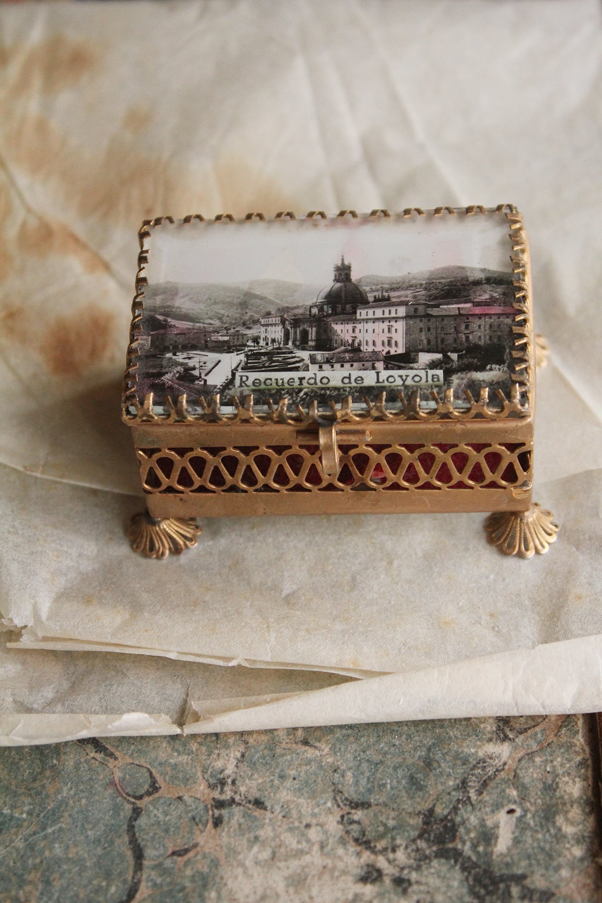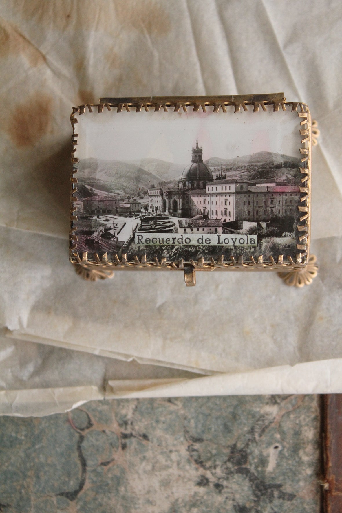 A lovely print titled Recuerdo de Lovola - Memory of Lovola is behind glass that is detailed with metal prongs/forks all around the edges. The inside is lined with a mirror and felt, there s also a mirror to the underside too which is unusual. What is also pretty is the detailed feet. I know these lovely souvenir boxes are collectable, so enjoy.