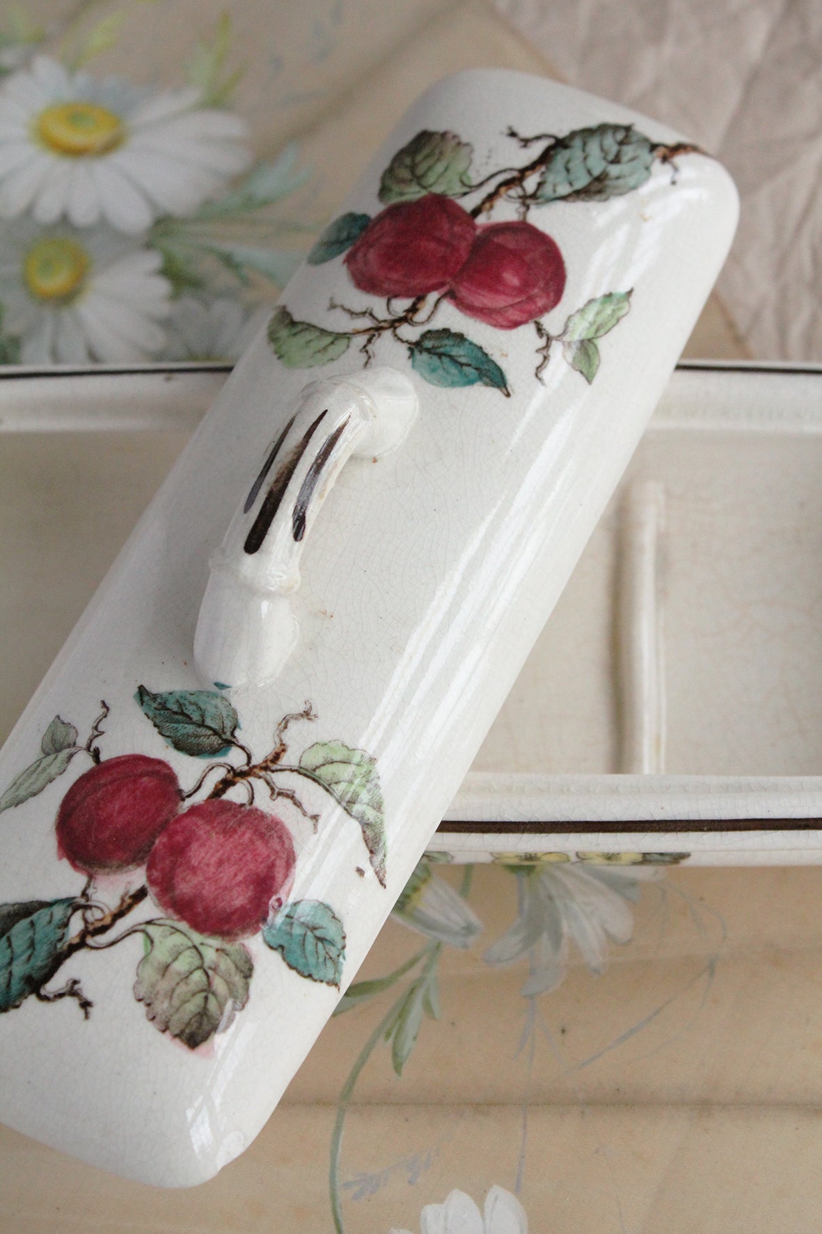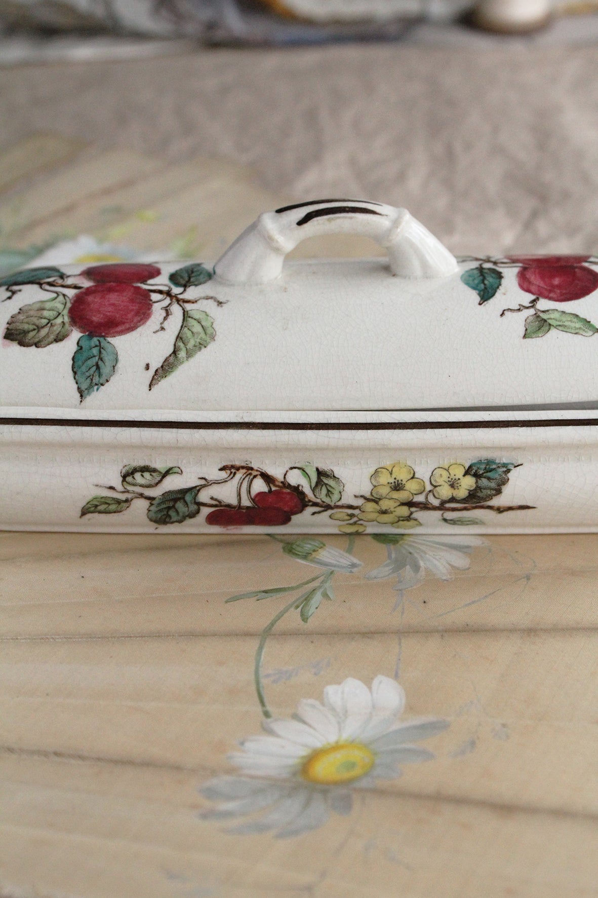 A wonderful old soap/toothbrush holder dish. Decorated with hand painted cherries to the lid and sides.