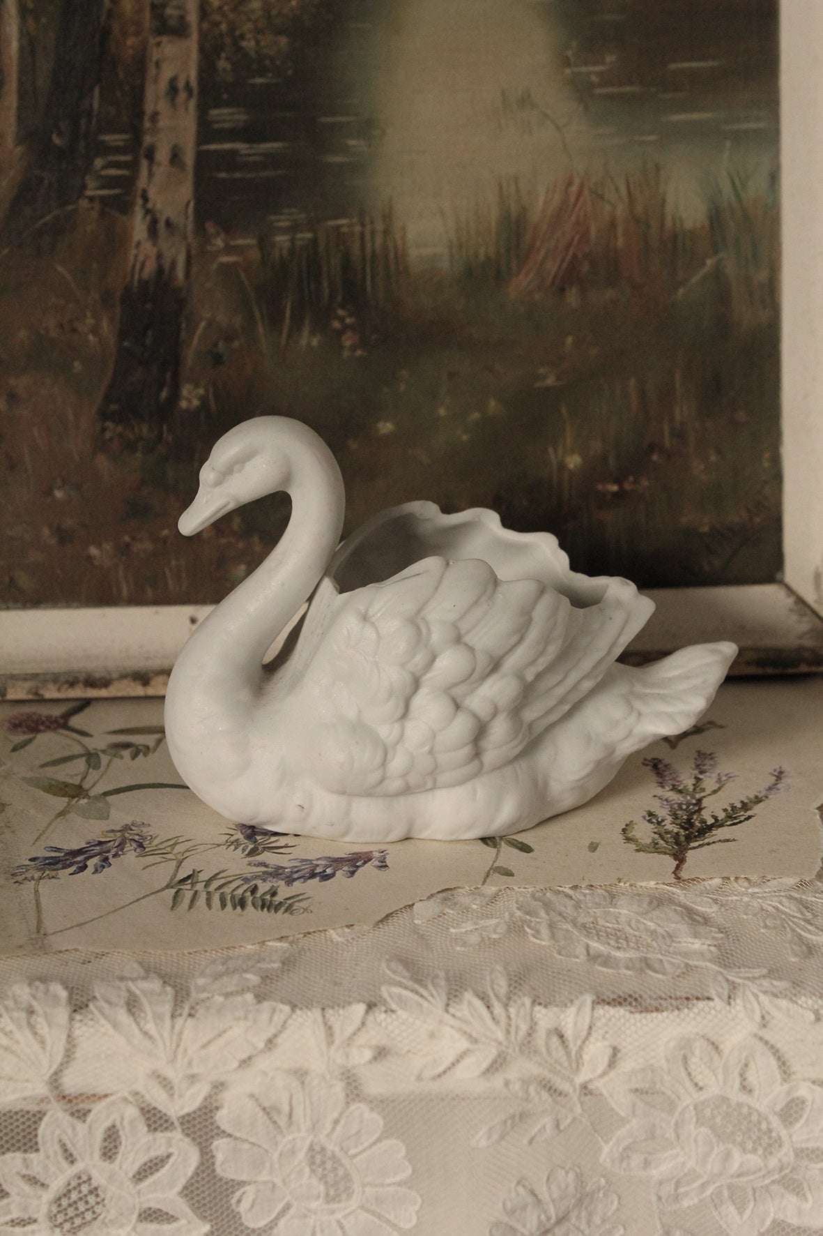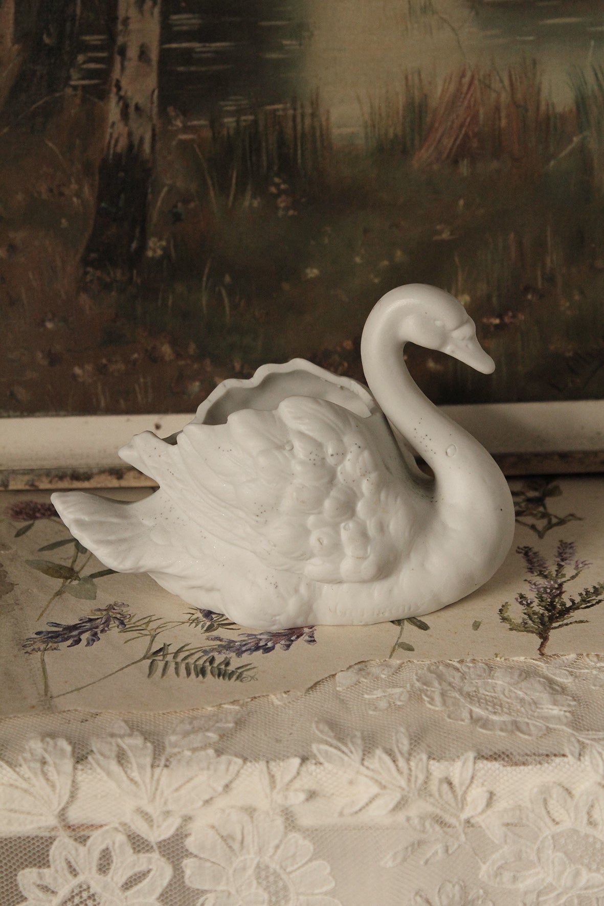 A beautiful old bisque swan that can be used as a simple ornament in a calm space in your home or as a vase.