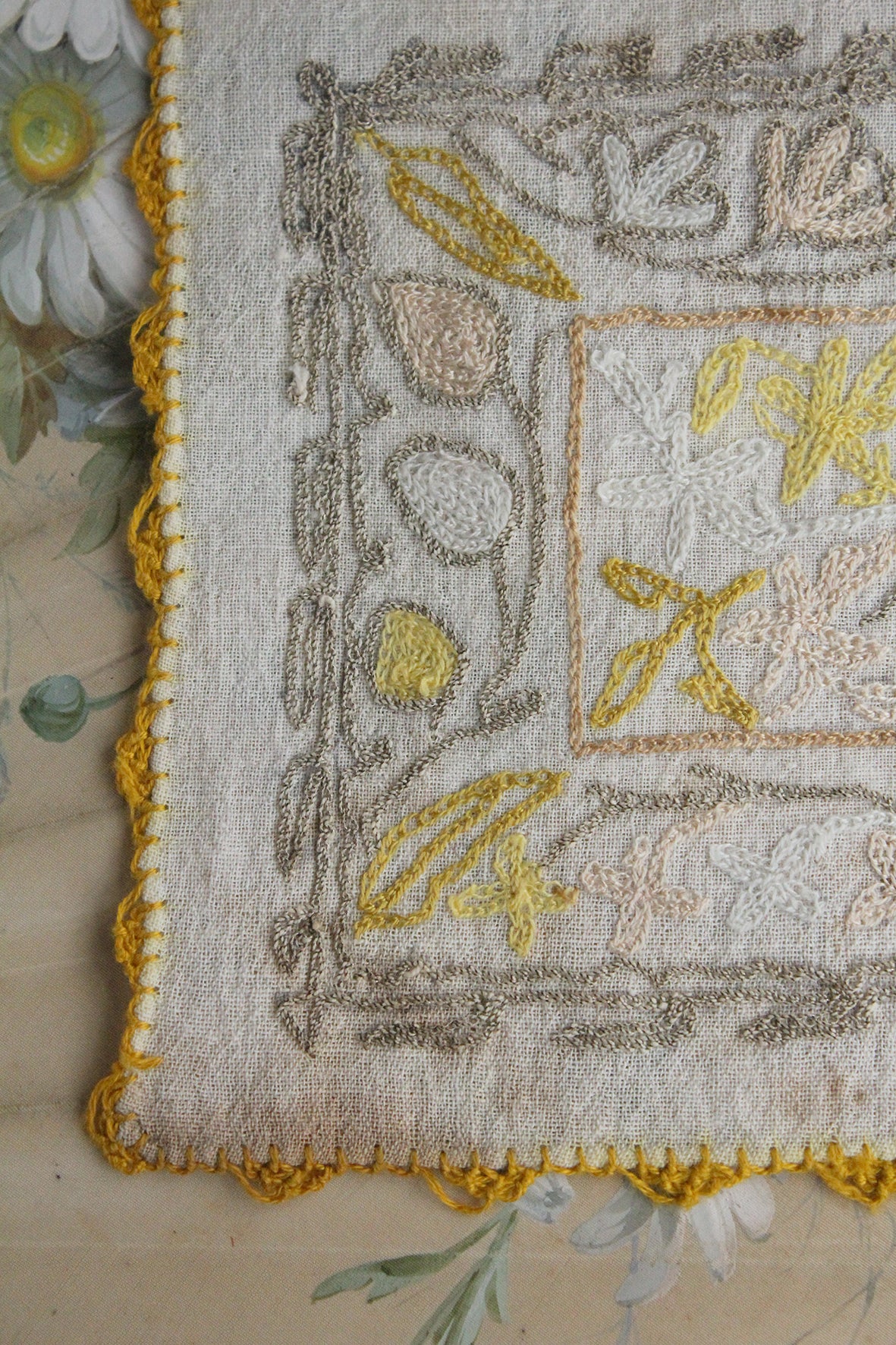 A beautiful old linen embroidered mat with whipped loop edging. The embroidery is a series of couched thread and chain stitches to form a sylised floral design.
