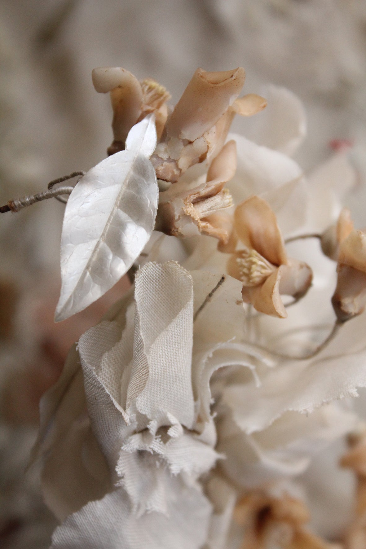 Measures 19.5cm in length and 10cm in width. There's a couple of wax flowers that have come away from the corsage and will arrive detached..
