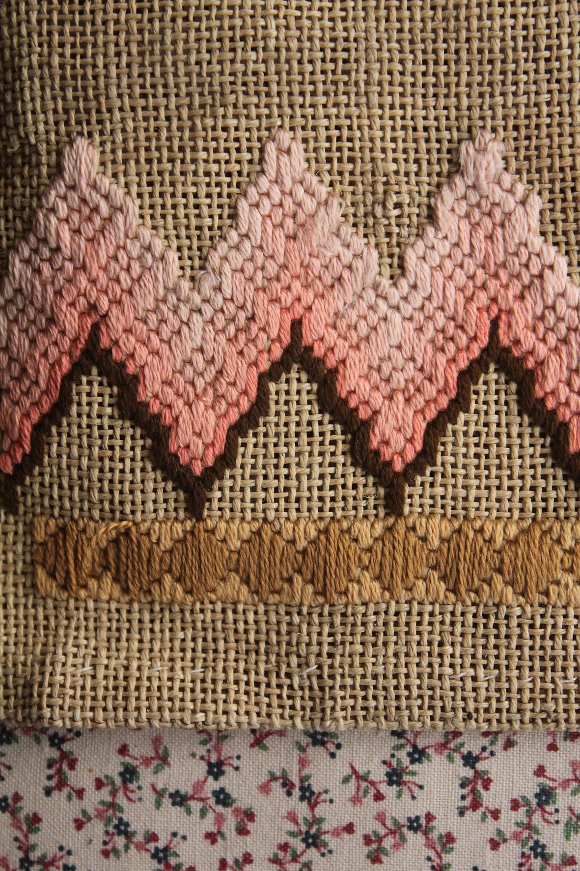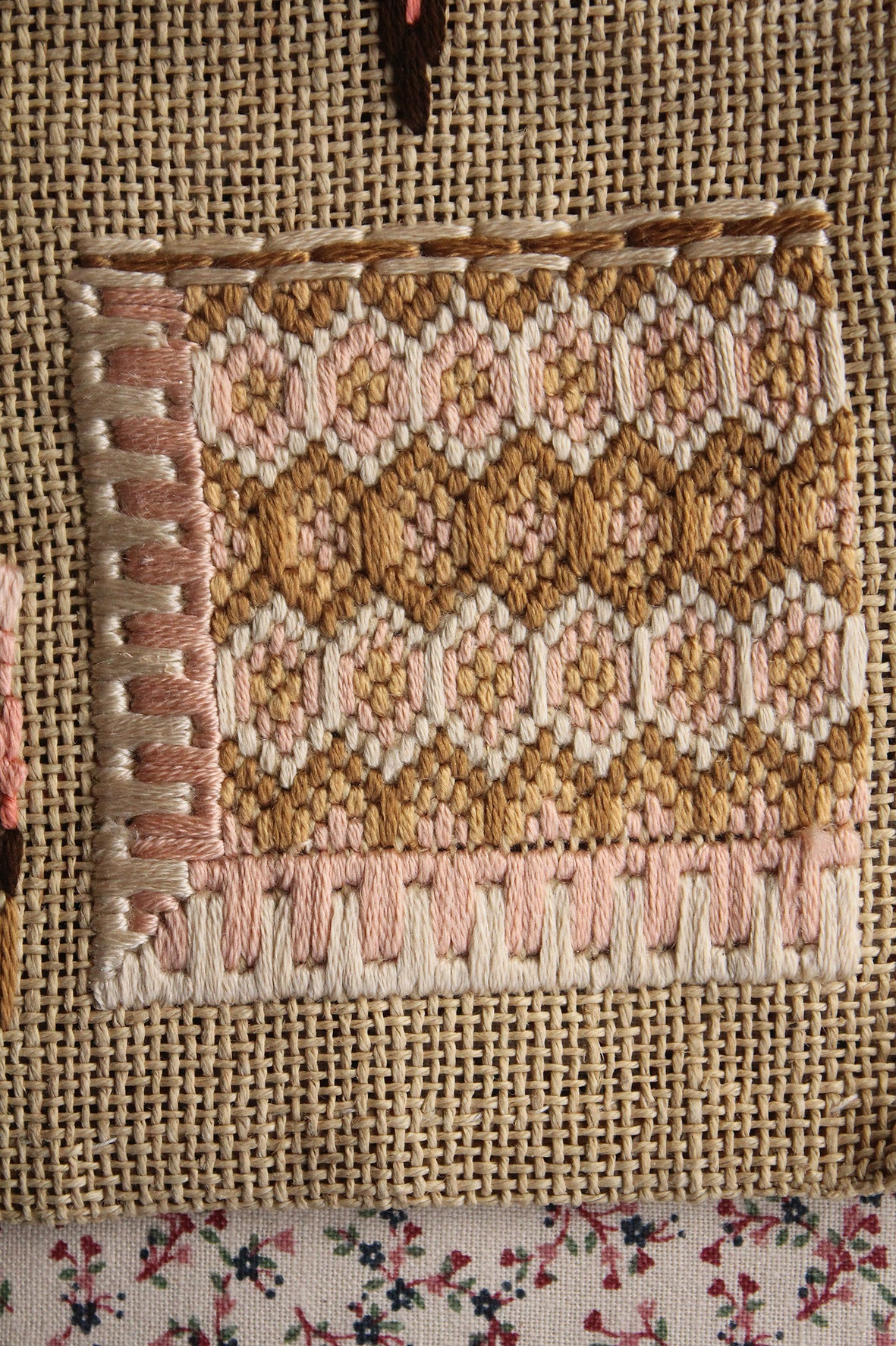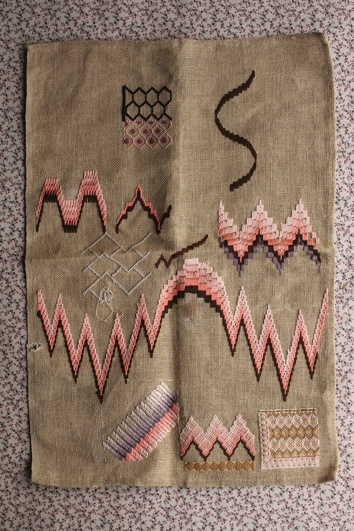 An exquisite sampler demonstrating beautiful Art Deco inspired needlework, mainly fire stitch explorations. A really lovely piece for the textile collector.