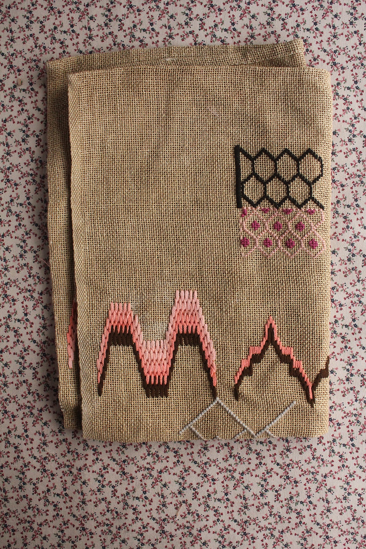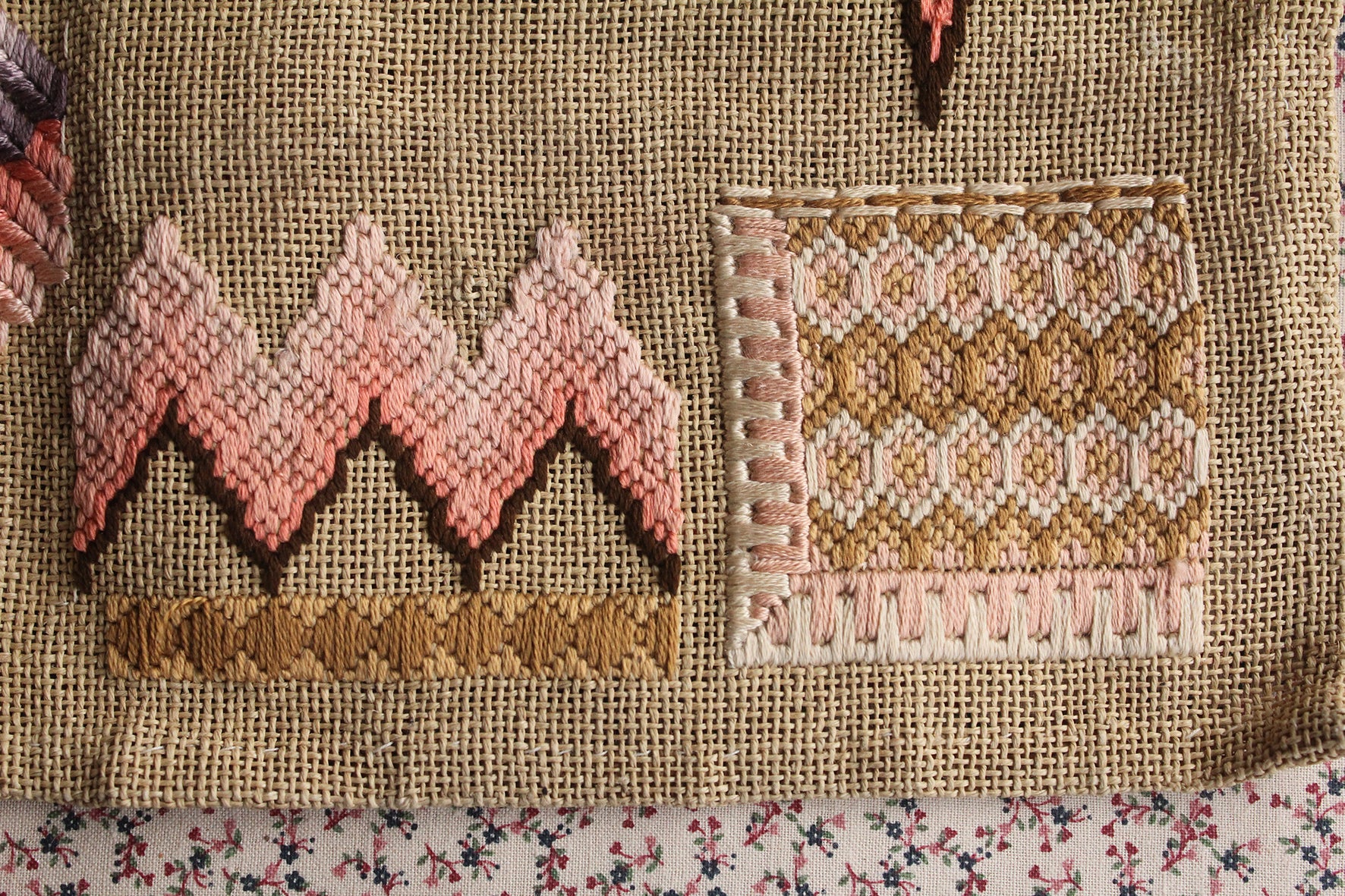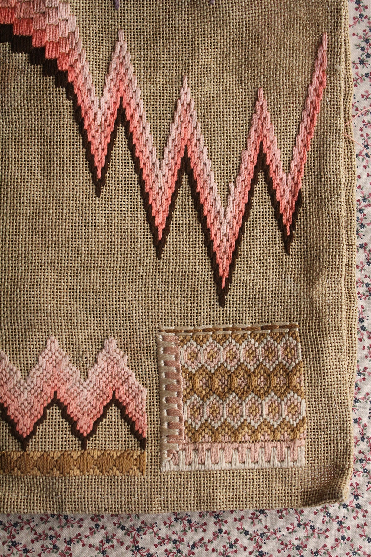 An exquisite sampler demonstrating beautiful Art Deco inspired needlework, mainly fire stitch explorations. A really lovely piece for the textile collector.