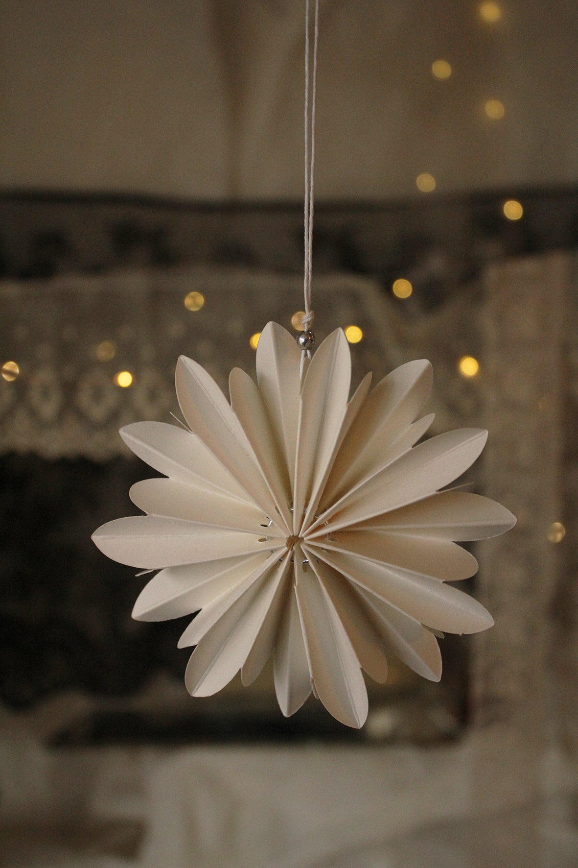 A lovely folded paper star style decoration with thread and small bead hanger.