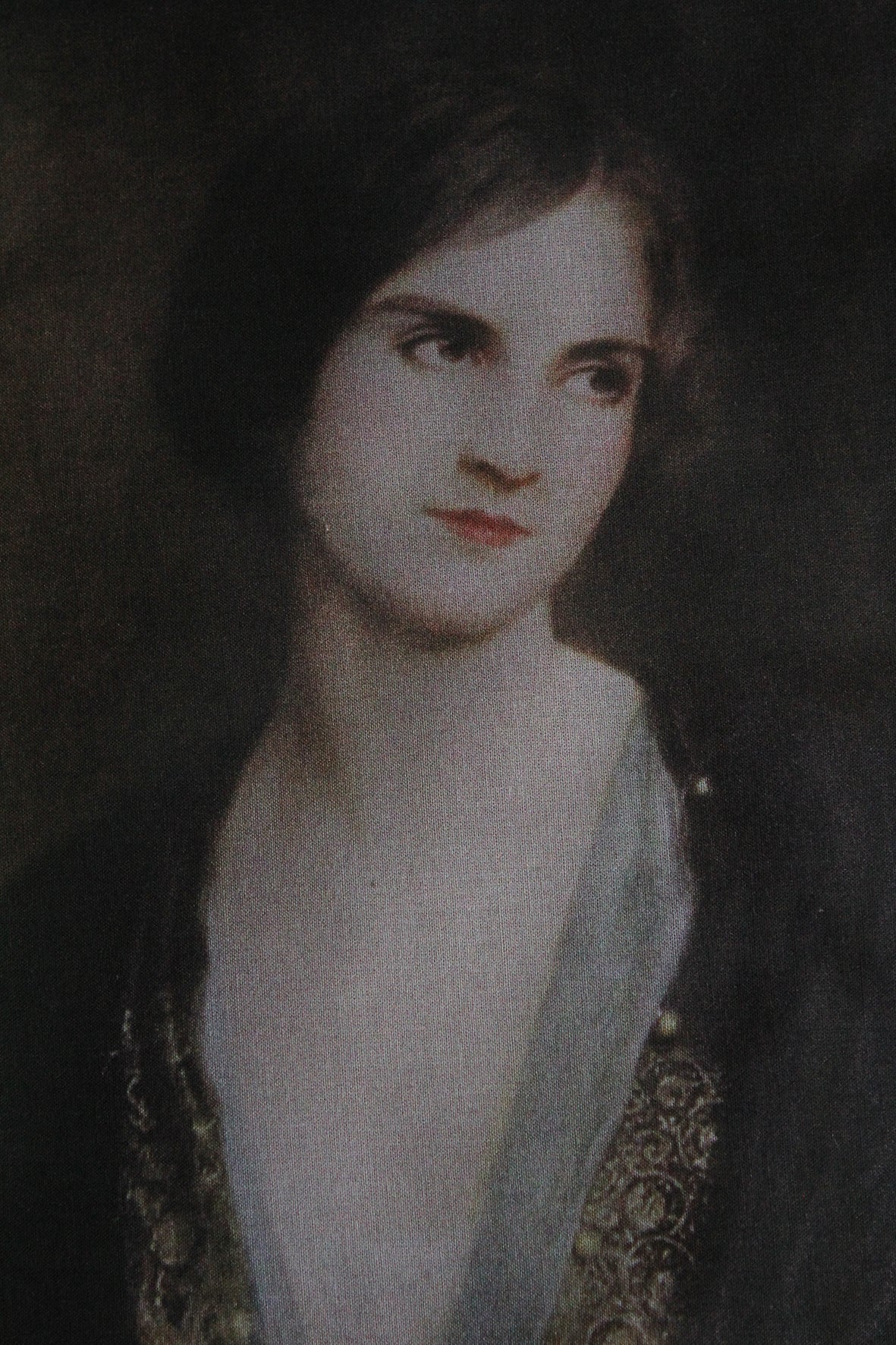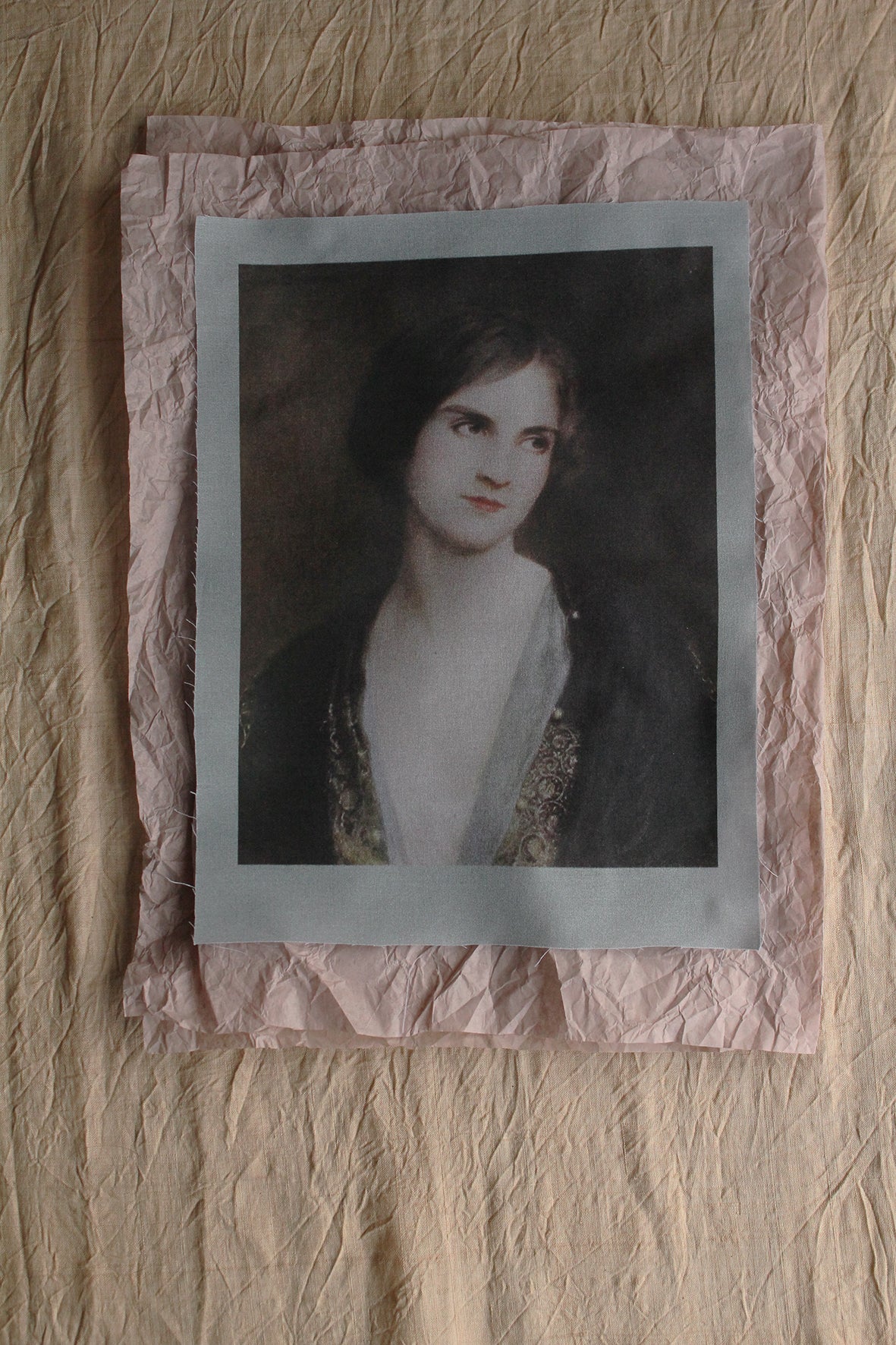 A lovely panel of cotton lawn that has been digitally printed with a delicate portrait taken from an old Edwardian postcard. I think it would be rather wonderful to hand embroider a design onto her coat and detailed dress just seen.