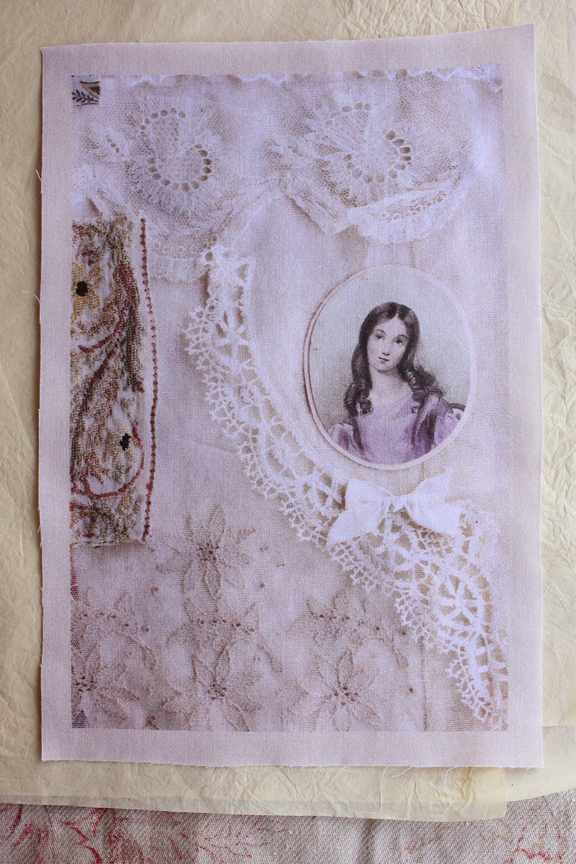 A lovely small panel of cotton lawn that has been digitally printed. The imagery is from a composition arranged here in the studio of antique lace, embroidery and a sweet portrait.