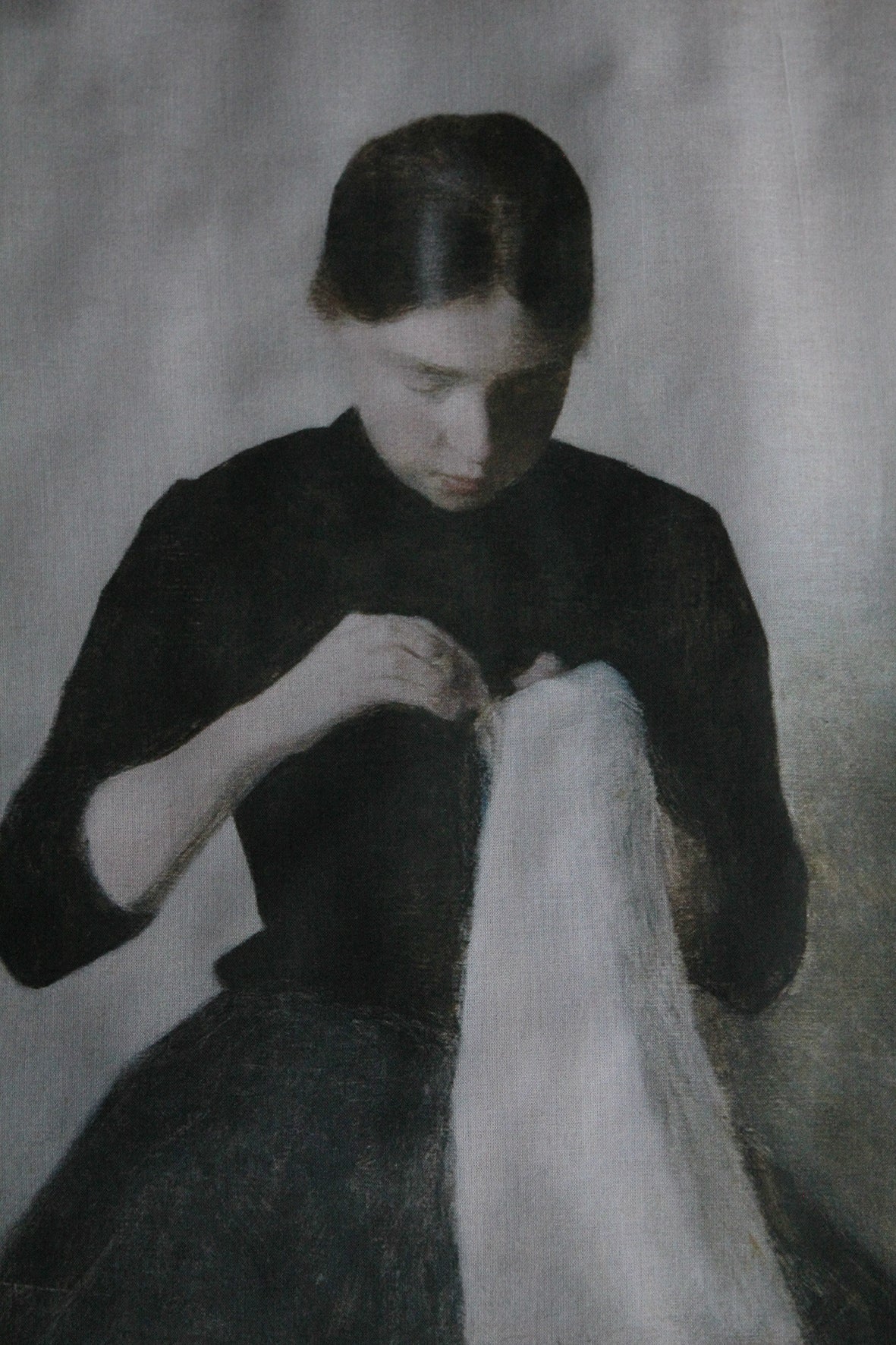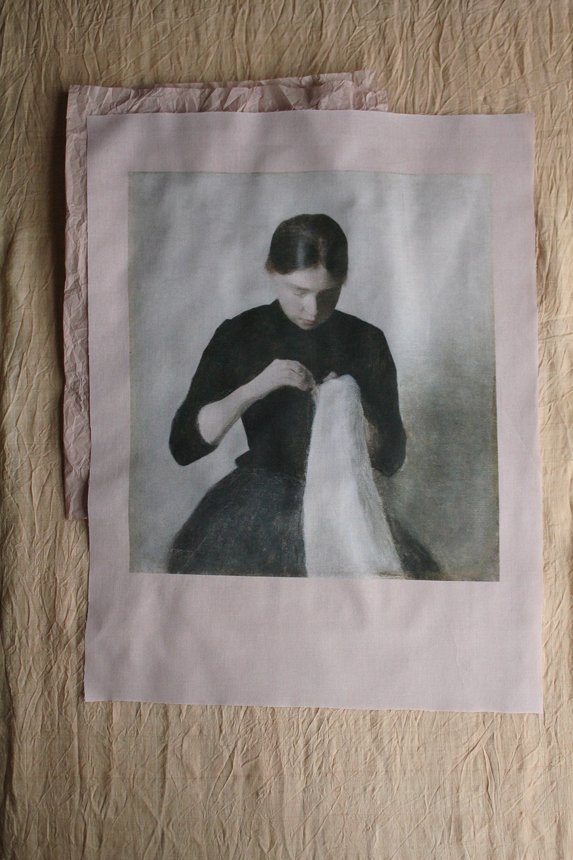 A lovely panel of cotton lawn that has been digitally printed with a delicate portrait taken from an old Edwardian postcard. I think it would be rather wonderful to hand embroider suggested work in white and pale tones to the fabric draping and allow to carry on to the pale pink border.