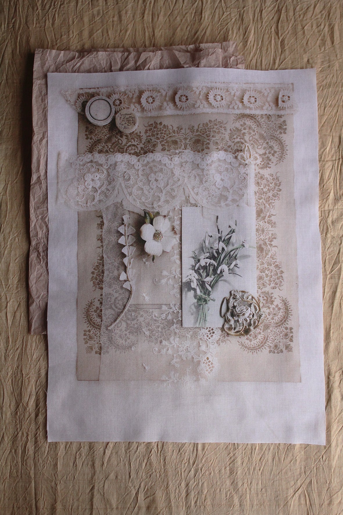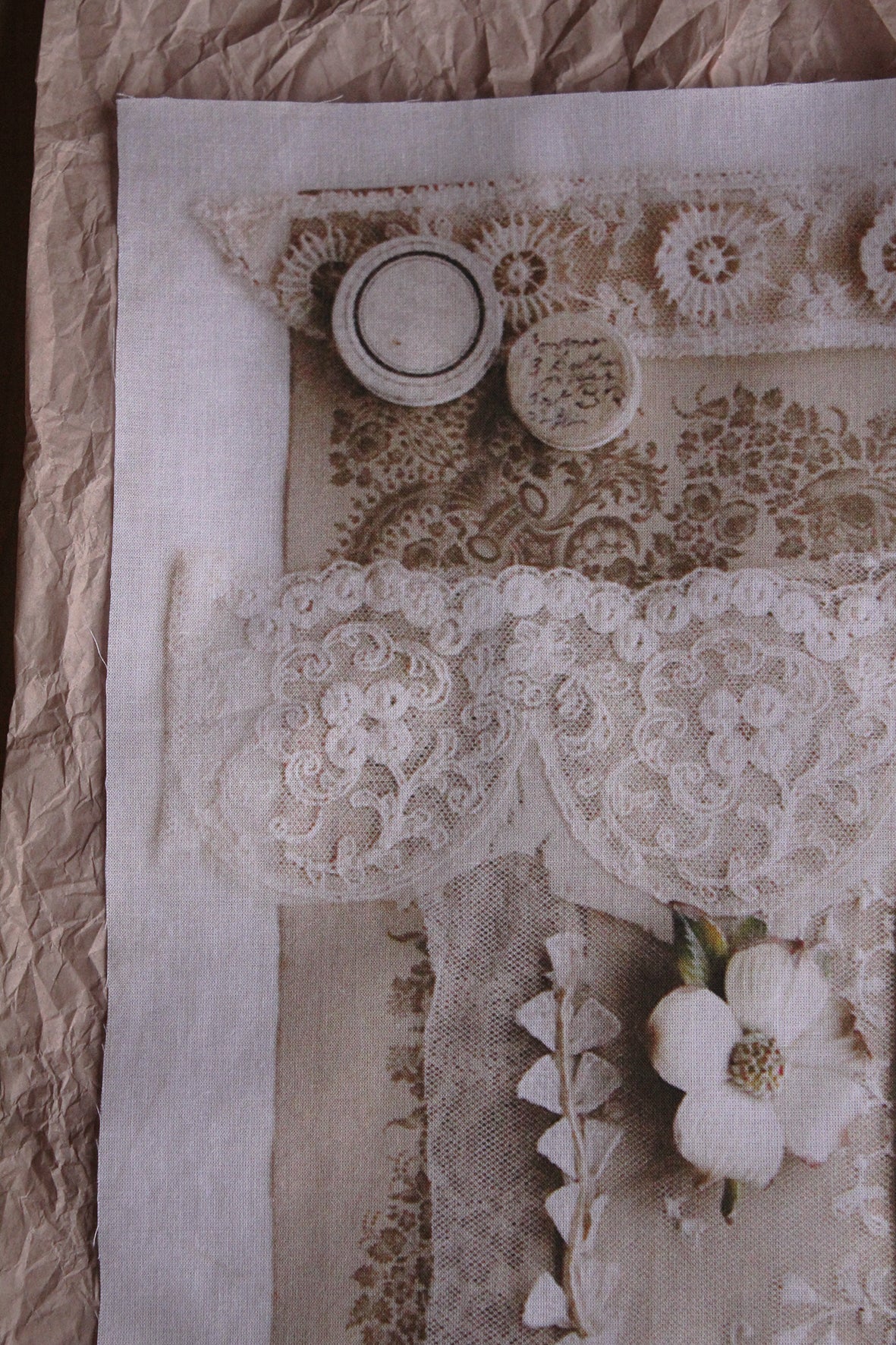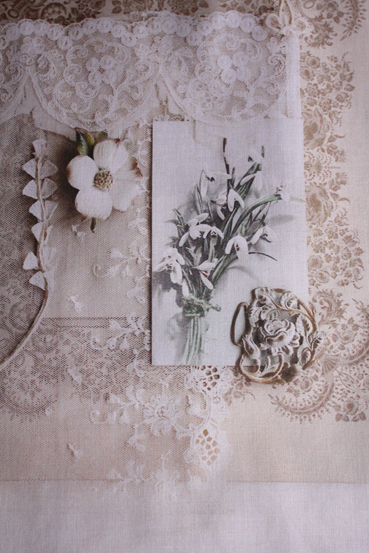 A lovely large panel of cotton lawn that has been digitally printed. The imagery has been taken from a photograph from a past Shop Window flat lay. Gorgeous details of old found items to inspire. I have always wanted to do this myself, where I have my photographs printed and then work into them with applique and embroidery. I hope you love the idea too.