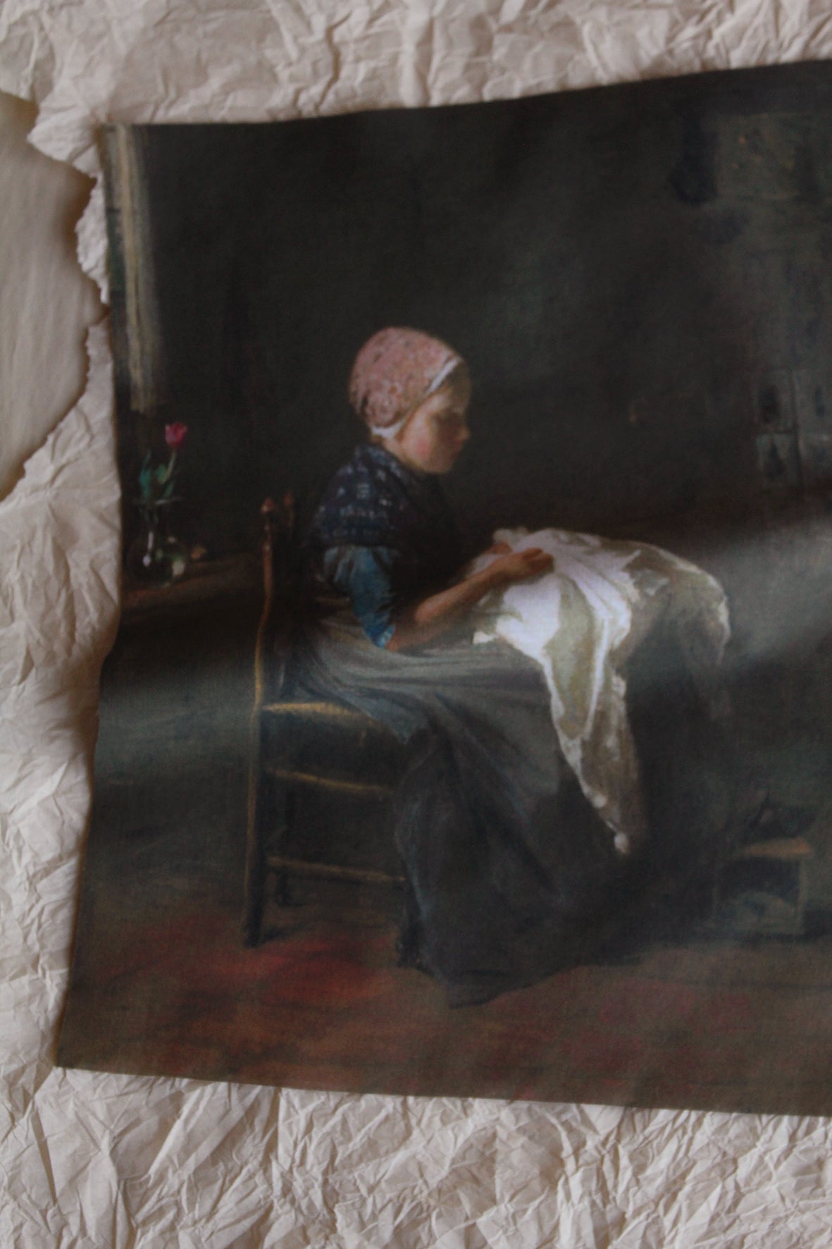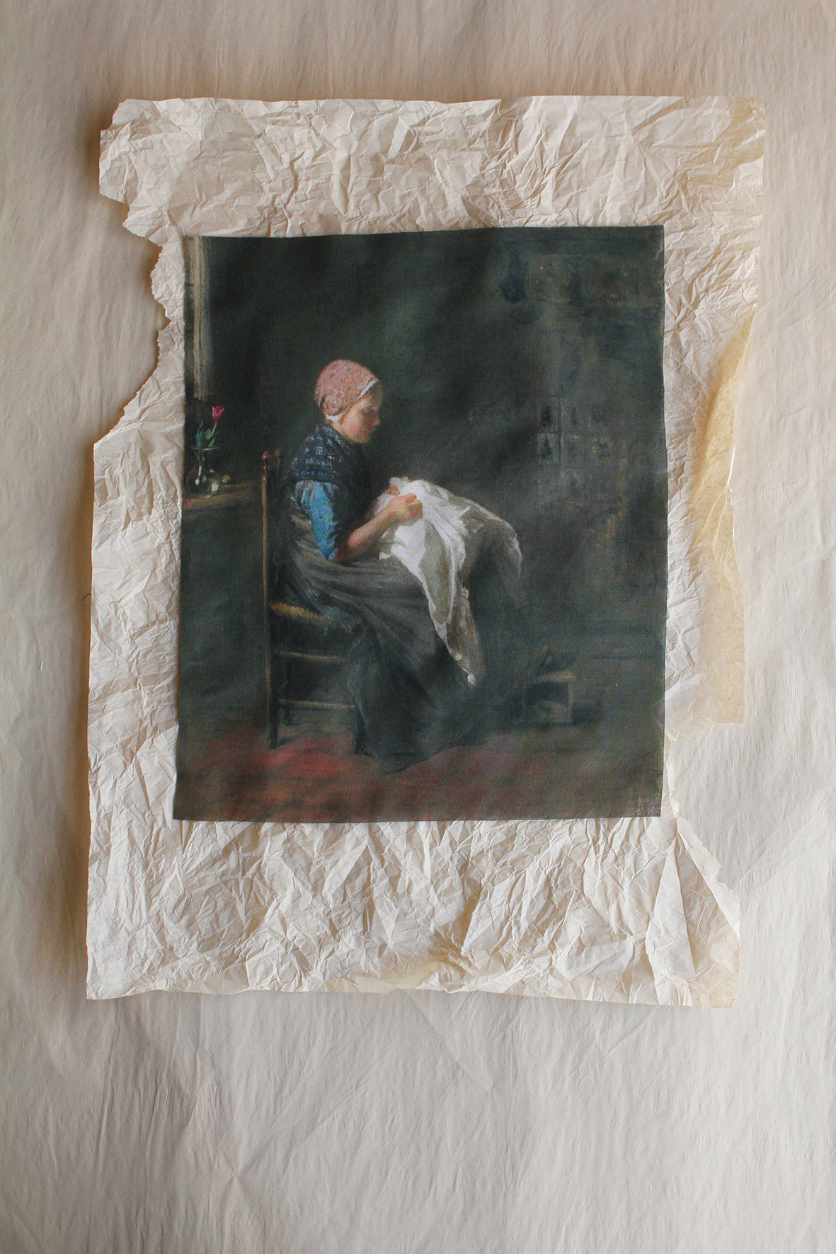 A lovely panel of cotton lawn that is a digitally printed reproduction of the painting titled The Little Seamstress by Jozef Israëls, 1850 - 1888.