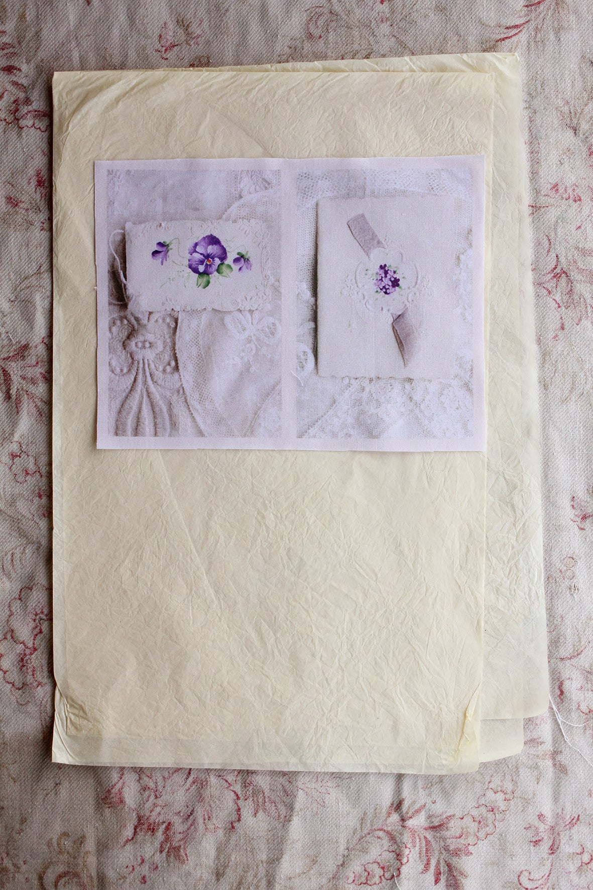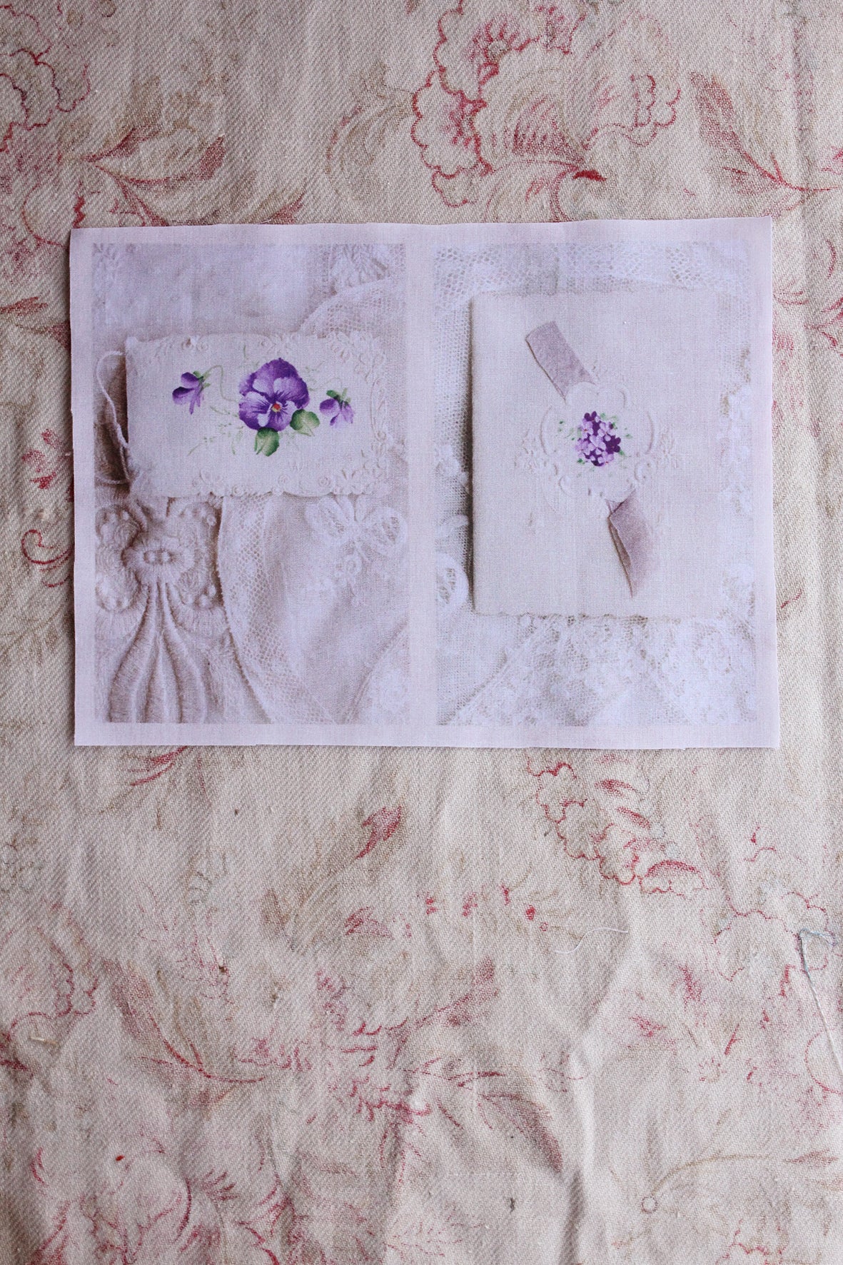 A lovely small panel of cotton lawn that has been digitally printed. The imagery is from studio photographs of old hand painted Victorian greetings cards.