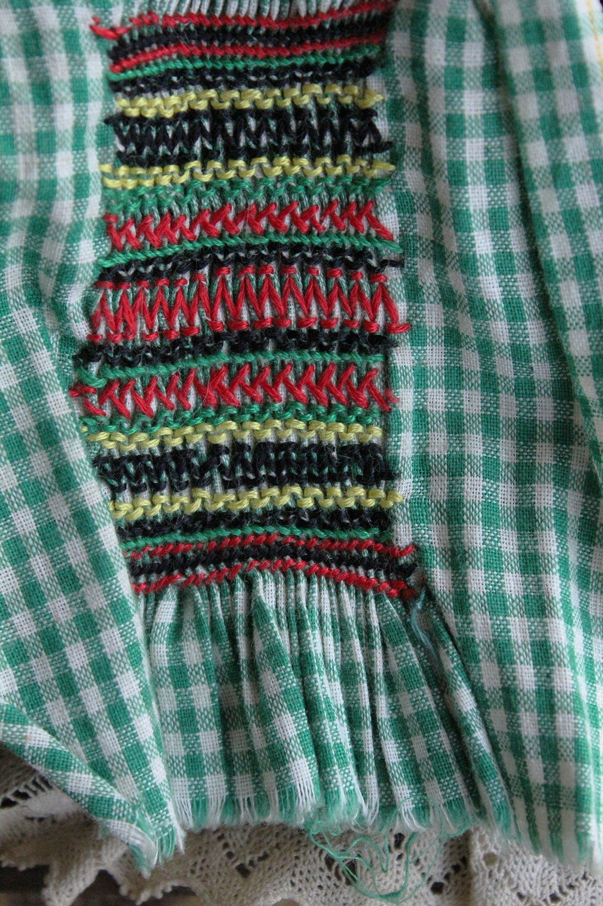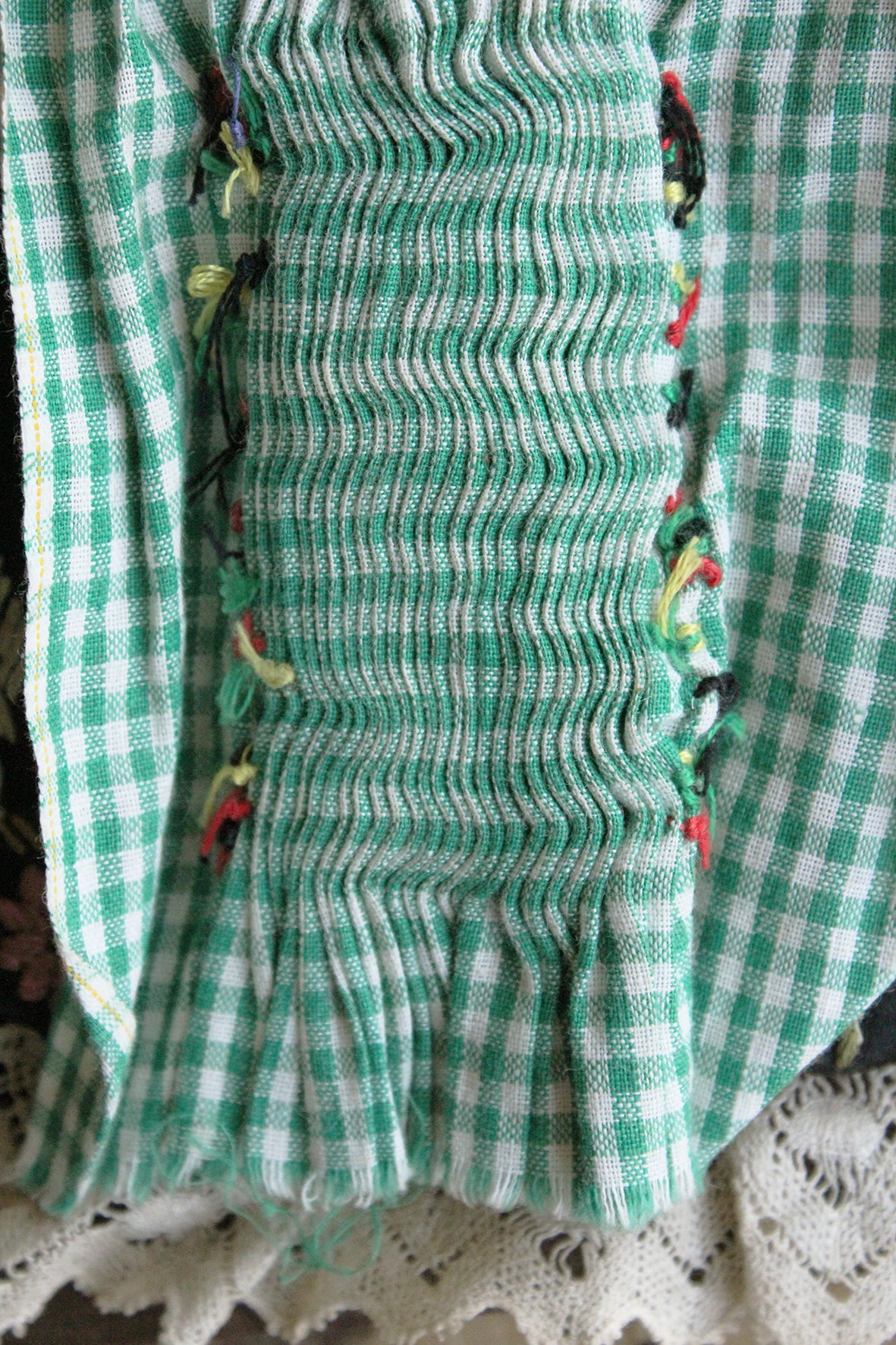 Smocked pleats that have been woven and embroidered with stitches on a gingham ground.