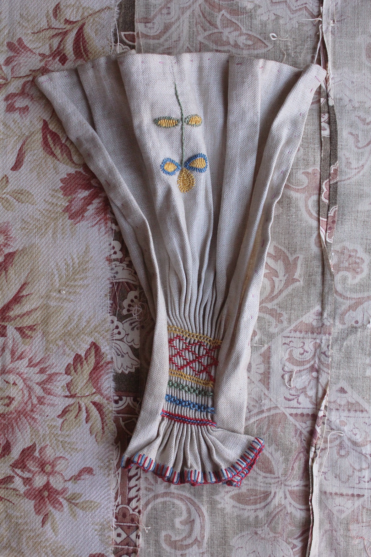 Smocked pleats that have been woven and embroidered with stitches on a linen ground with a sweet little embroidered motif to the top.