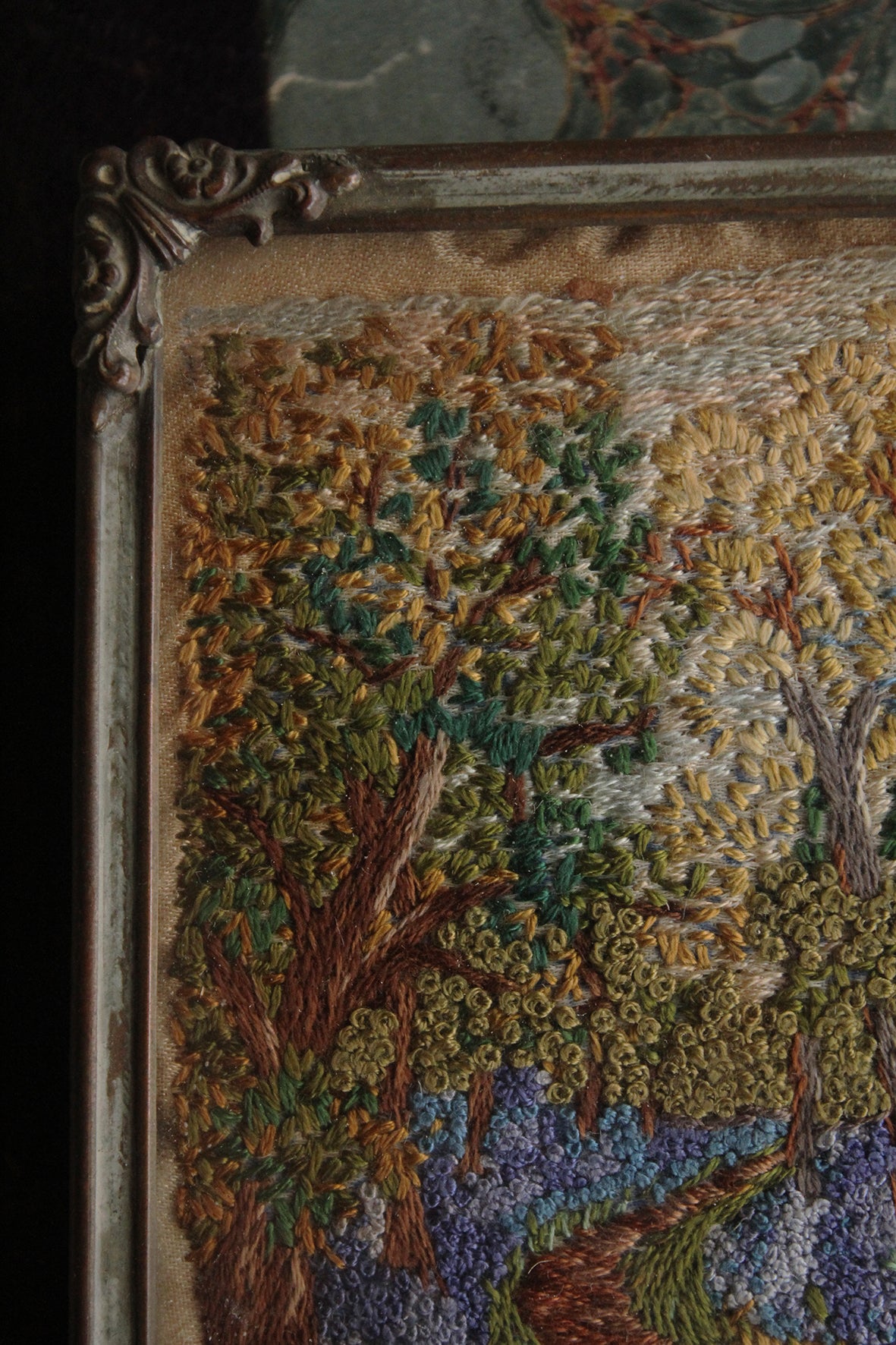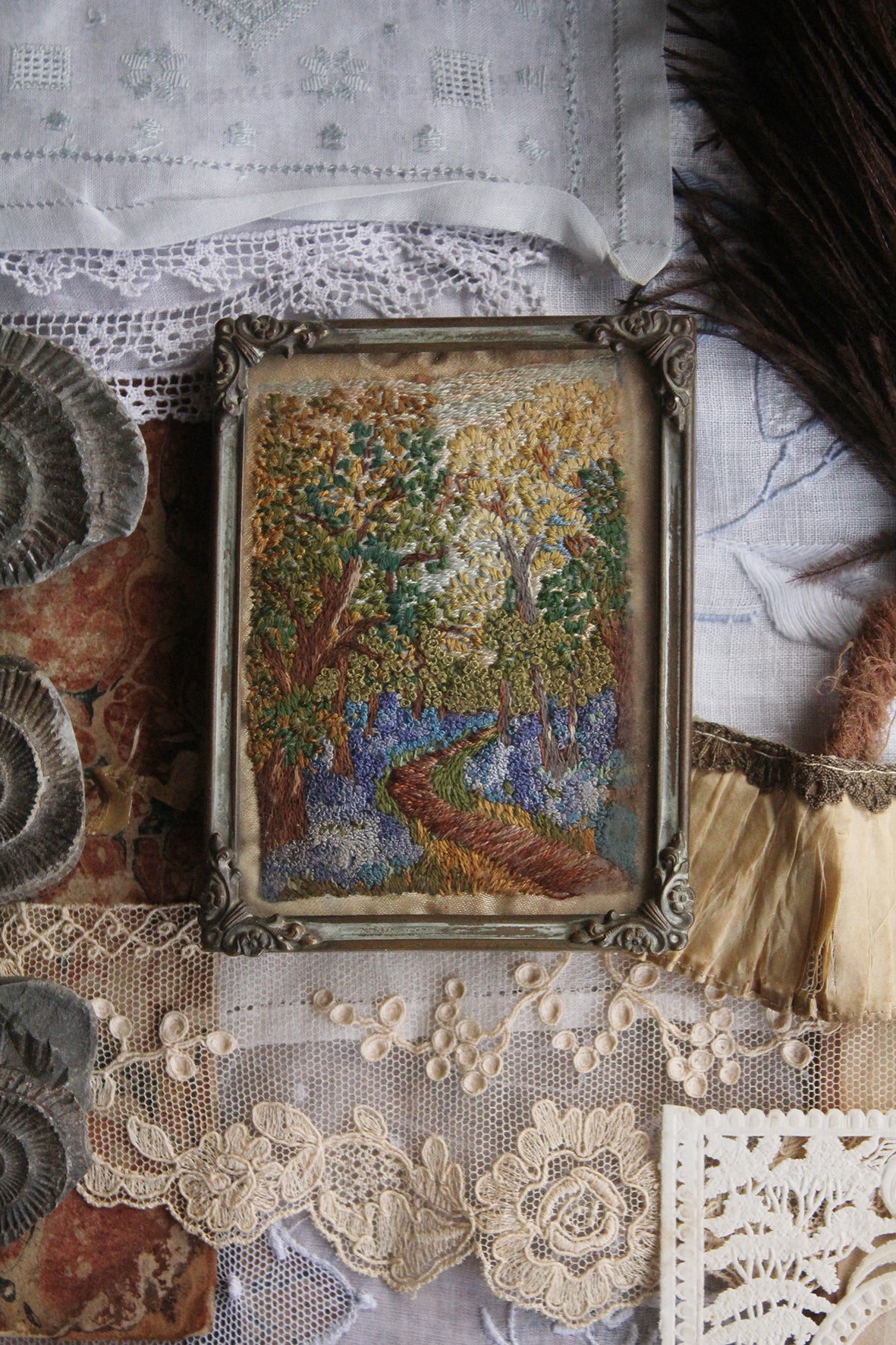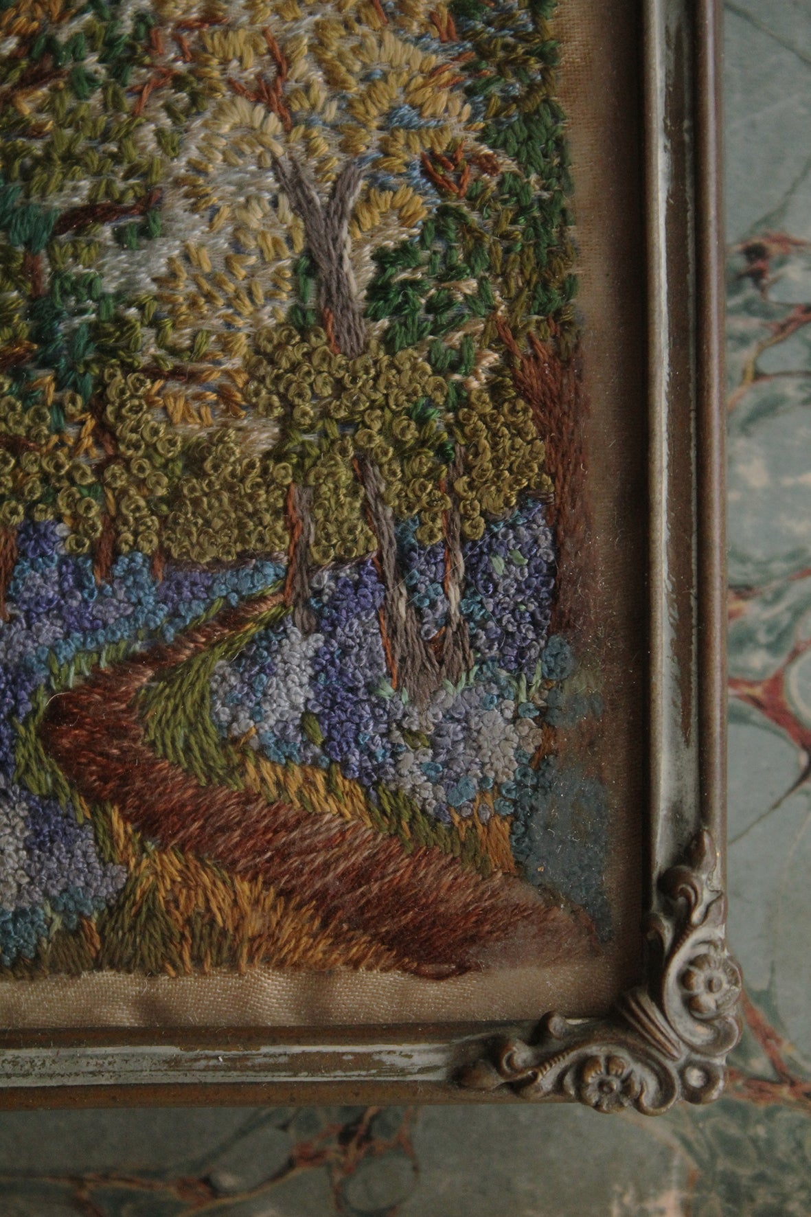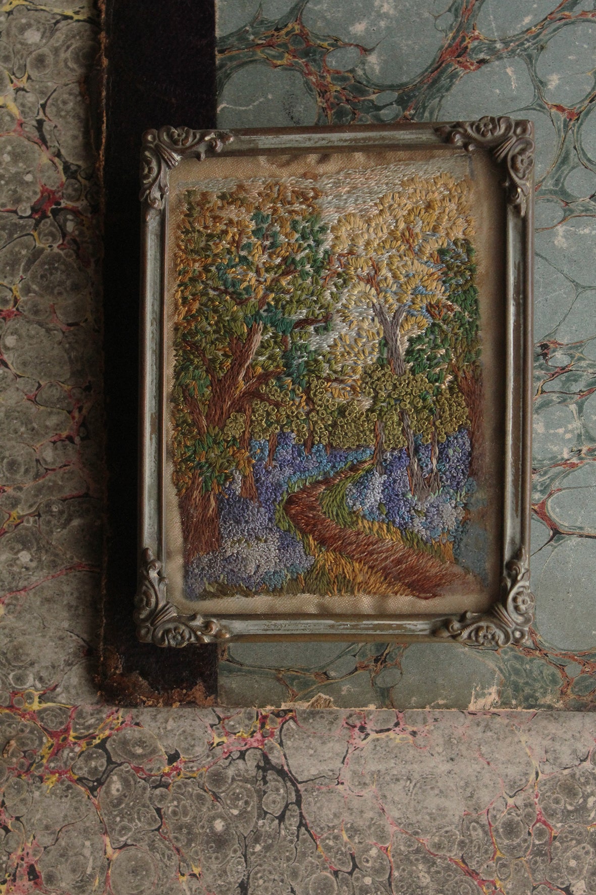 An exquisite hand embroidered framed miniature. Constructed with the tiniest seed stitches and French knots. The scene is a tree lined path through a wood detailing a carpet of bluebells. All silk in a cast metal frame with ornate floral corners. There is a stand to the reverse that is still structurally sound so you can rest on a mantle or as part of a still life on a shelf.